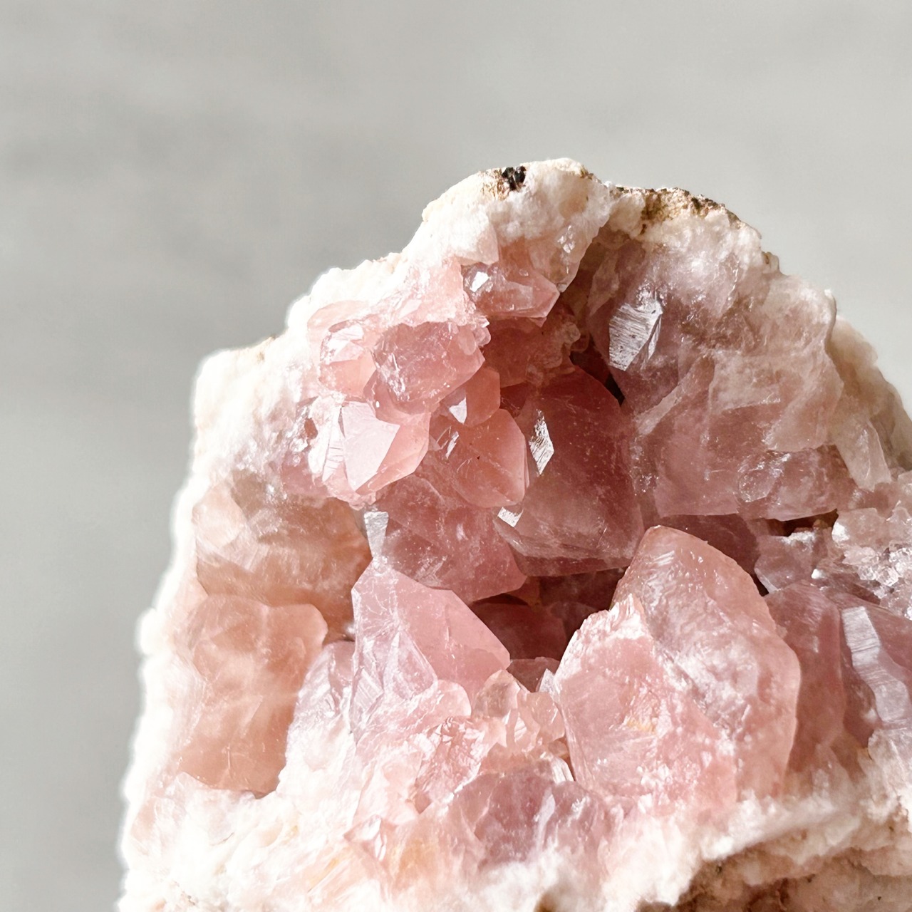 コーラルピンクの結晶がキラキラ輝くピンクアメジストジオード。母岩が真っ白で可愛いです。
