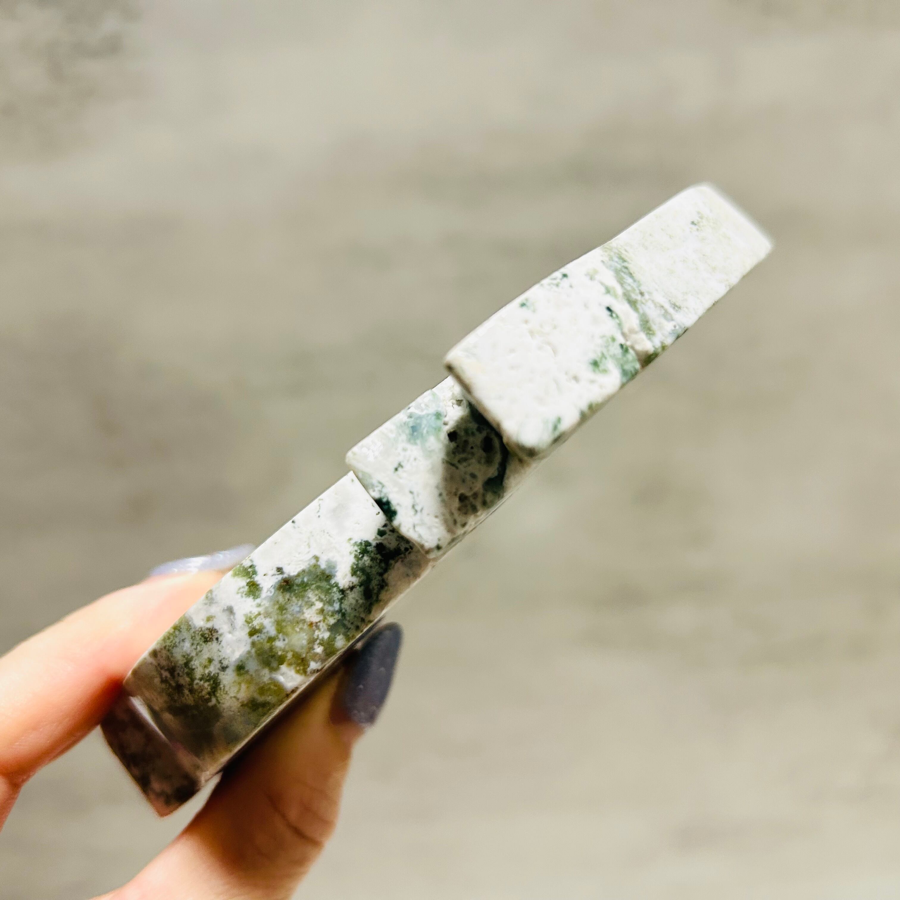 ツリーアゲートは、白い地色に緑色の樹木のような模様が入った、アゲート(瑪瑙)の一種です。優しいエネルギーを持ち、精神を安定させ、人間関係を円滑にすると言われています。また、ビジネスの成功や金運、健康運を高める効果もあるとされています。