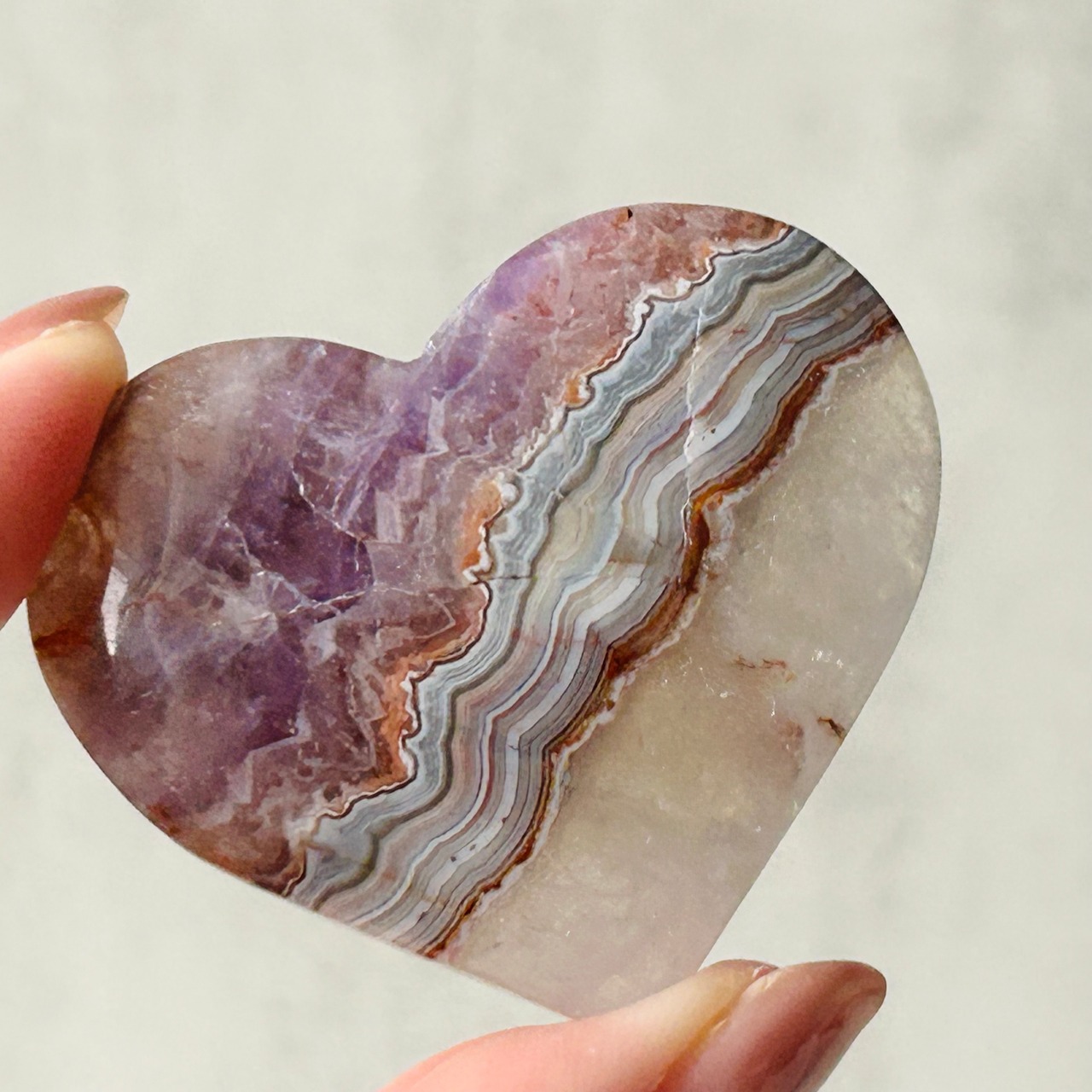 メキシカンクレイジーレースアゲートとアメジストが共生するパームストーン。個性的な模様と色味が可愛いです。
