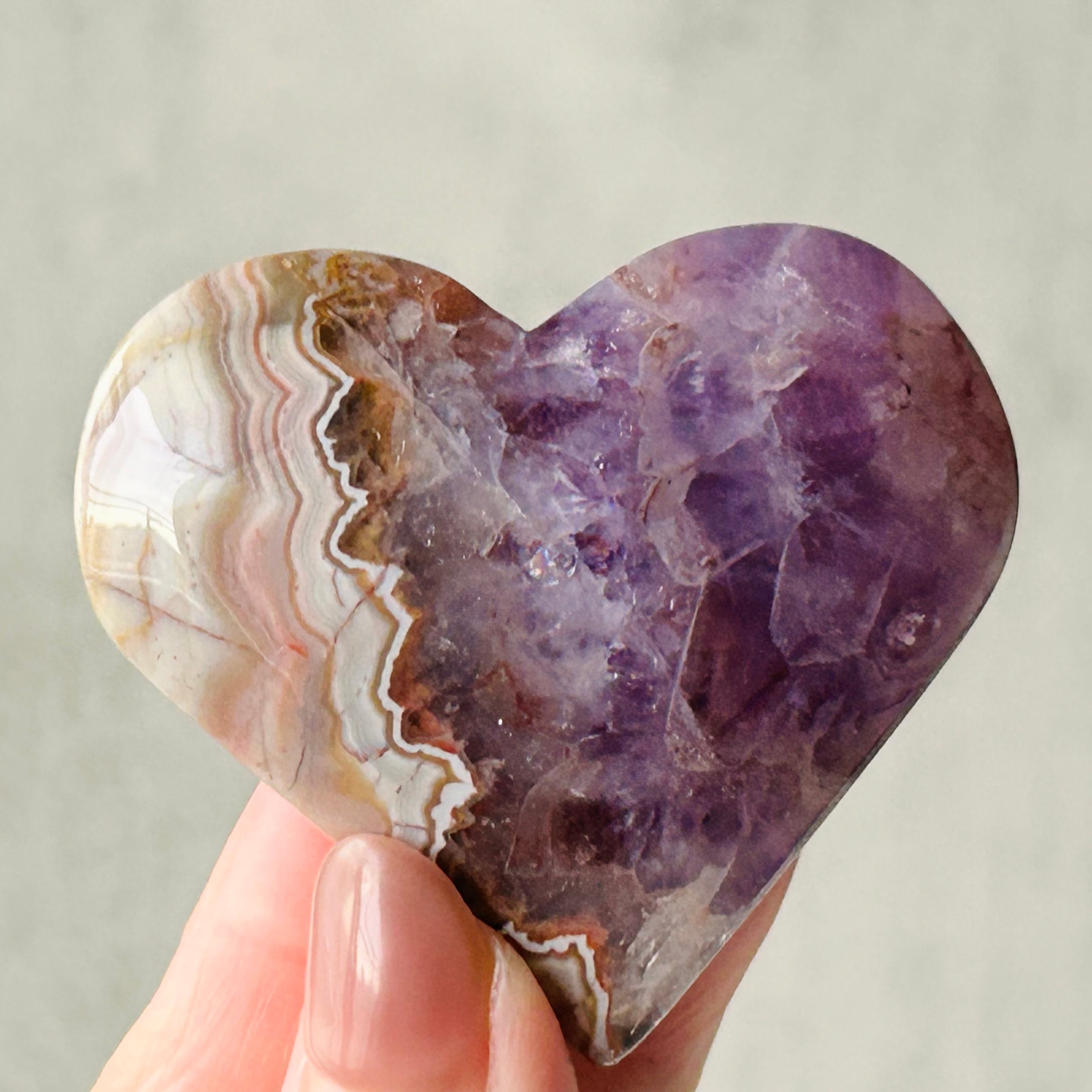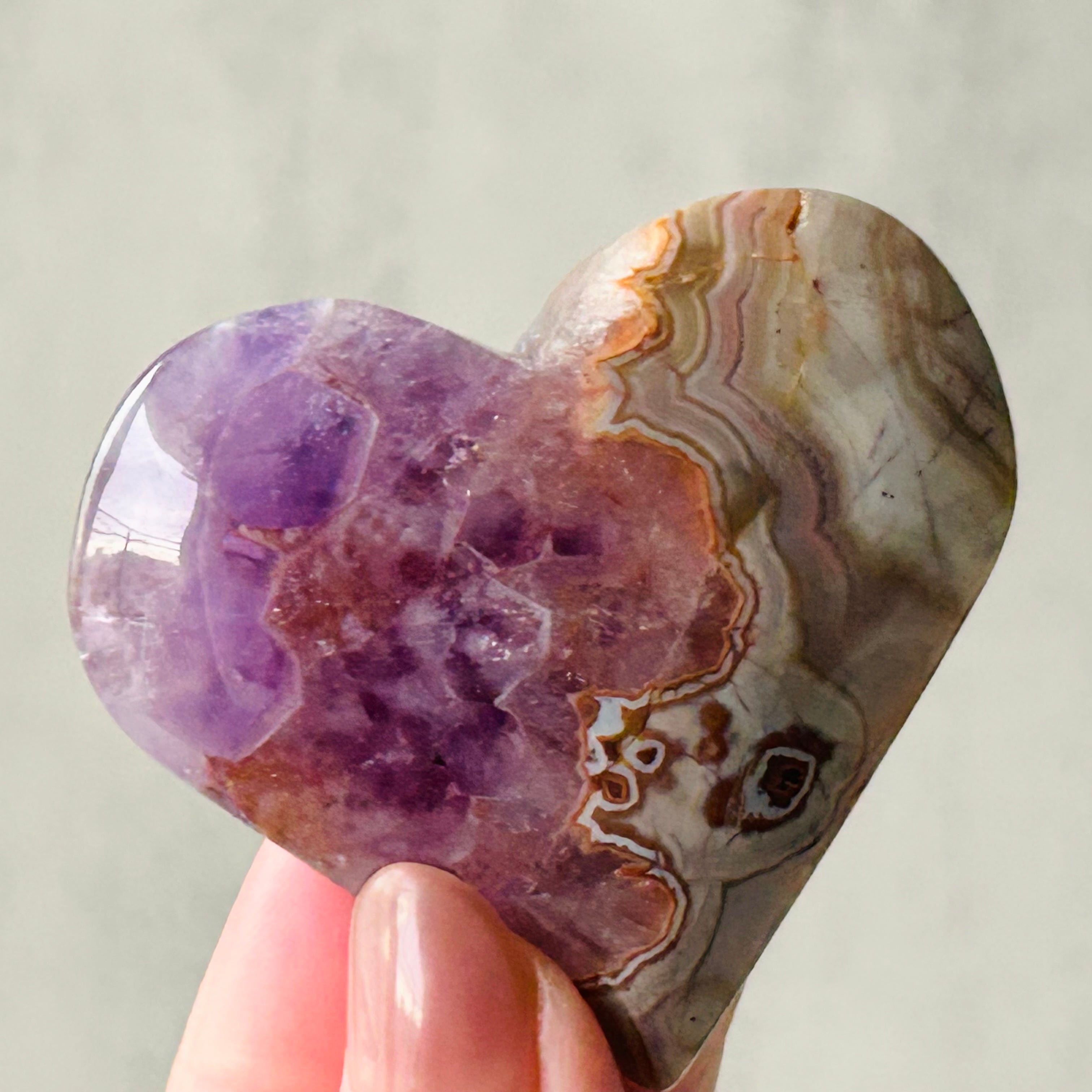 メキシカンクレイジーレースアゲートとアメジストが共生するパームストーン。個性的な模様と色味が可愛いです。