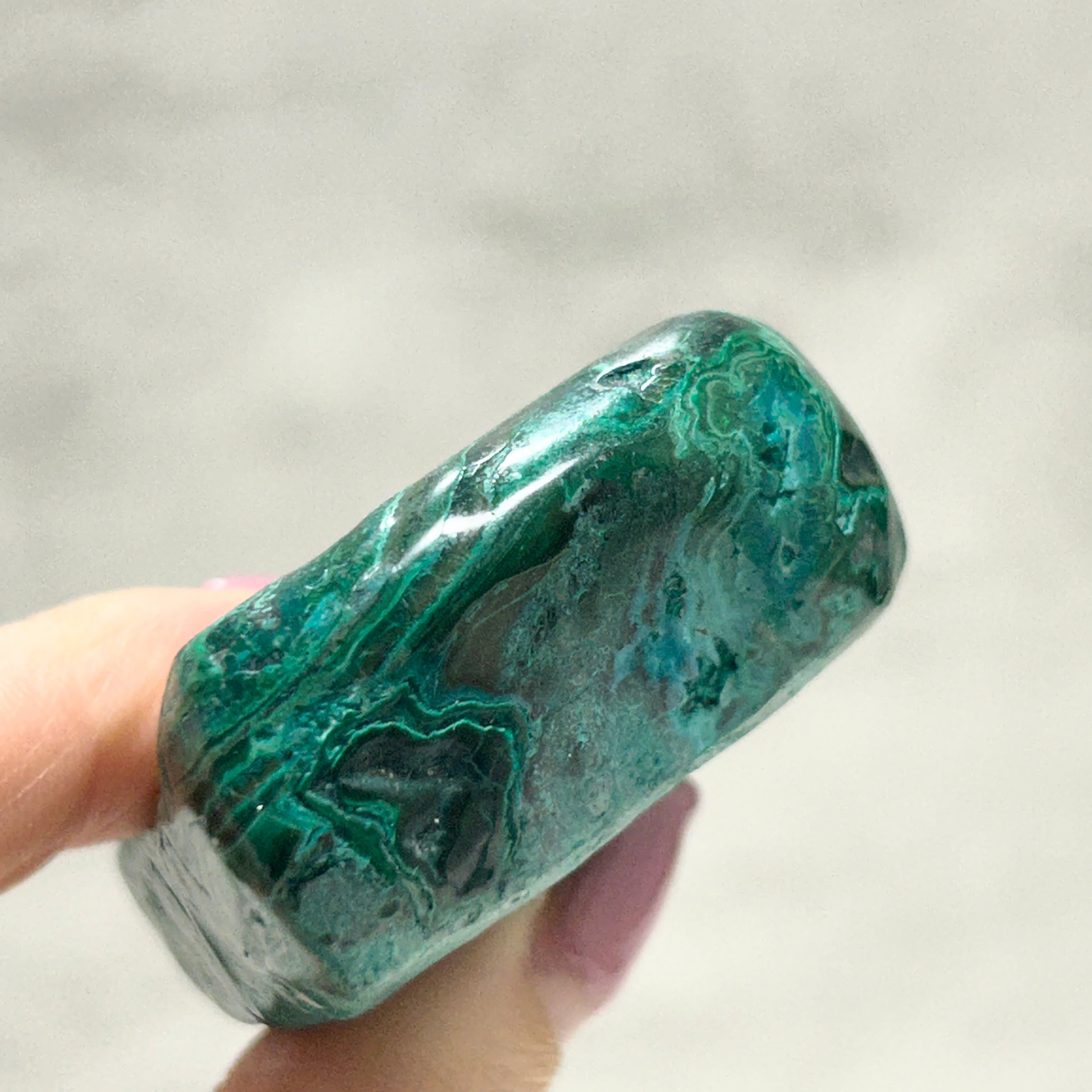 鮮やかなグリーンとブルーの模様が美しい、マラカイトクリソコラのフリーフォームです。