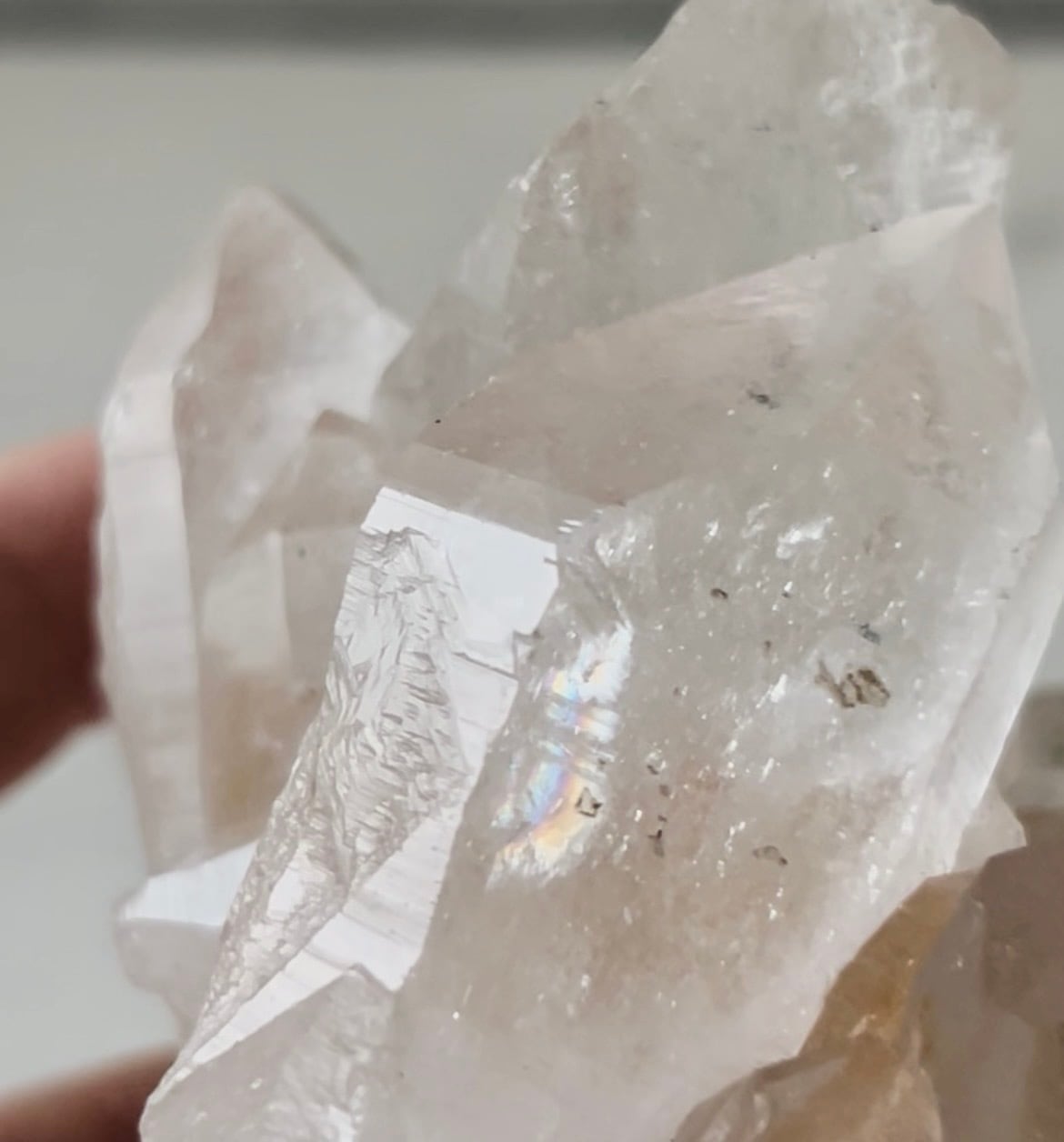 淡いピンク色と透明感が美しい、マニカラン産水晶クラスターです。レインボーも見られます。