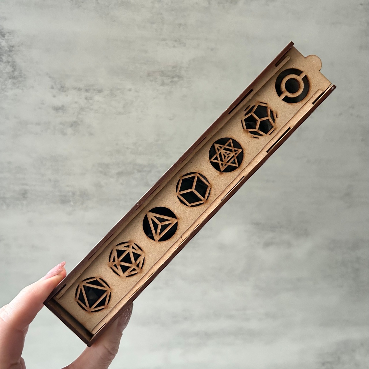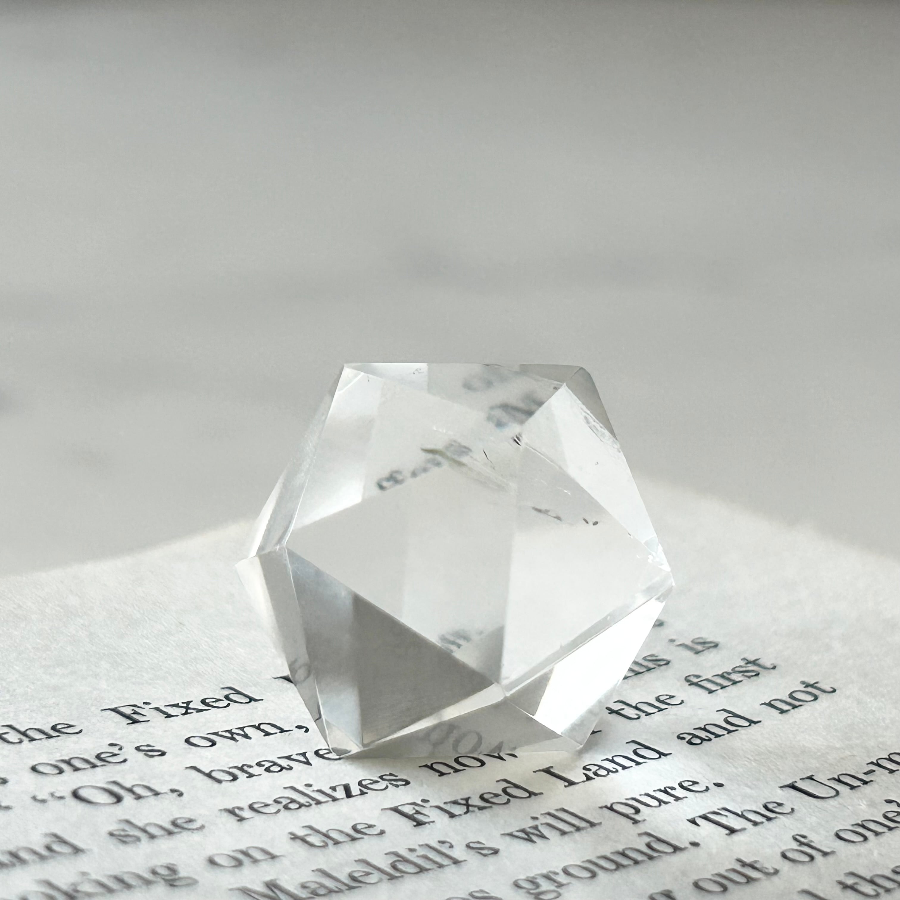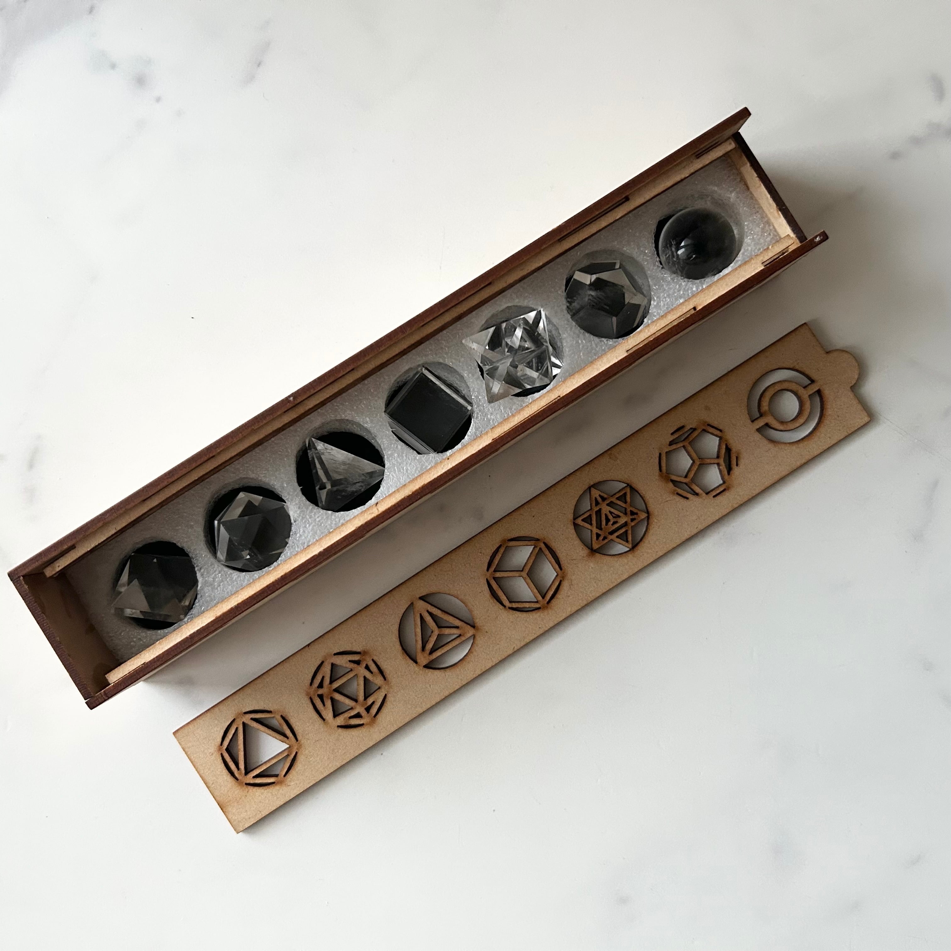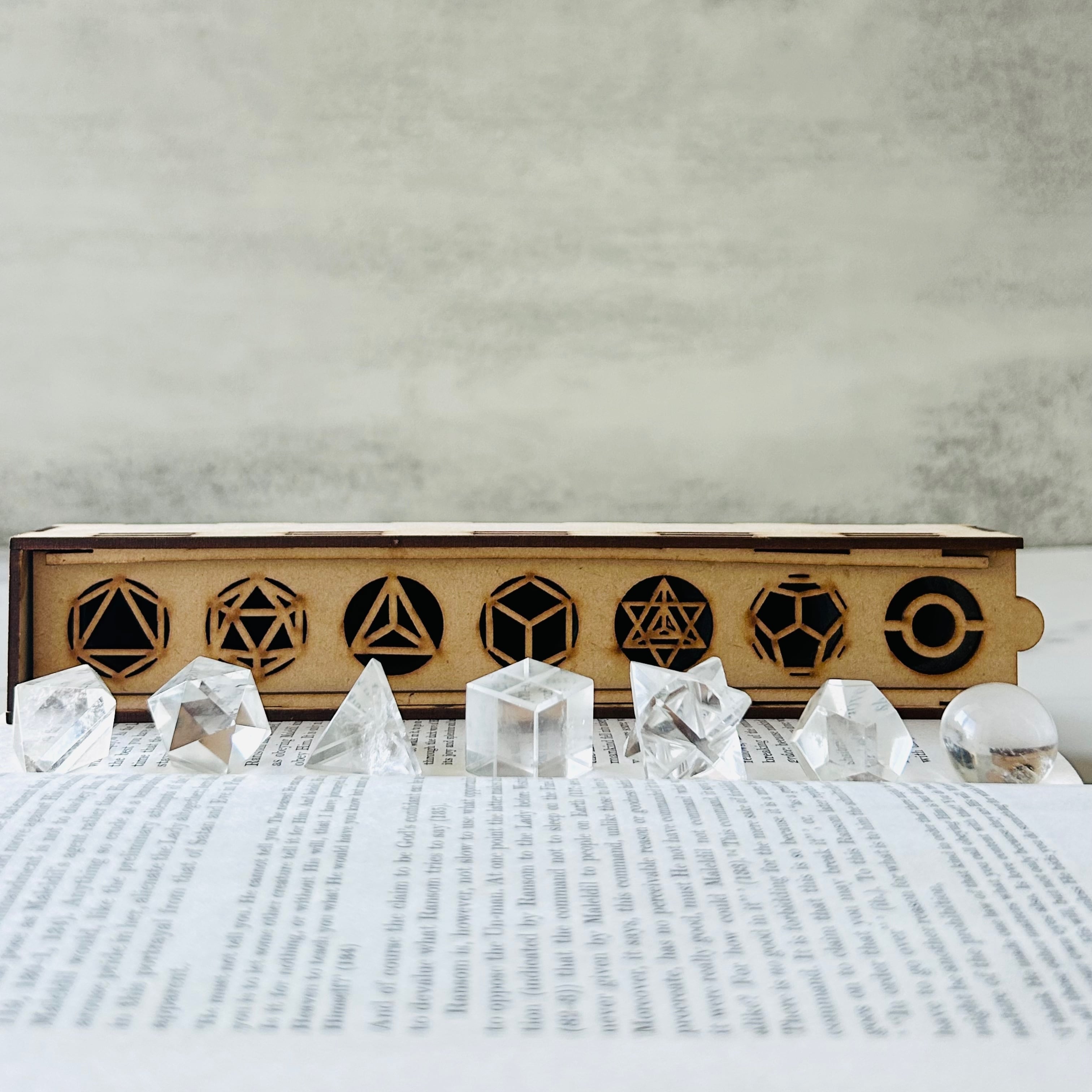 5つの多面体「プラトン立体」にスフィアとマカバスターを加えた、ヒマラヤ水晶の7点セット。専用木箱入りです。