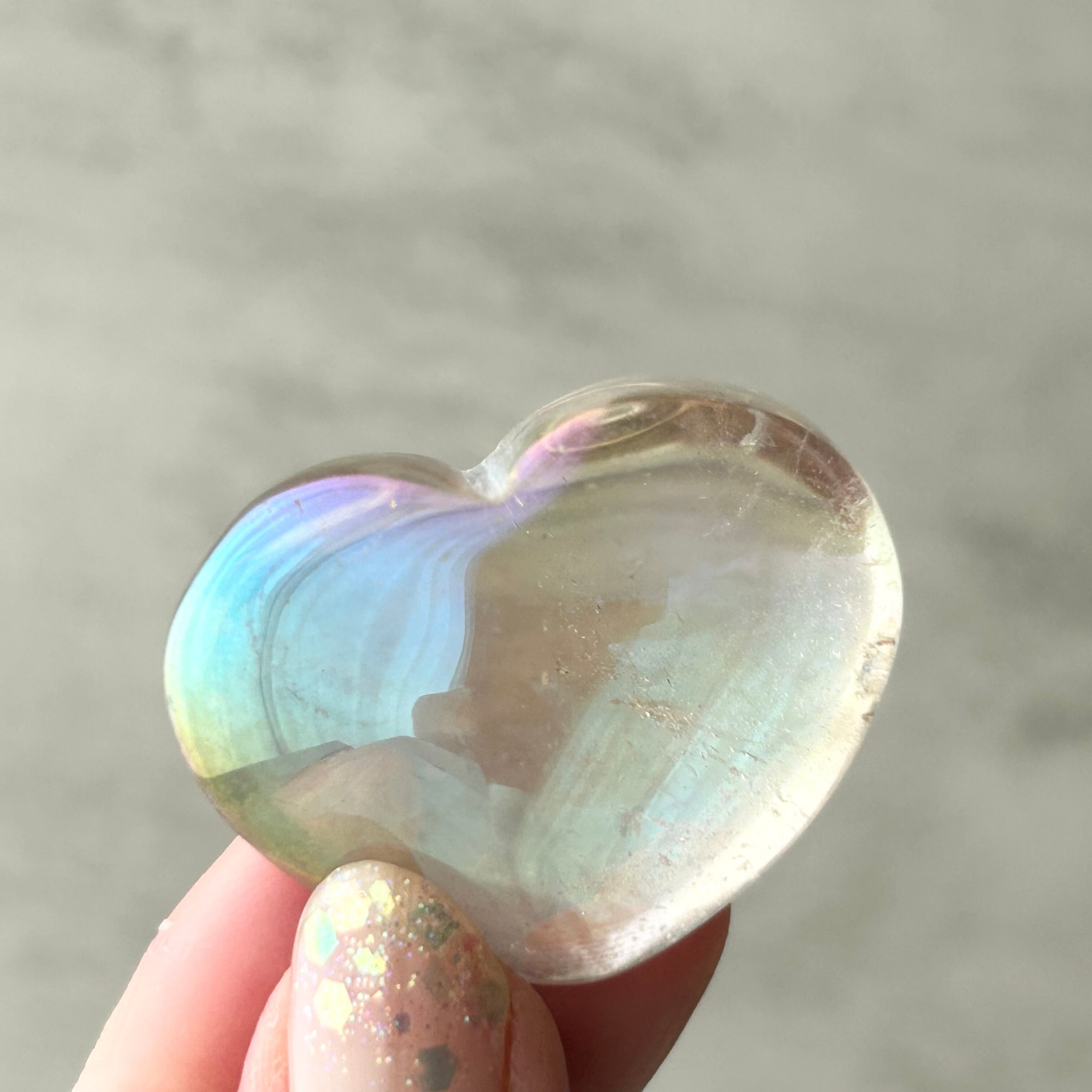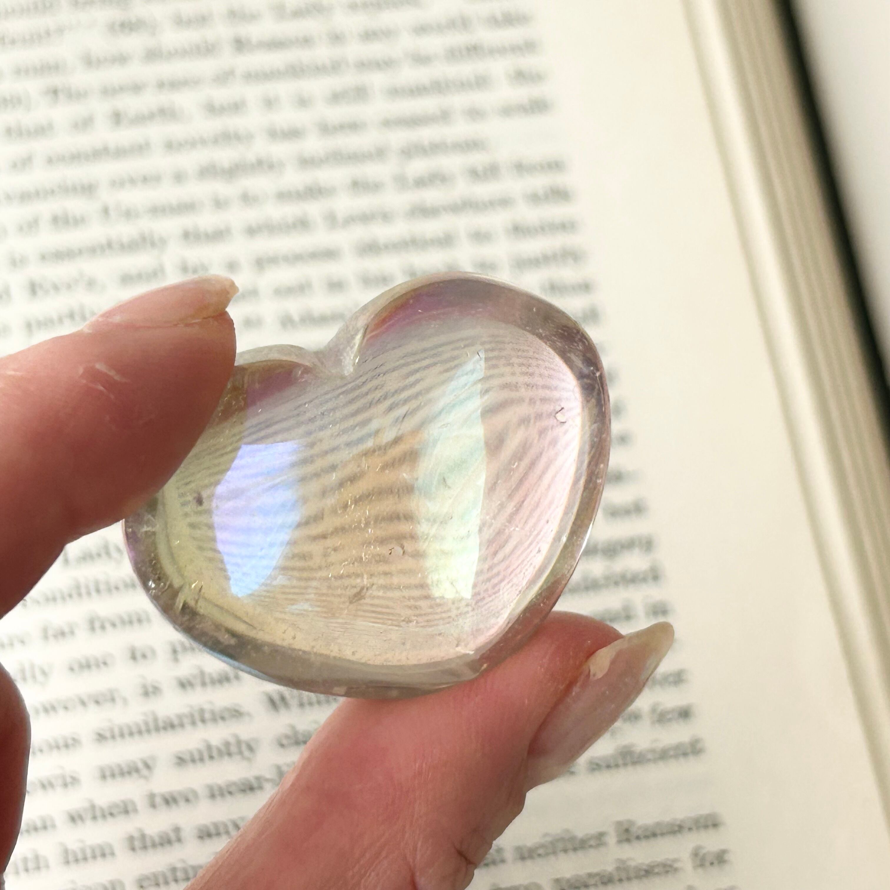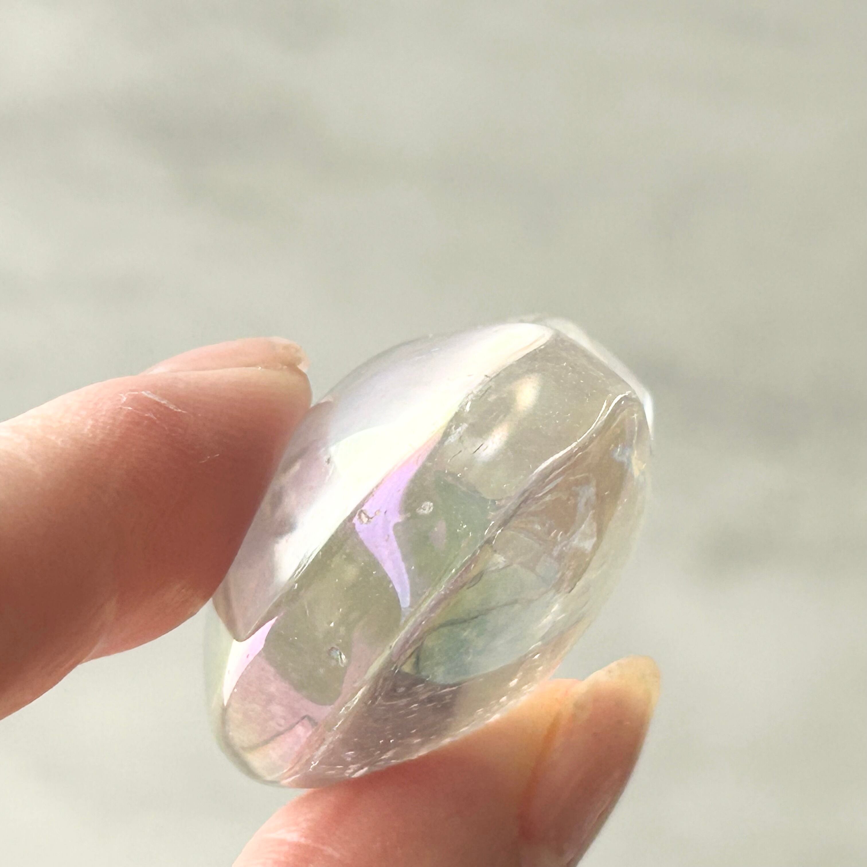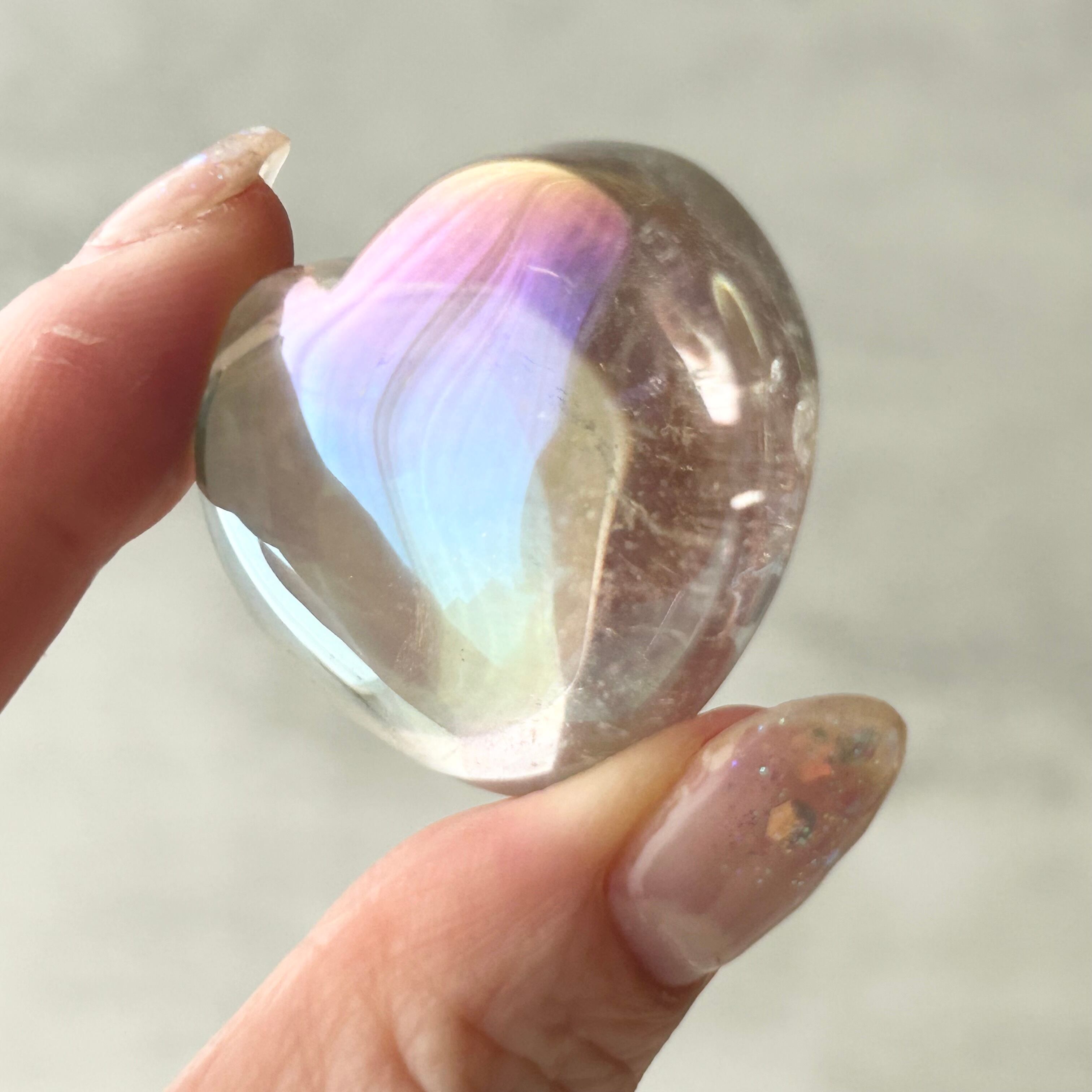 透明感のある水晶にエンジェルオーラ加工を施したハート型のパームストーンです。