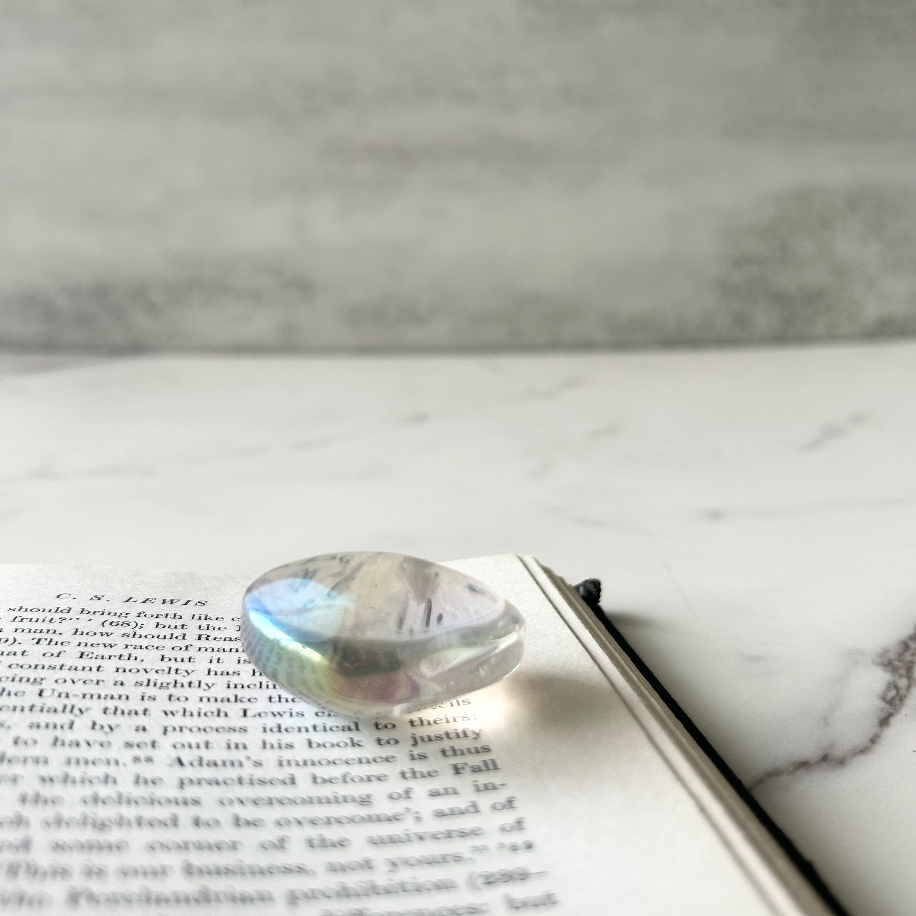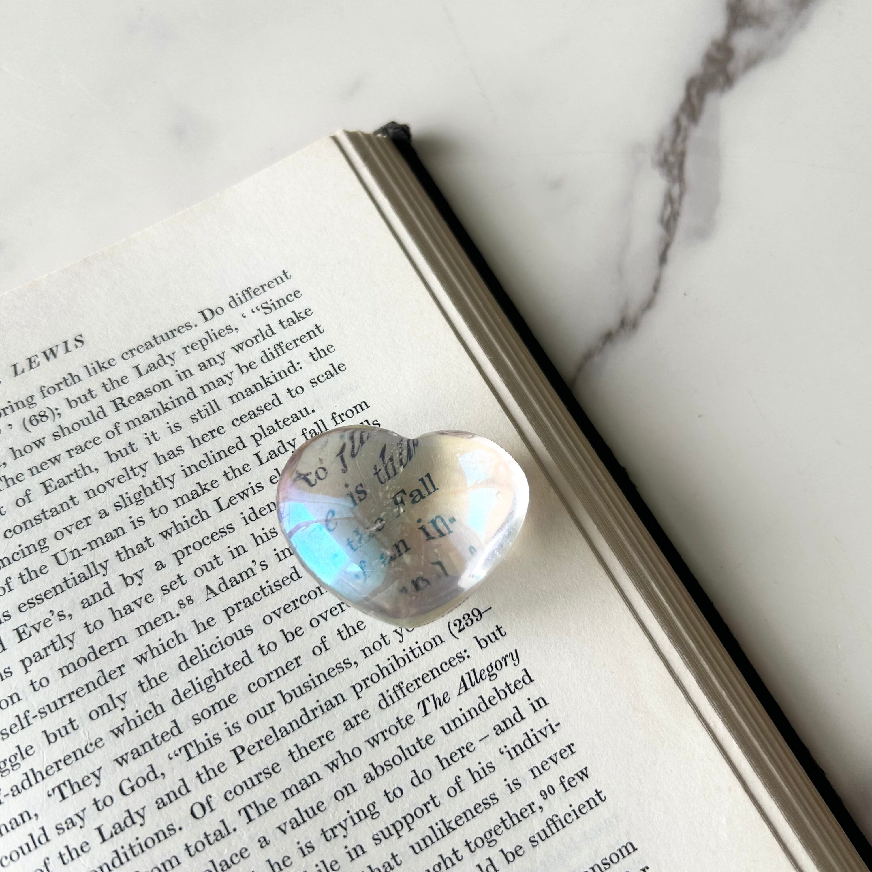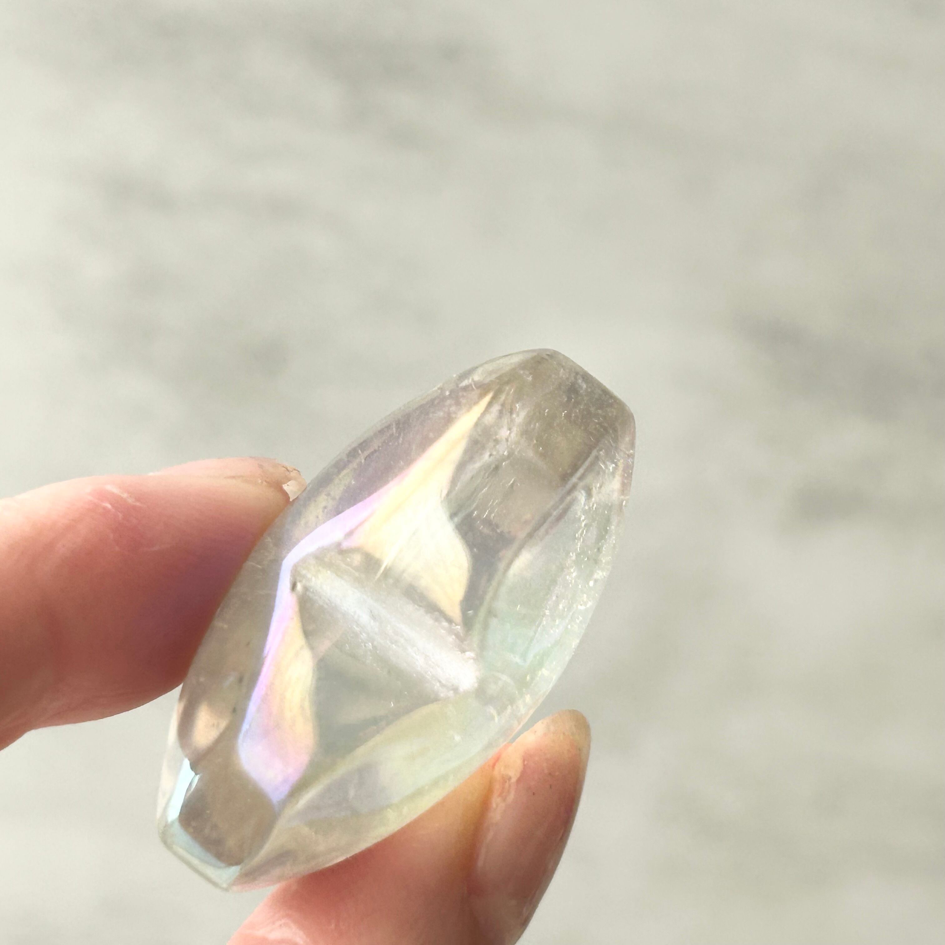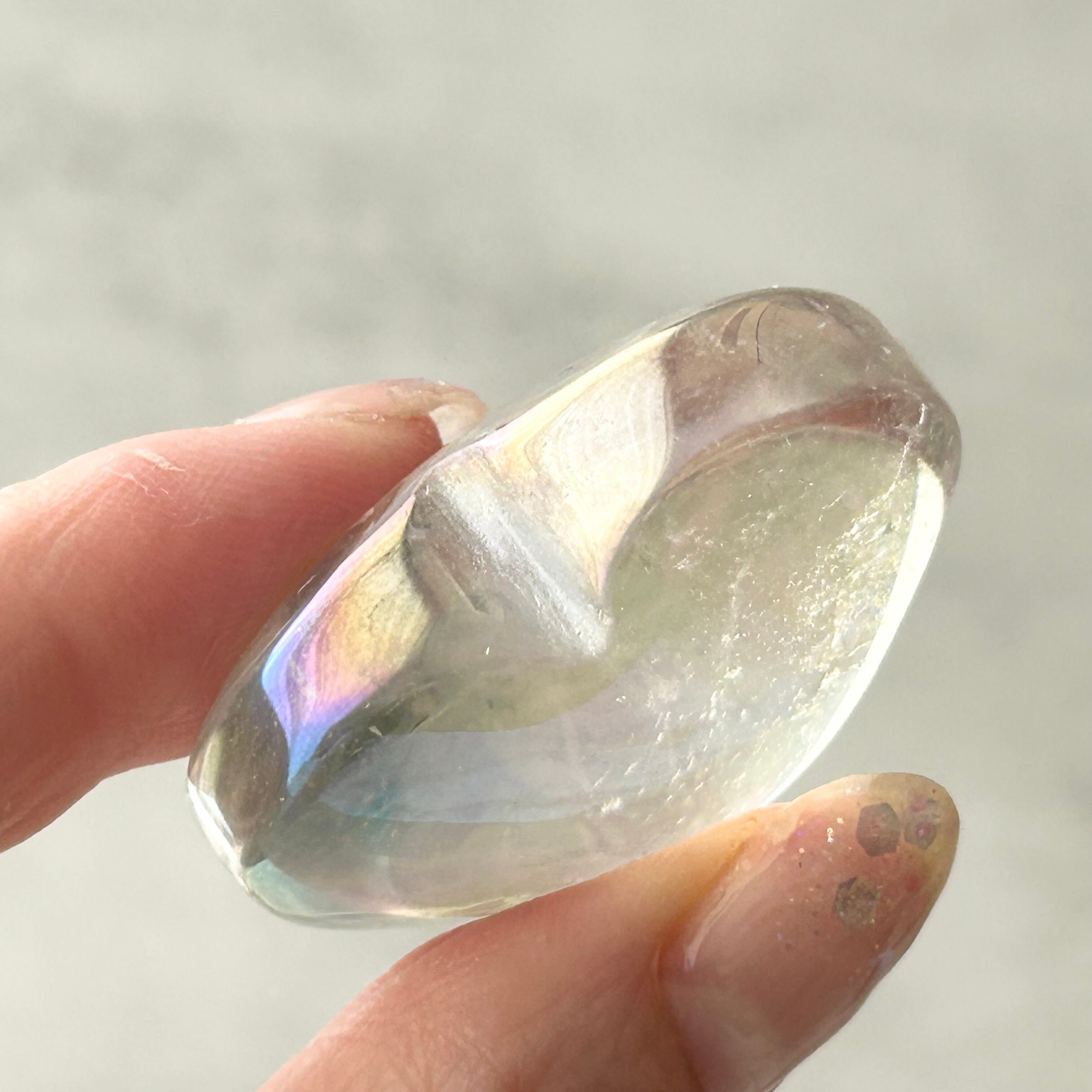透明感のある水晶にエンジェルオーラ加工を施したハート型のパームストーンです。