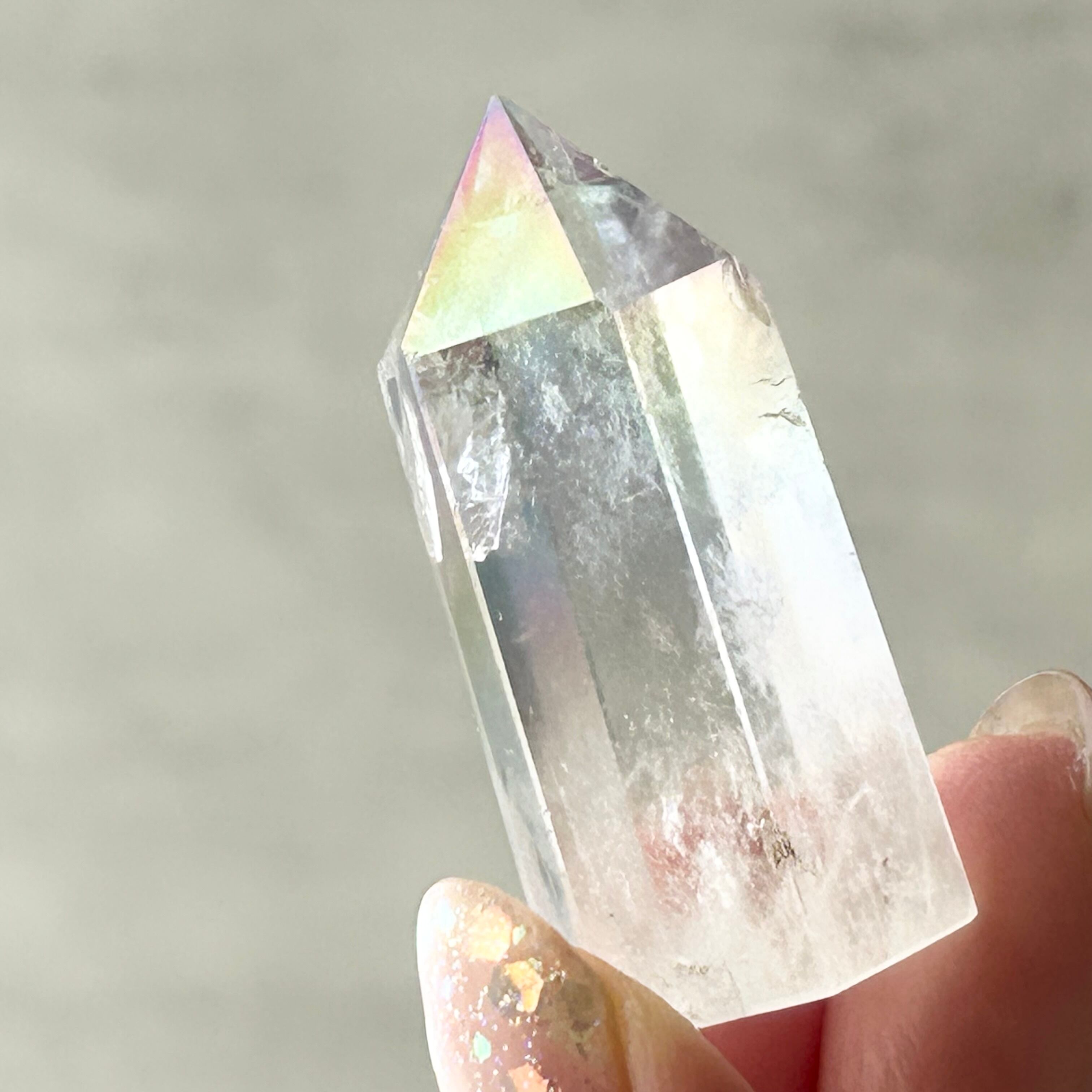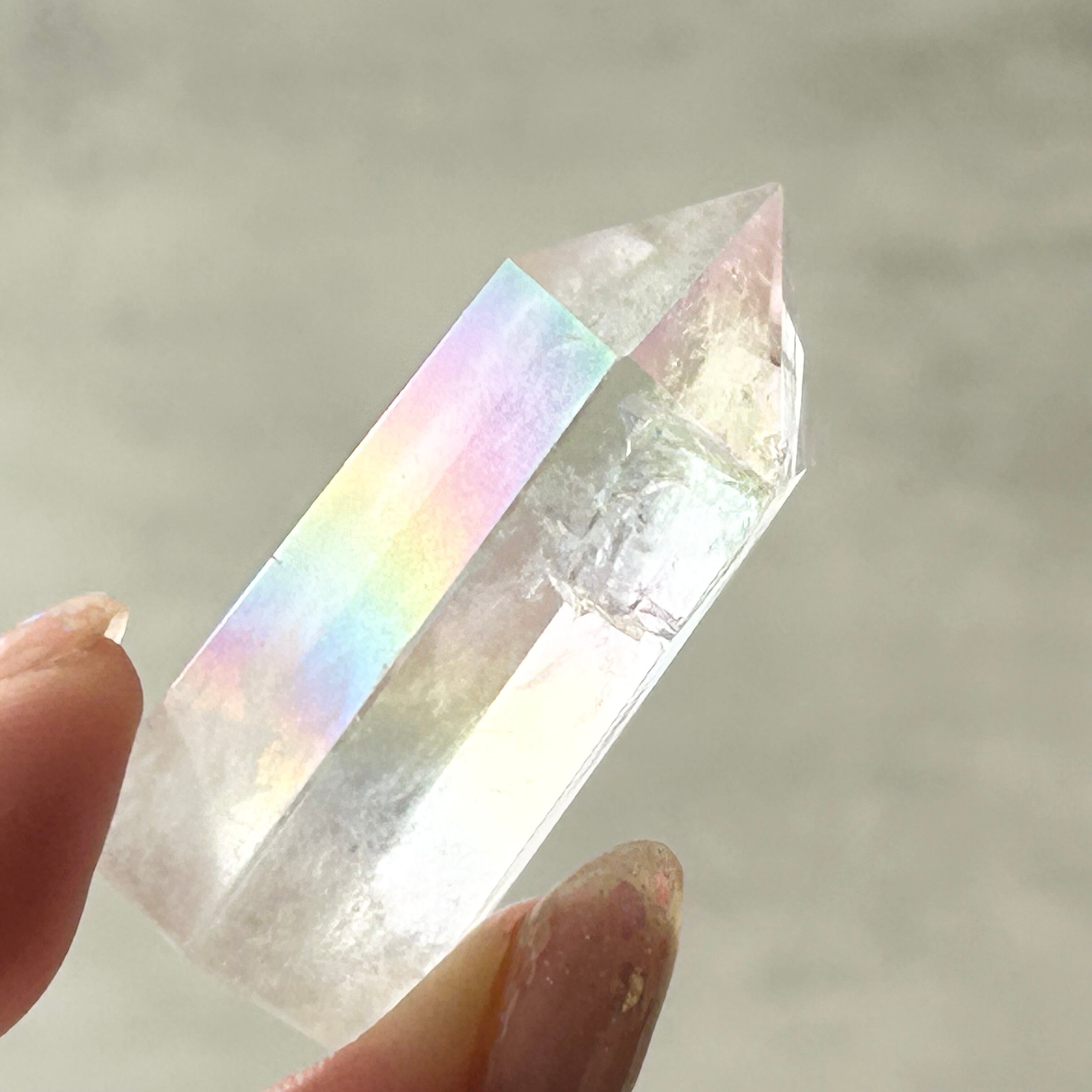 エンジェルオーラは、高温に加熱した水晶にイオン化したチタンとプラチナを真空蒸着させるという錬金術的な手法を用いて生み出された、自然と科学の融合とも言えるクリスタルです。