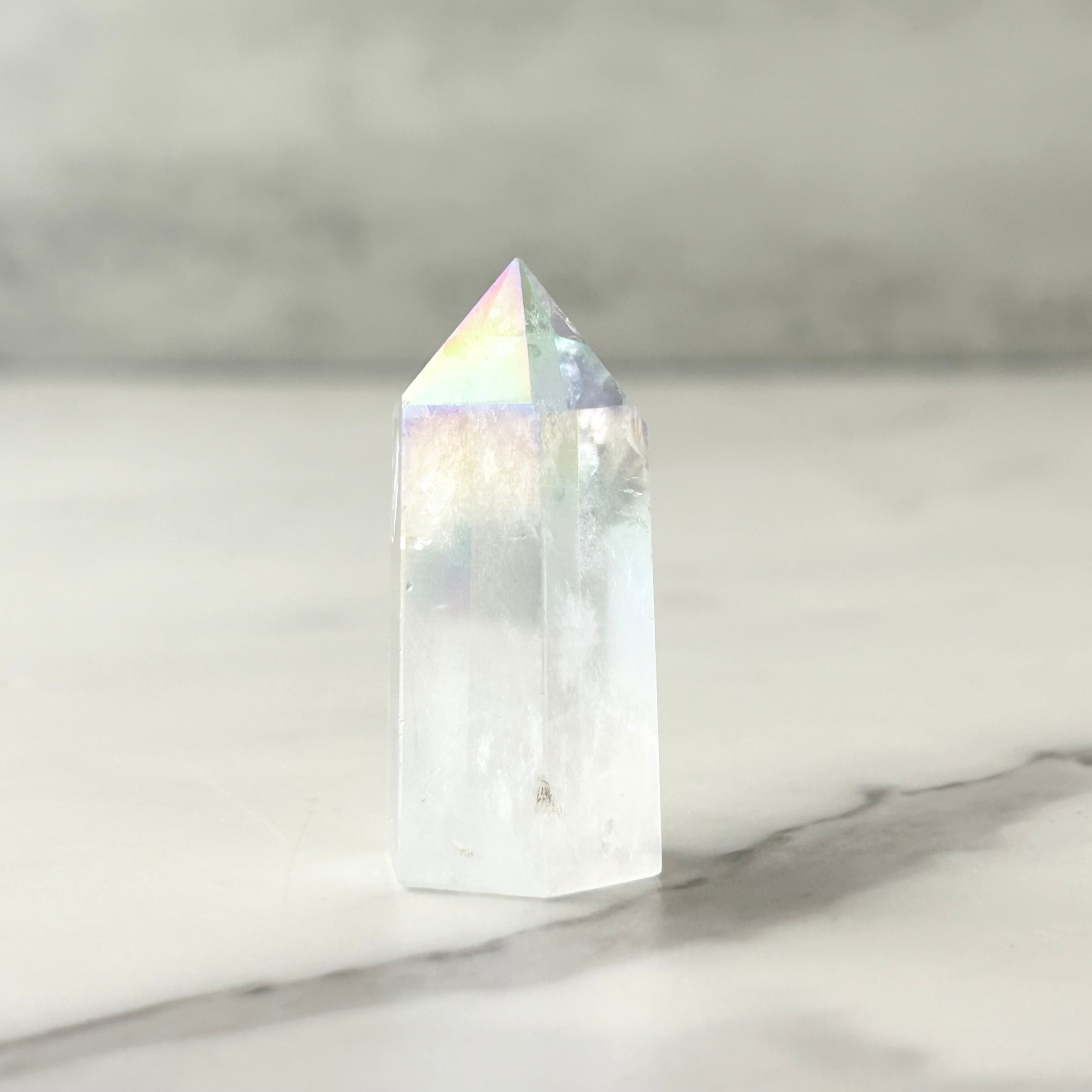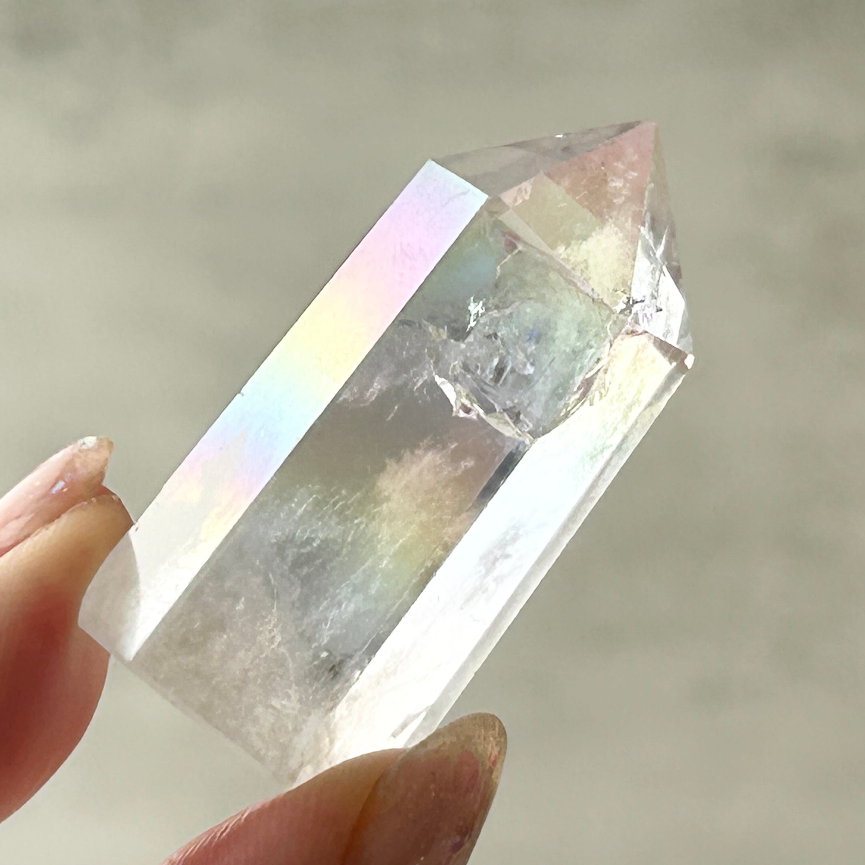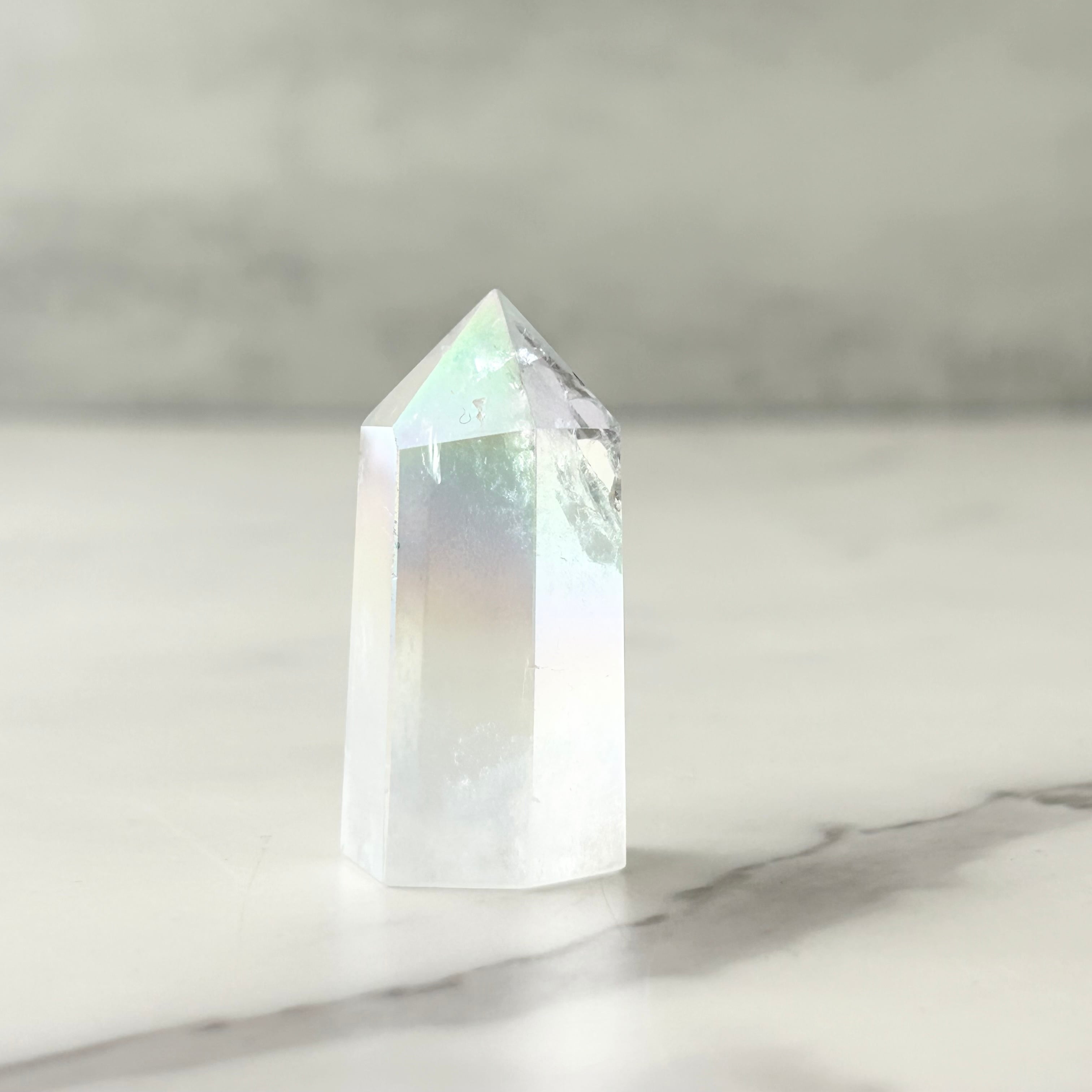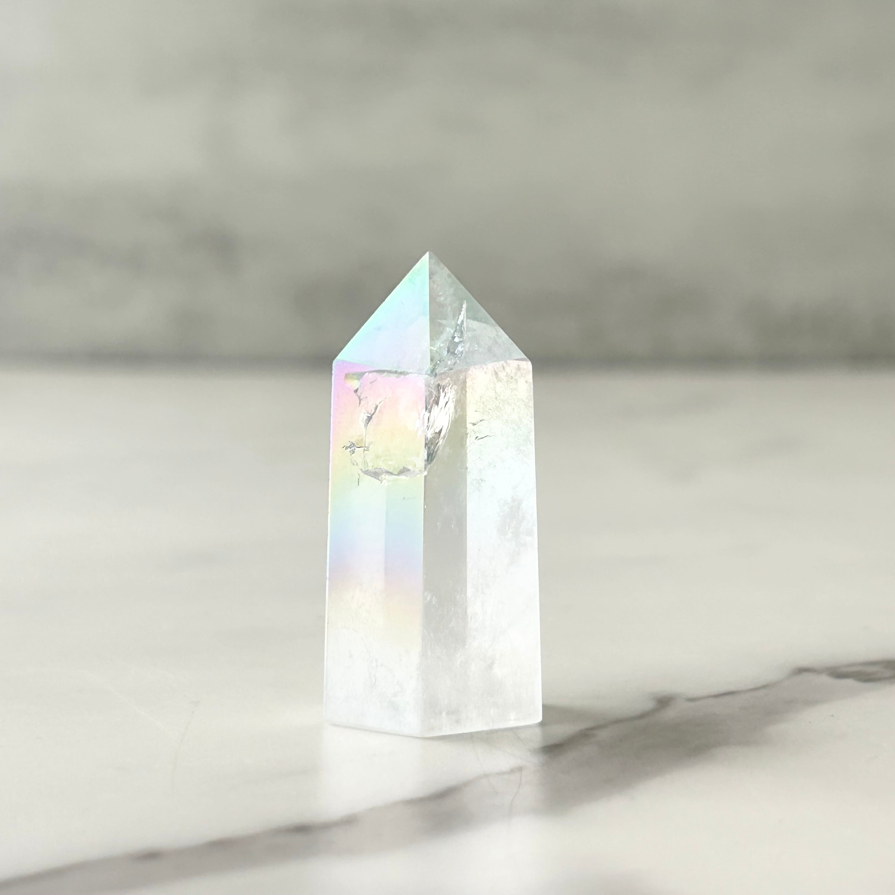 透明感のある水晶にエンジェルオーラ加工を施したタワーです。
