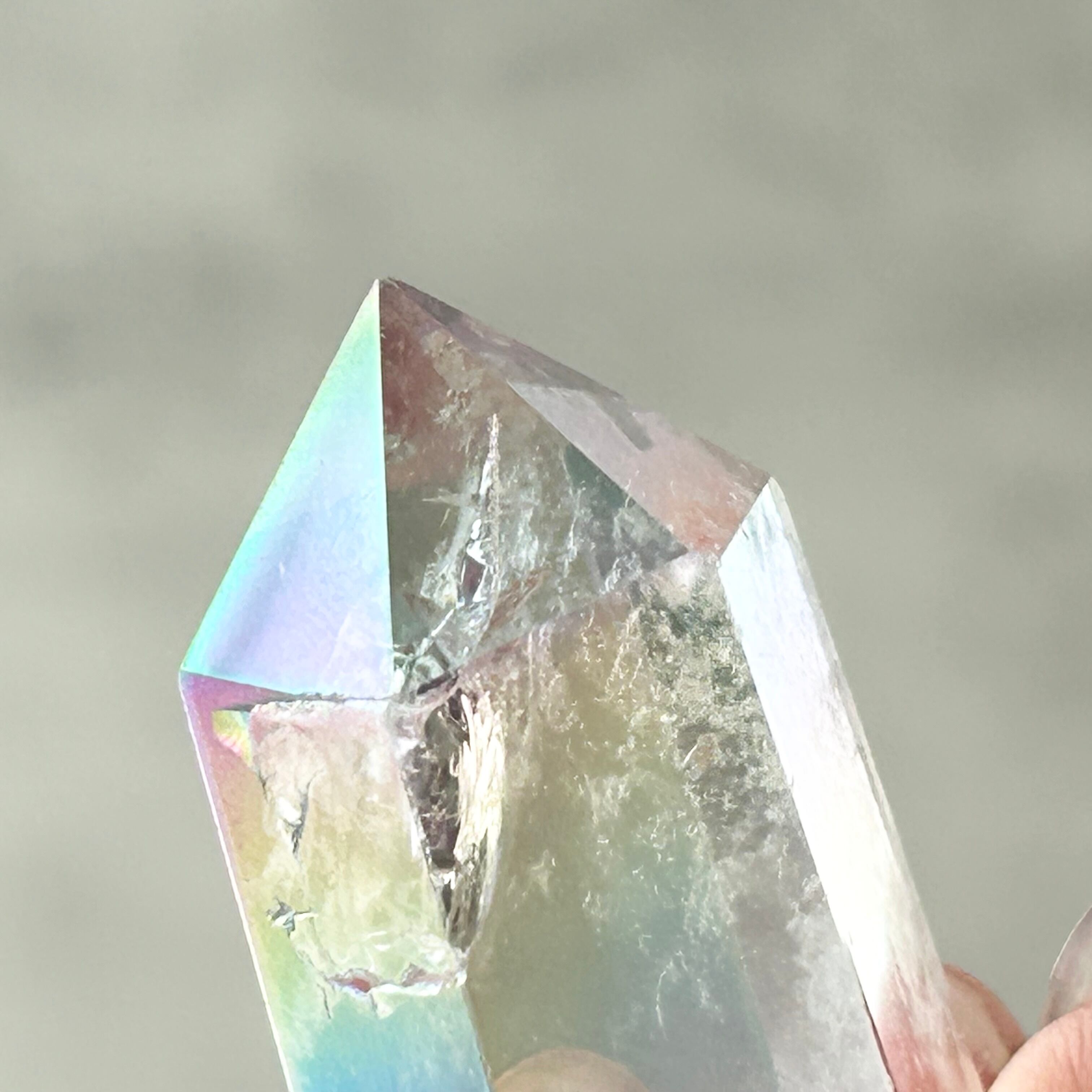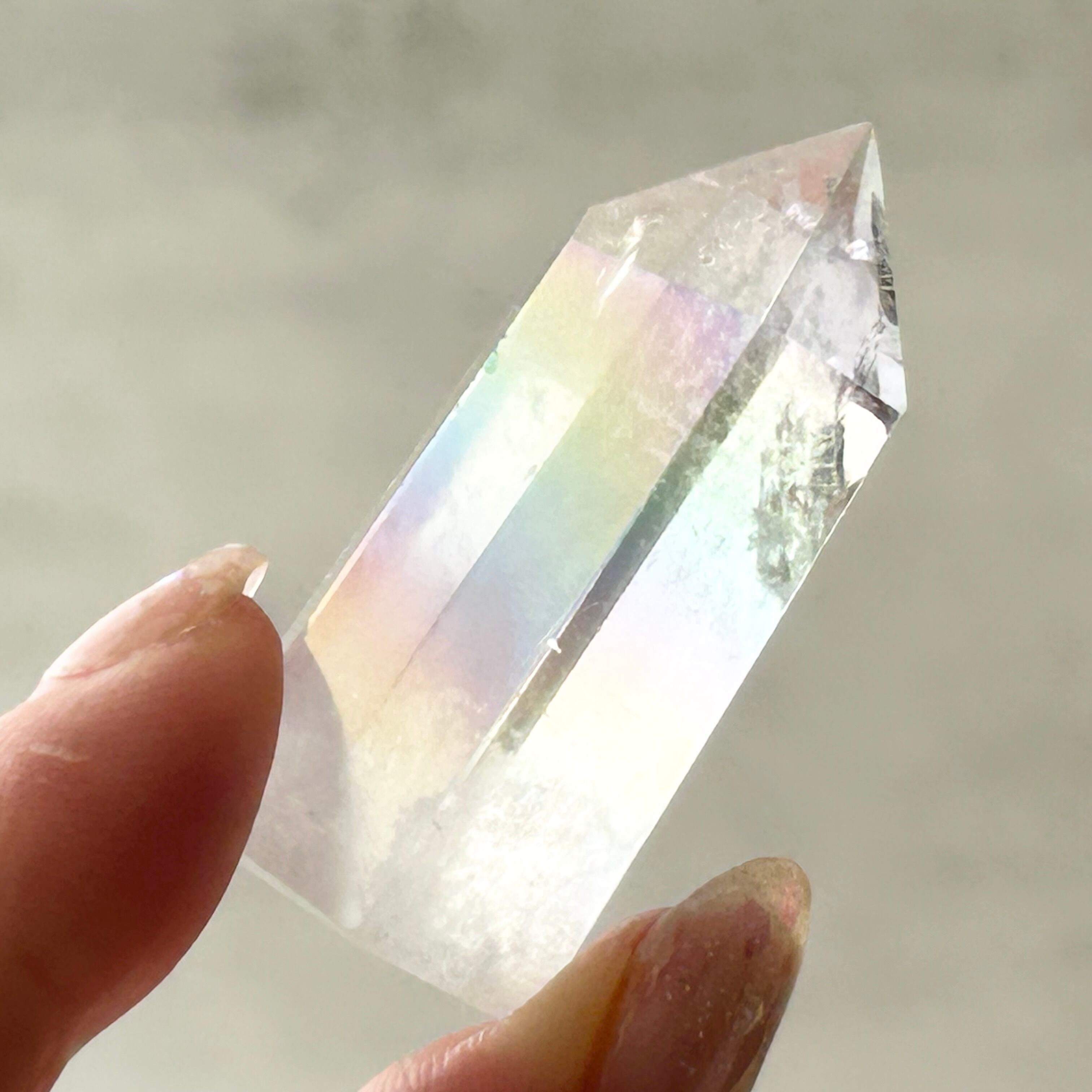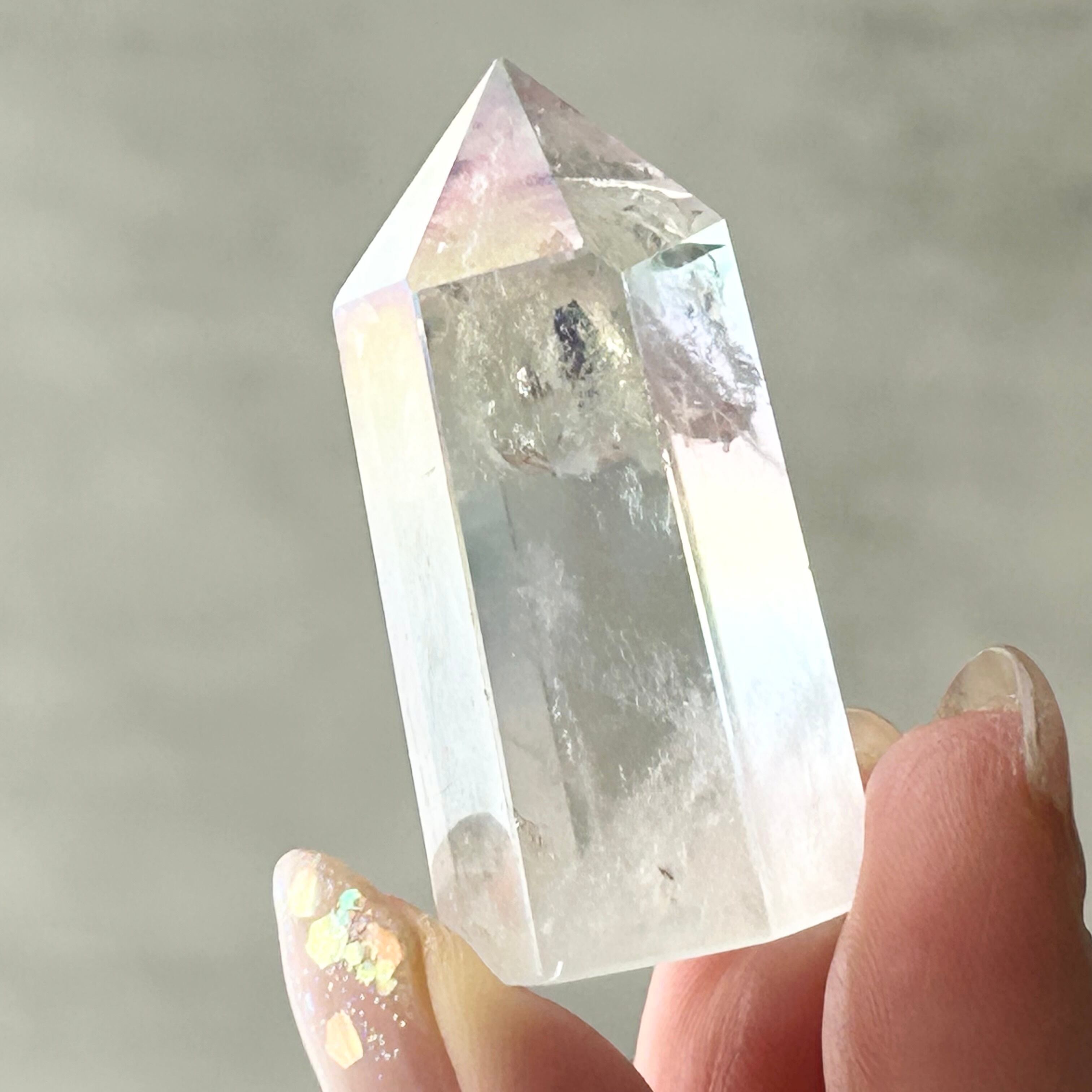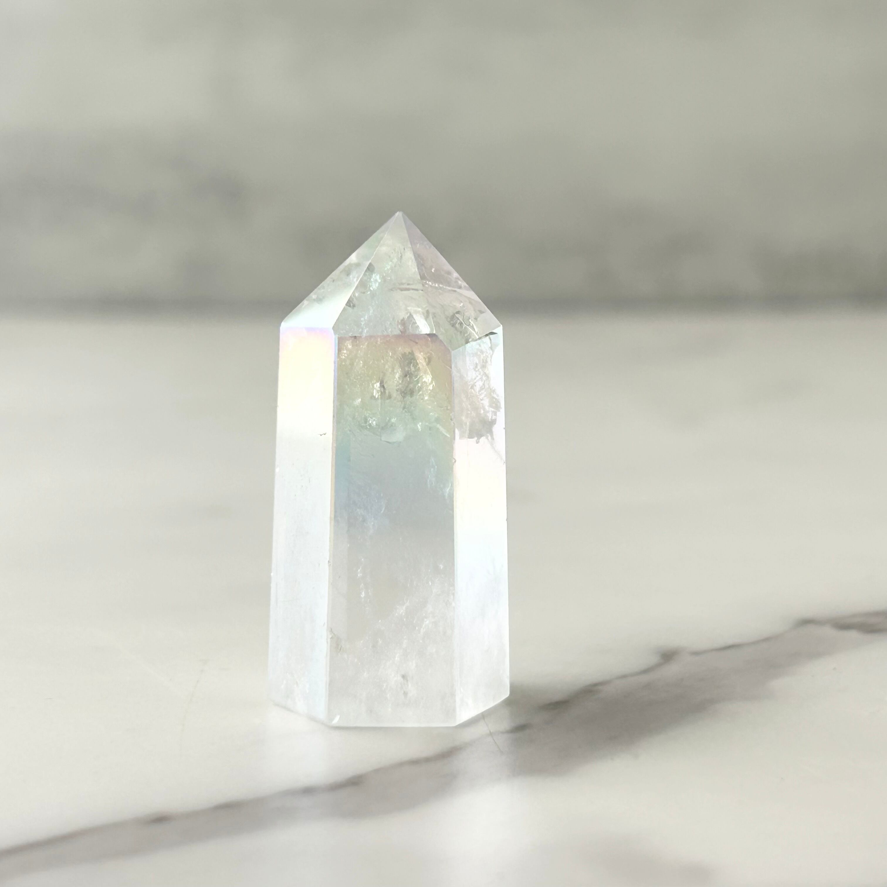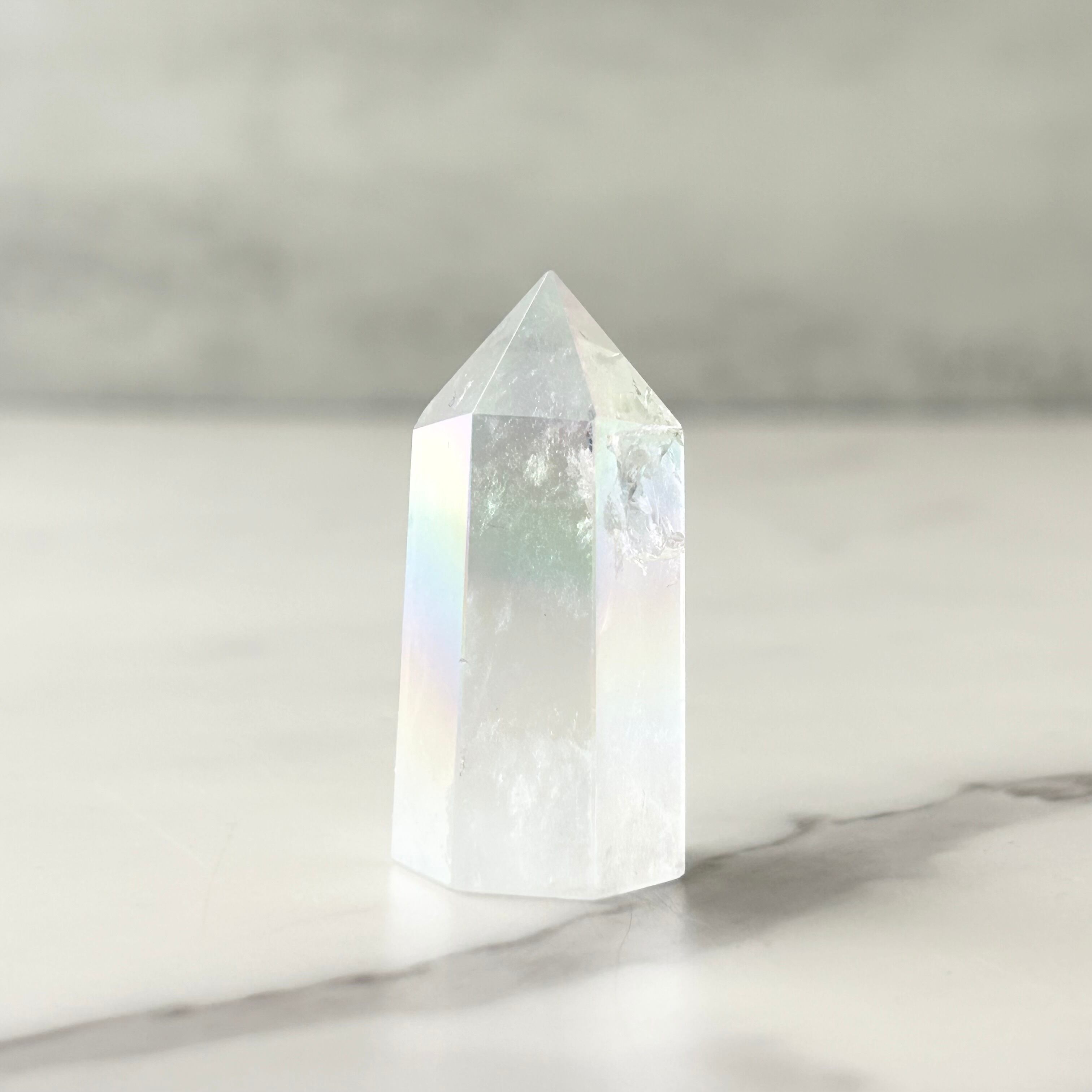 透明感のある水晶にエンジェルオーラ加工を施したタワーです。