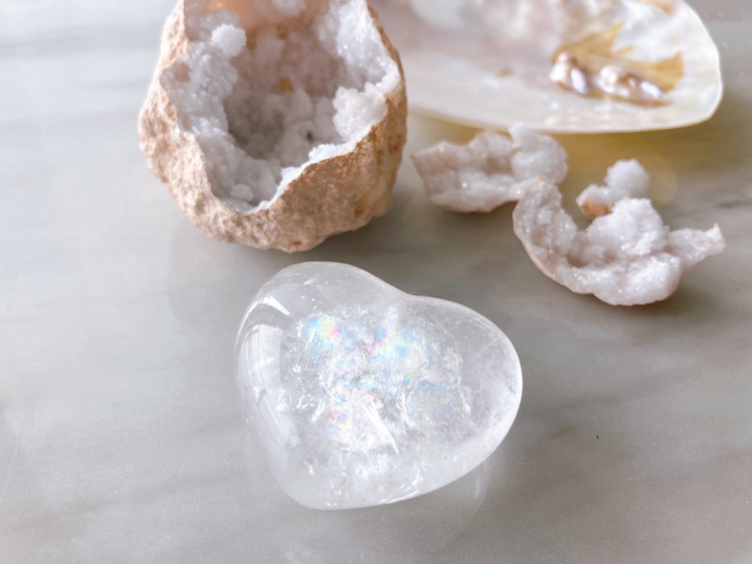 水晶ジオード、ハート型の虹入り水晶、パールシェルの3点セットです。