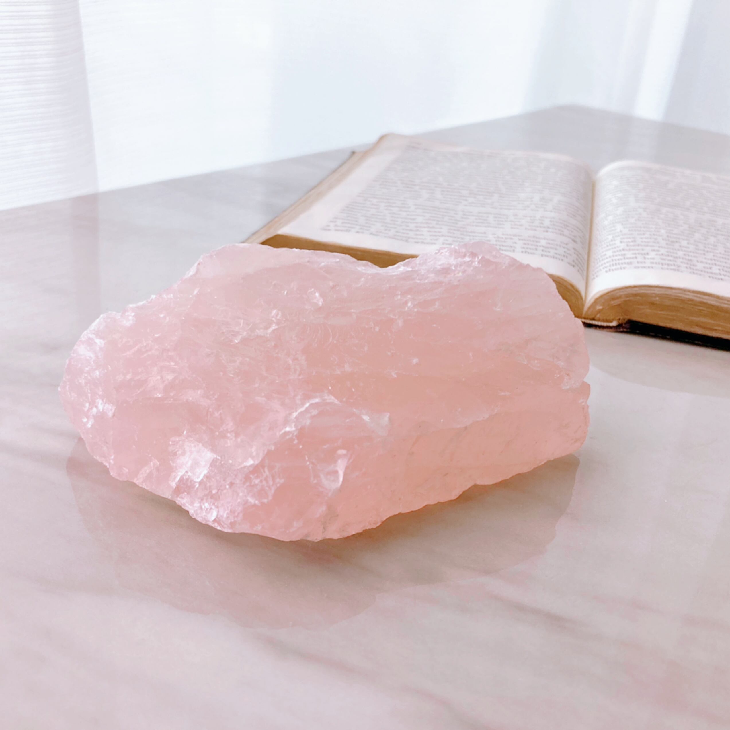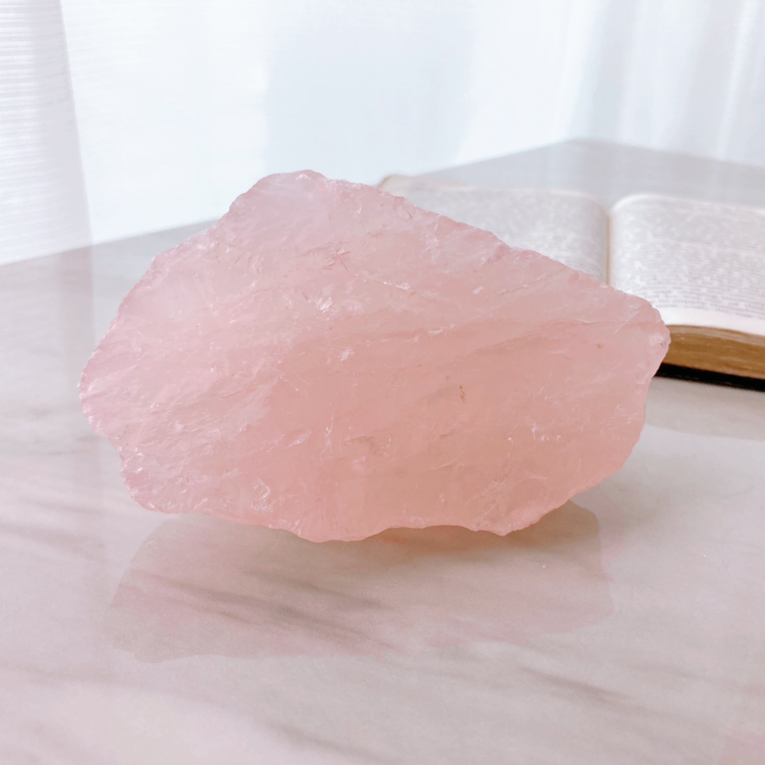 ○ブラジル産 ローズクォーツの原石です。淡いピンク色で砂糖菓子のような見た目、眺めるだけで癒されます。レインボーも見られます。置物としてはもちろん、ブレスレットを置いたり、使い方は自由自在です。