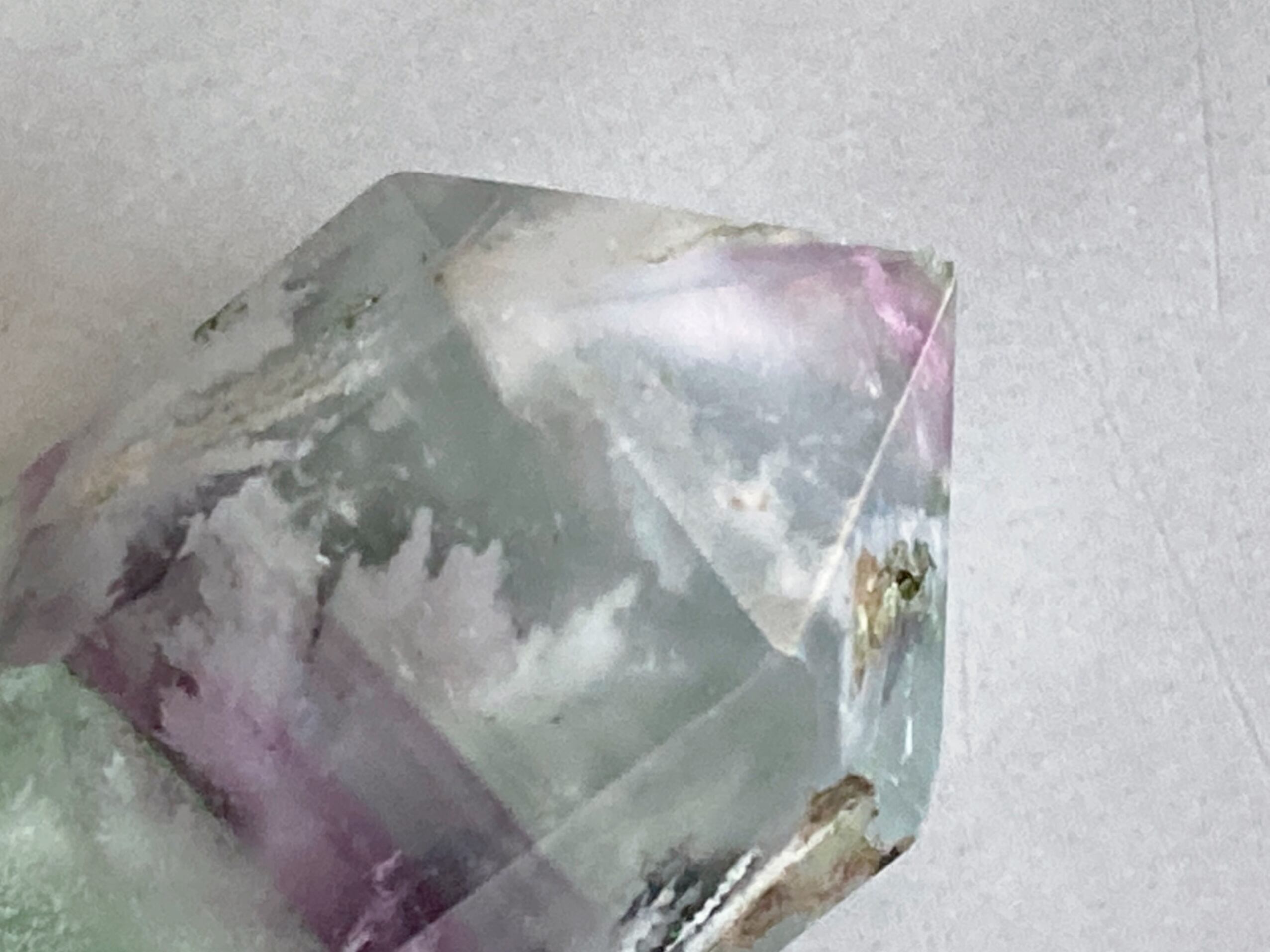 こちらのクリスタルは、グリーンベースにパープルのラインが特徴です。トップがほんのりピンク色で可愛いです。