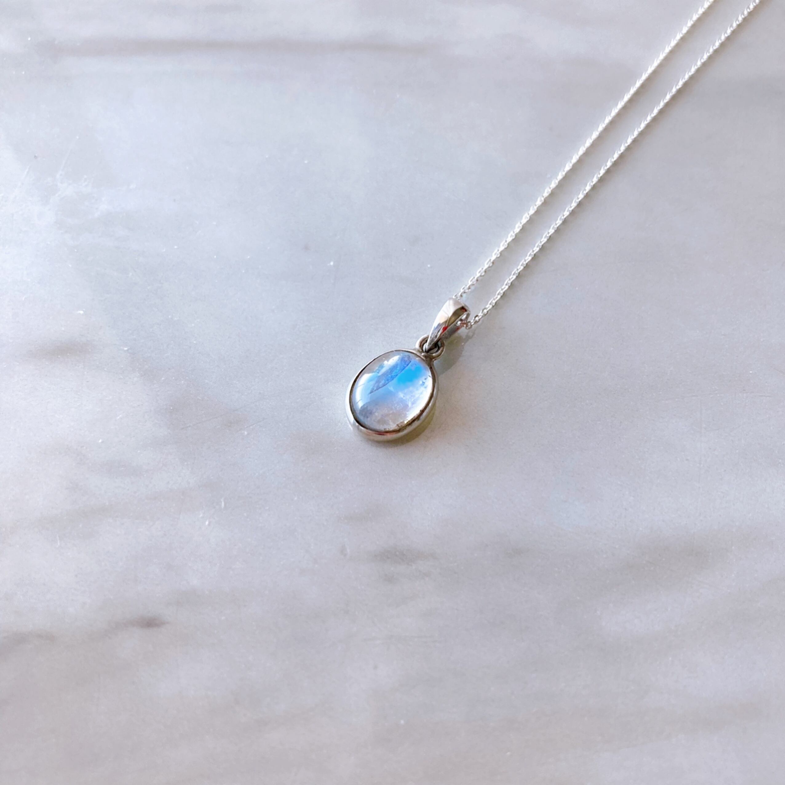 レインボームーンストーンの天然石ネックレスです。鉱物としての正式名称はホワイトラブラドライトですが、レインボームーンストーンの愛称で親しまれています。