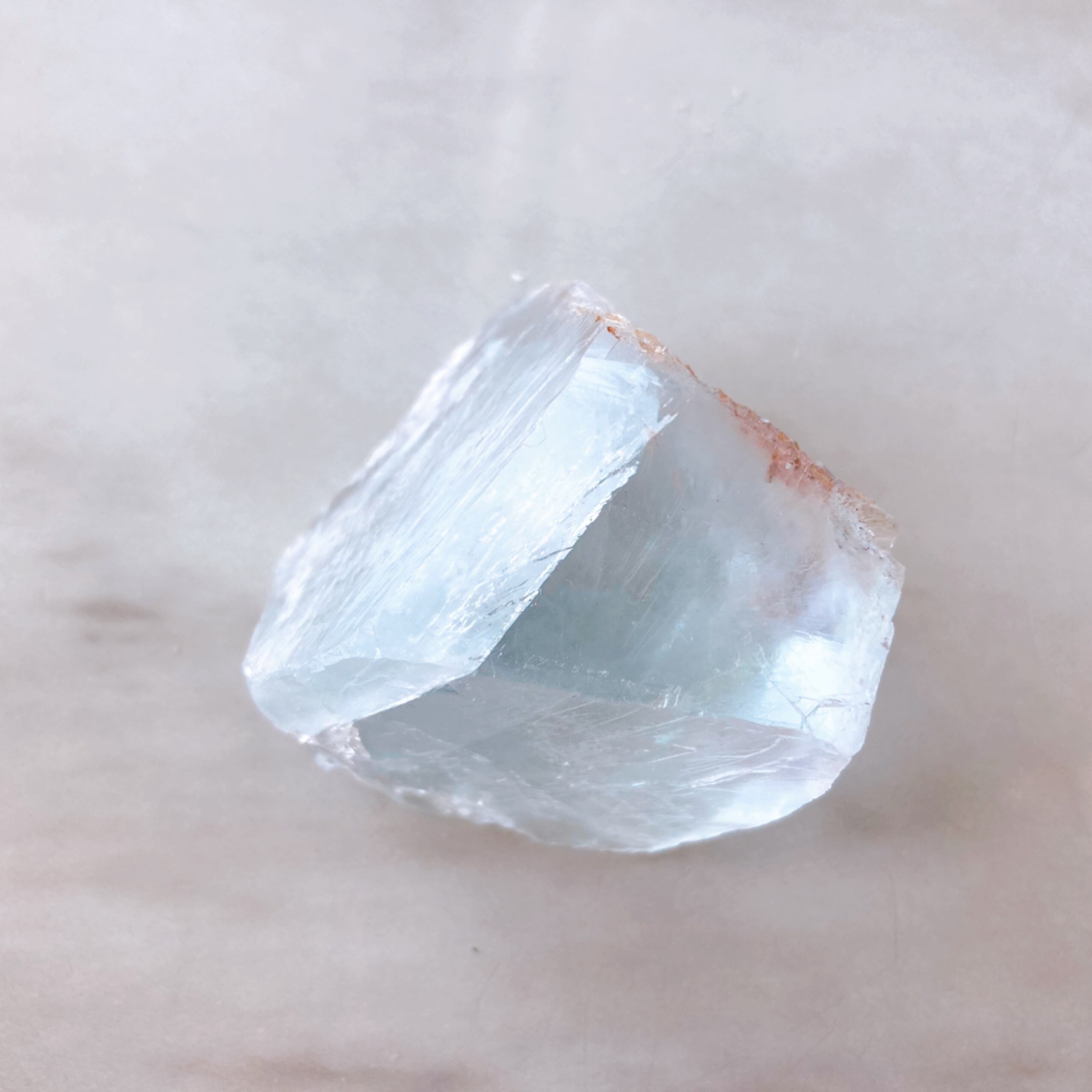 虹が綺麗に見られるブルーフローライトの原石です。クリアに近い薄いブルーです。