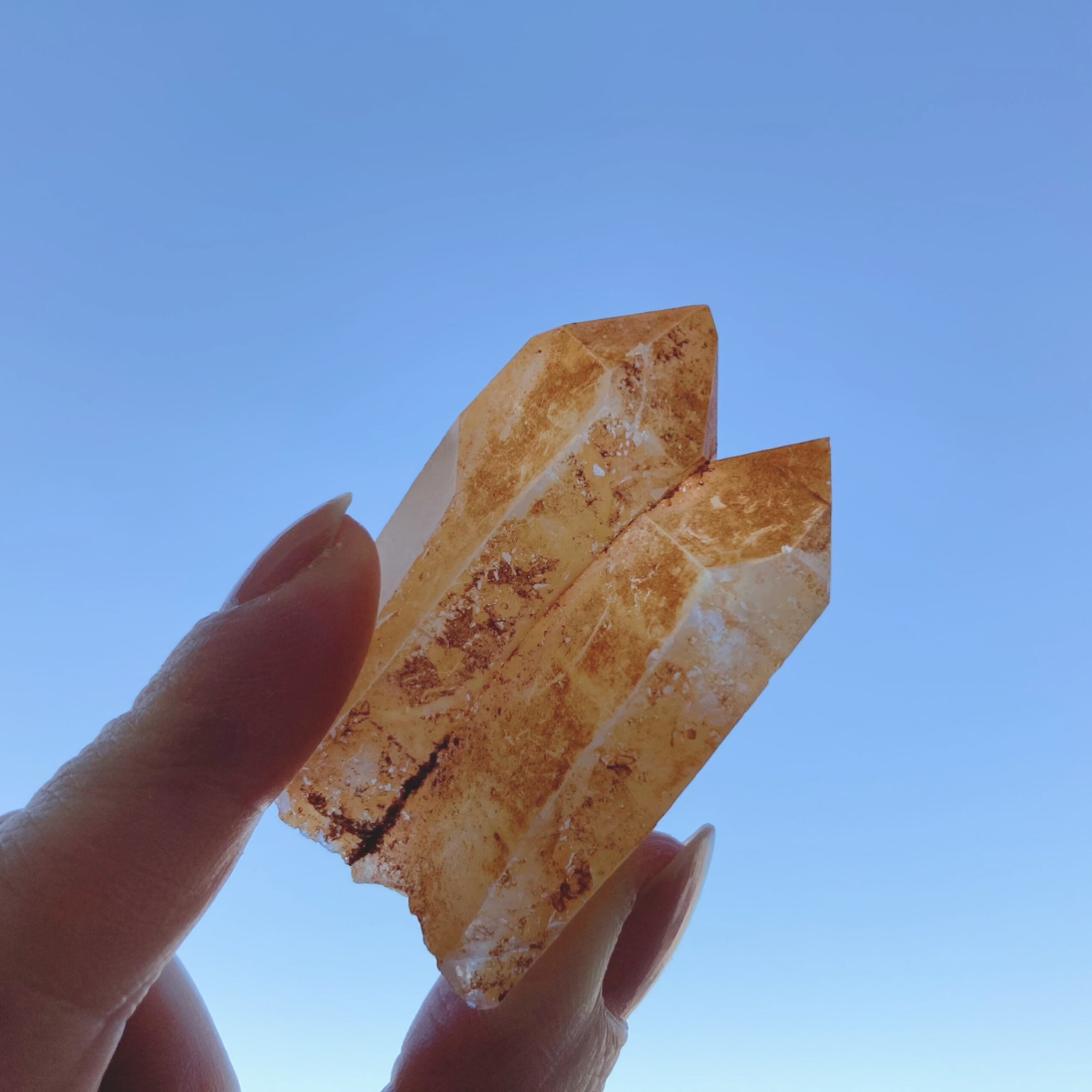 2本のポイントがピッタリとくっついたツインのタンジェリンクォーツです。オレンジ色の鉄分を覆ったマットな質感です。