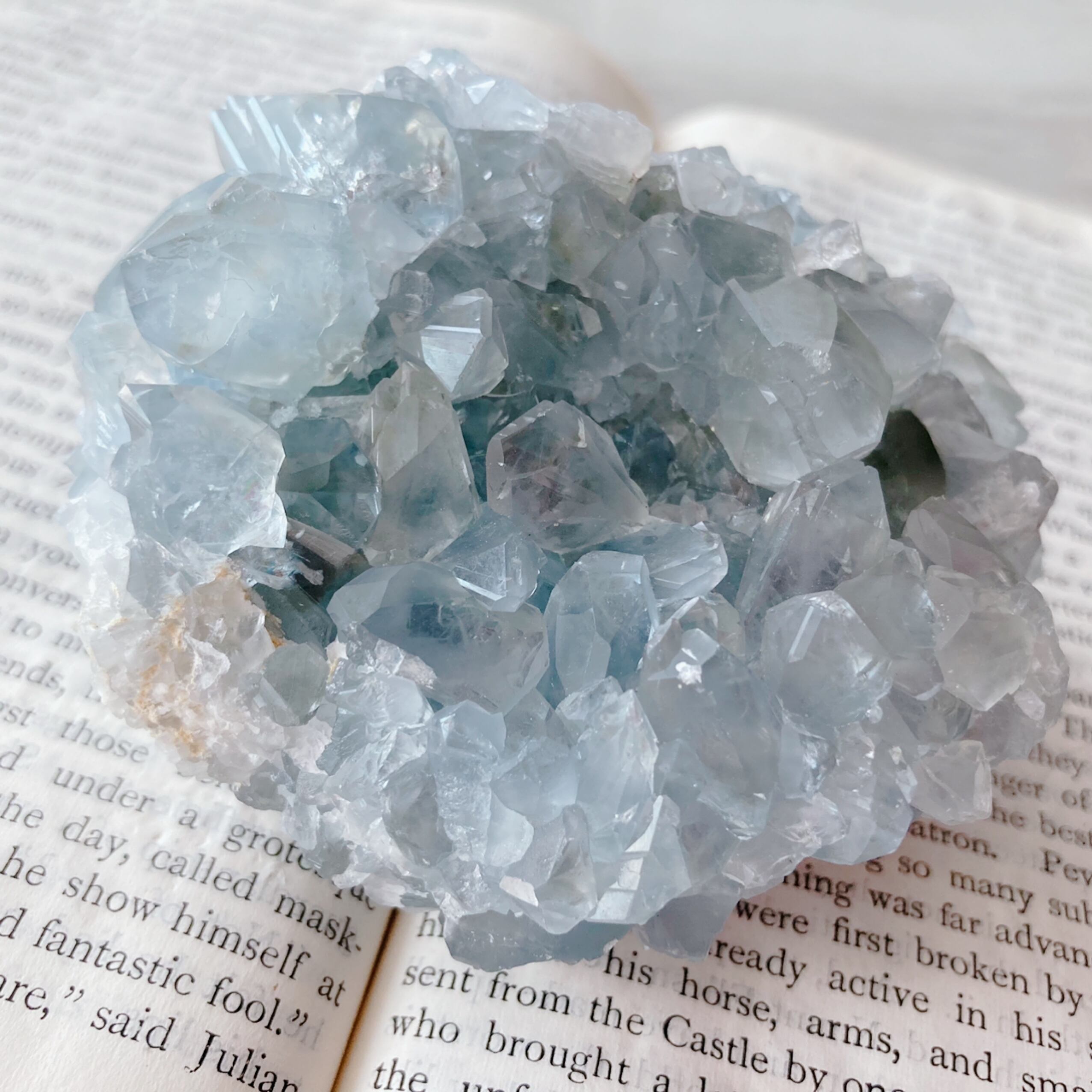 天青石という、青く晴れた空を連想させる和名を持つ、美しいスカイブルーのセレスタイト。ラテン語で「天国のような」という意味も持っています。
