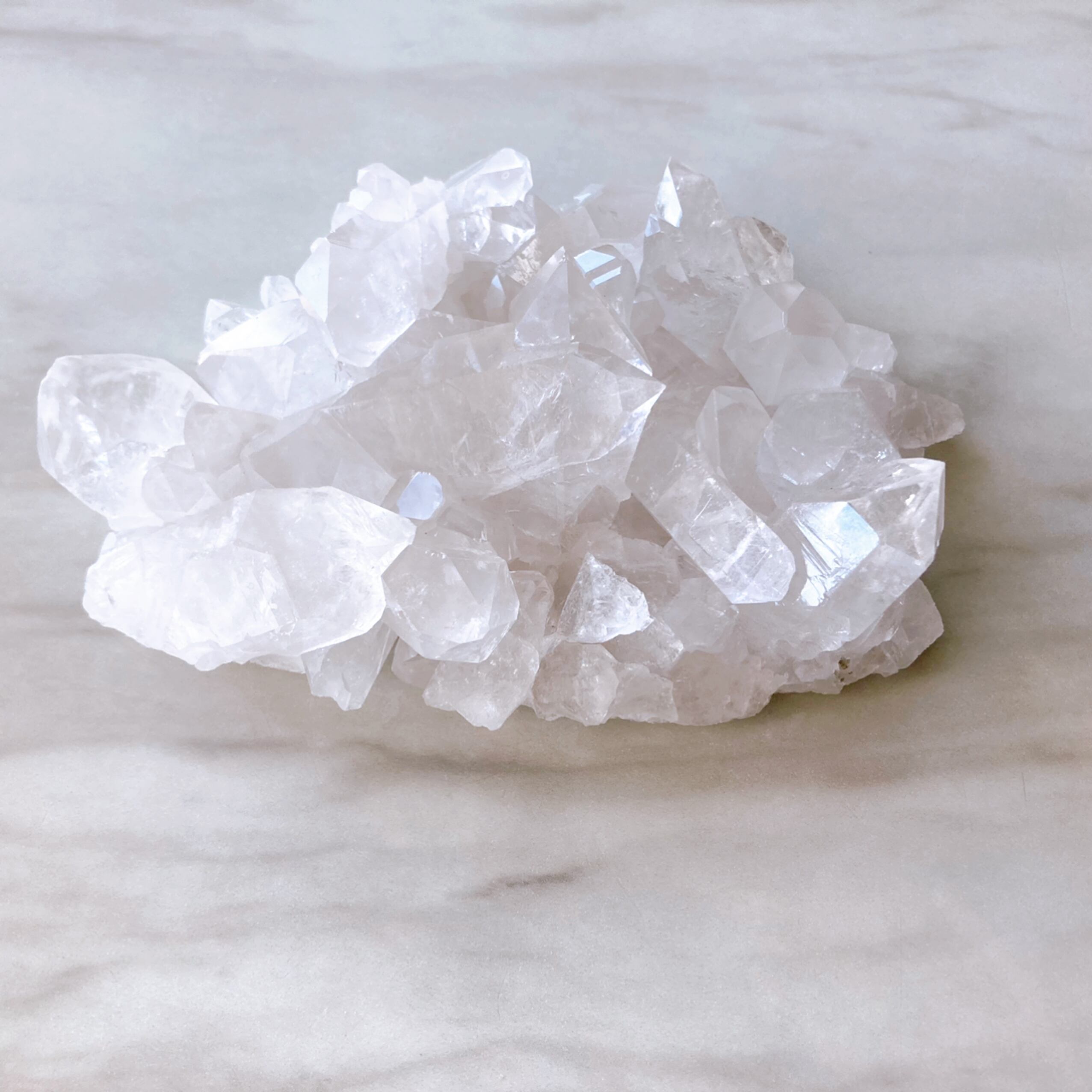 太めのポイントが重なり合いながら横たわっているような印象の水晶クラスターです。虹も見られます。