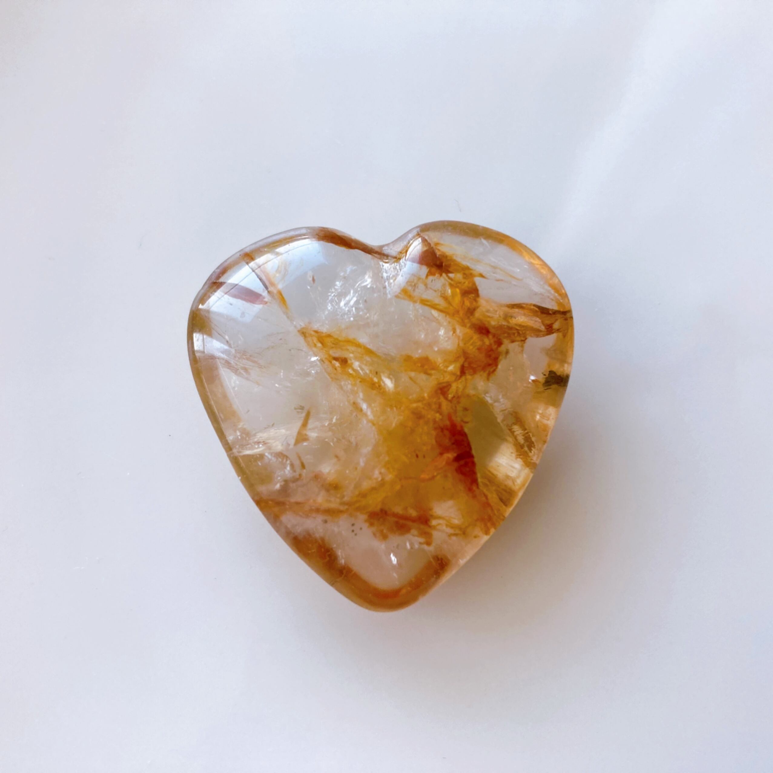 クォーツに入り込むと赤色からオレンジ色に変化するヘマタイト。血行促進にも良いとされています。ハート形のタンブルなので握り石としても使いやすそうです。