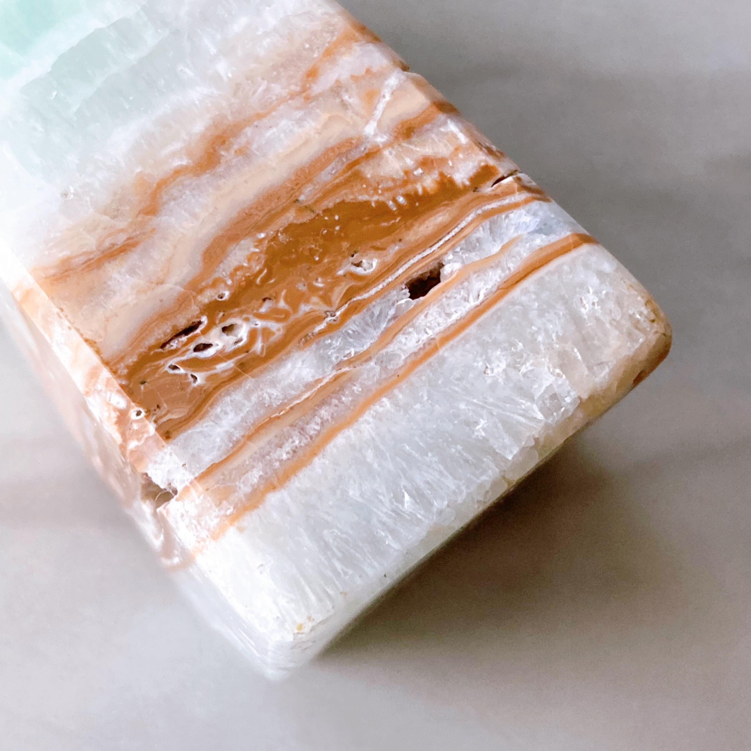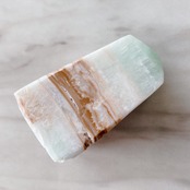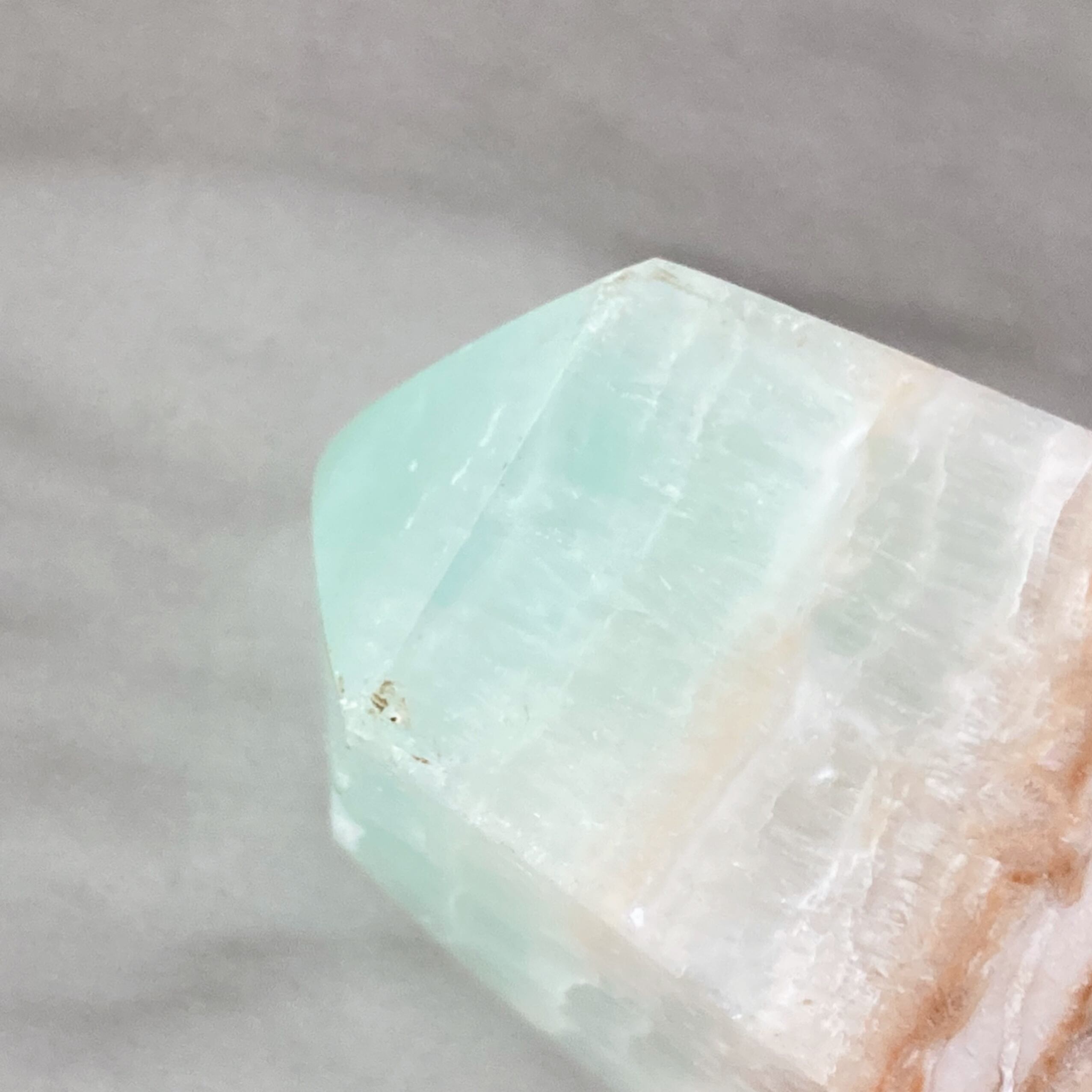淡いブルーと茶色の層が美しい海と砂浜を連想させます。ぽってりとした姿が可愛いクリスタルです。