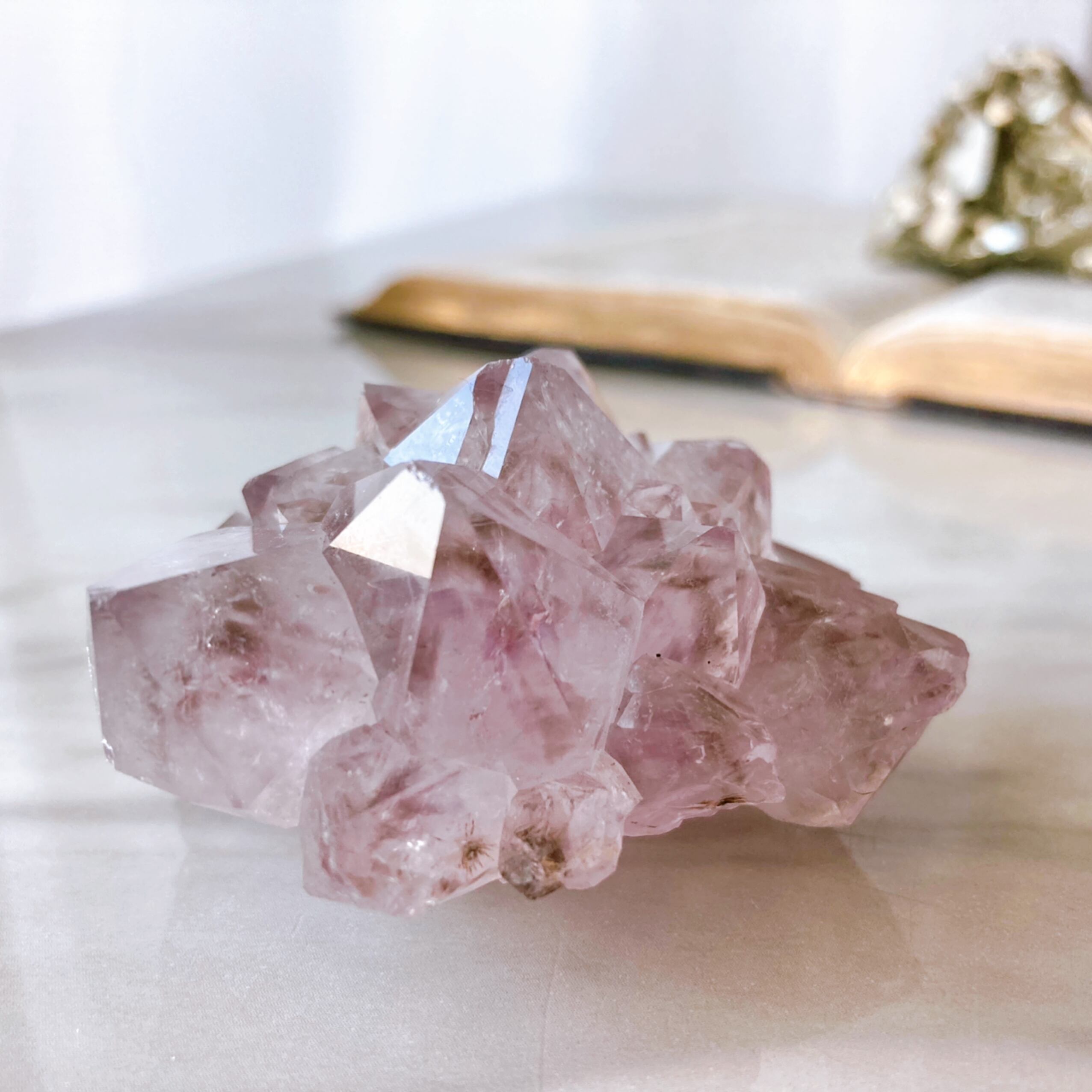 カコクセナイトが内包されたウルグアイ産のアメジストクラスターです。母岩のないお花のような形状、ラベンダーカラー、レインボー、透明感のある輝き、どれをとっても美しいレアなクリスタルです。