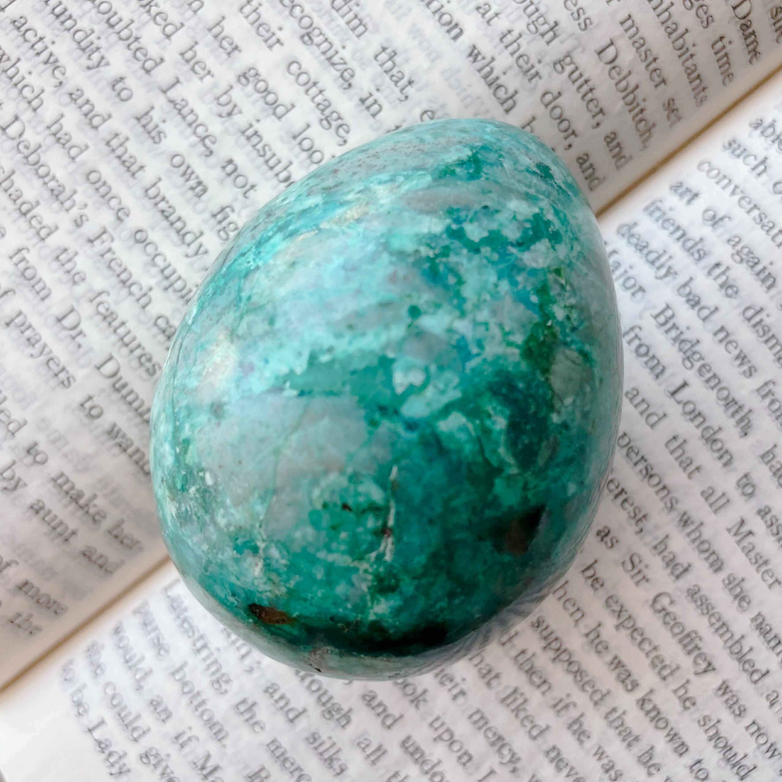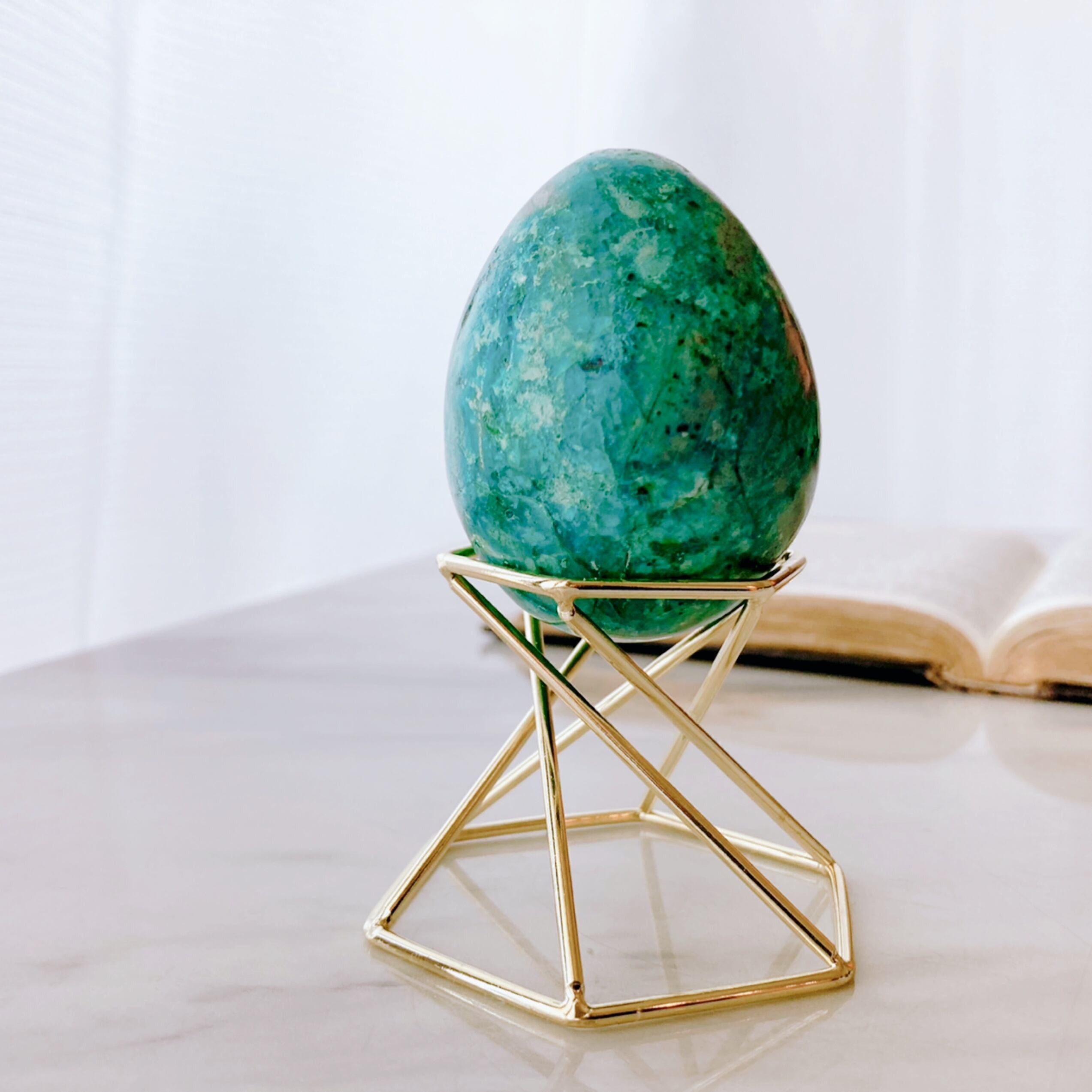 マラカイトやアズライトと混ざり合い、美しいマーブル模様を織りなす鮮やかなブルーグリーンのエッグ型クリソコラ。ゴールドのスフィアスタンド付きです。
