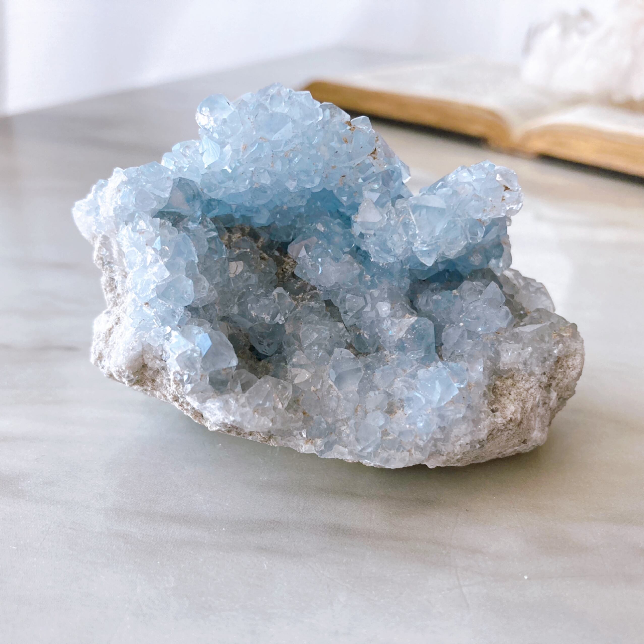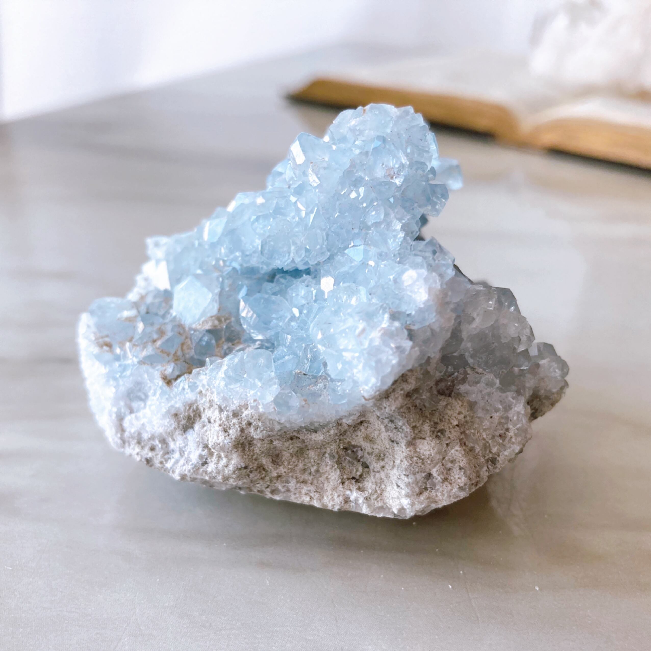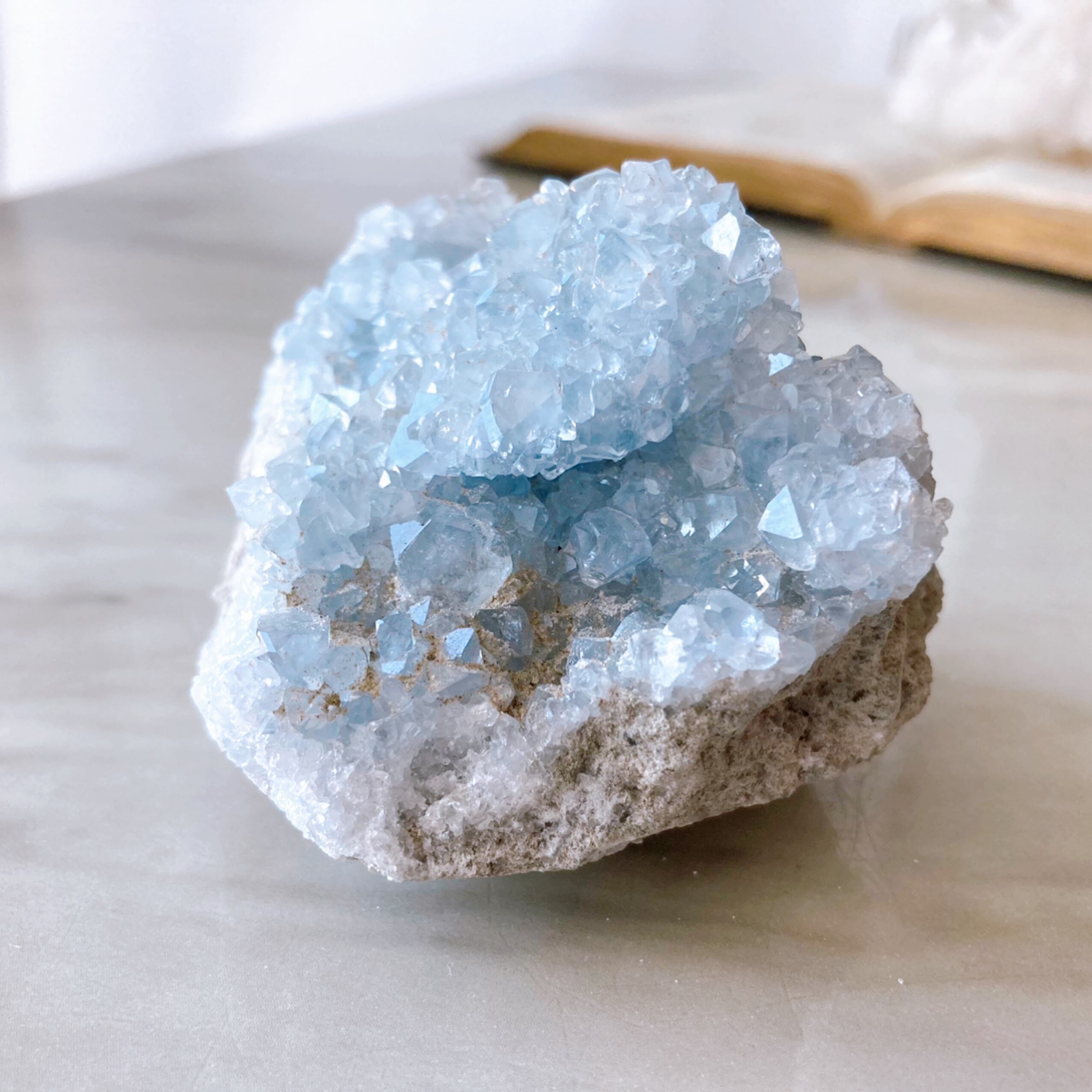 天青石という、青く晴れた空を連想させる和名を持つ、美しいスカイブルーのセレスタイト。ラテン語で「天国のような」という意味も持っています。