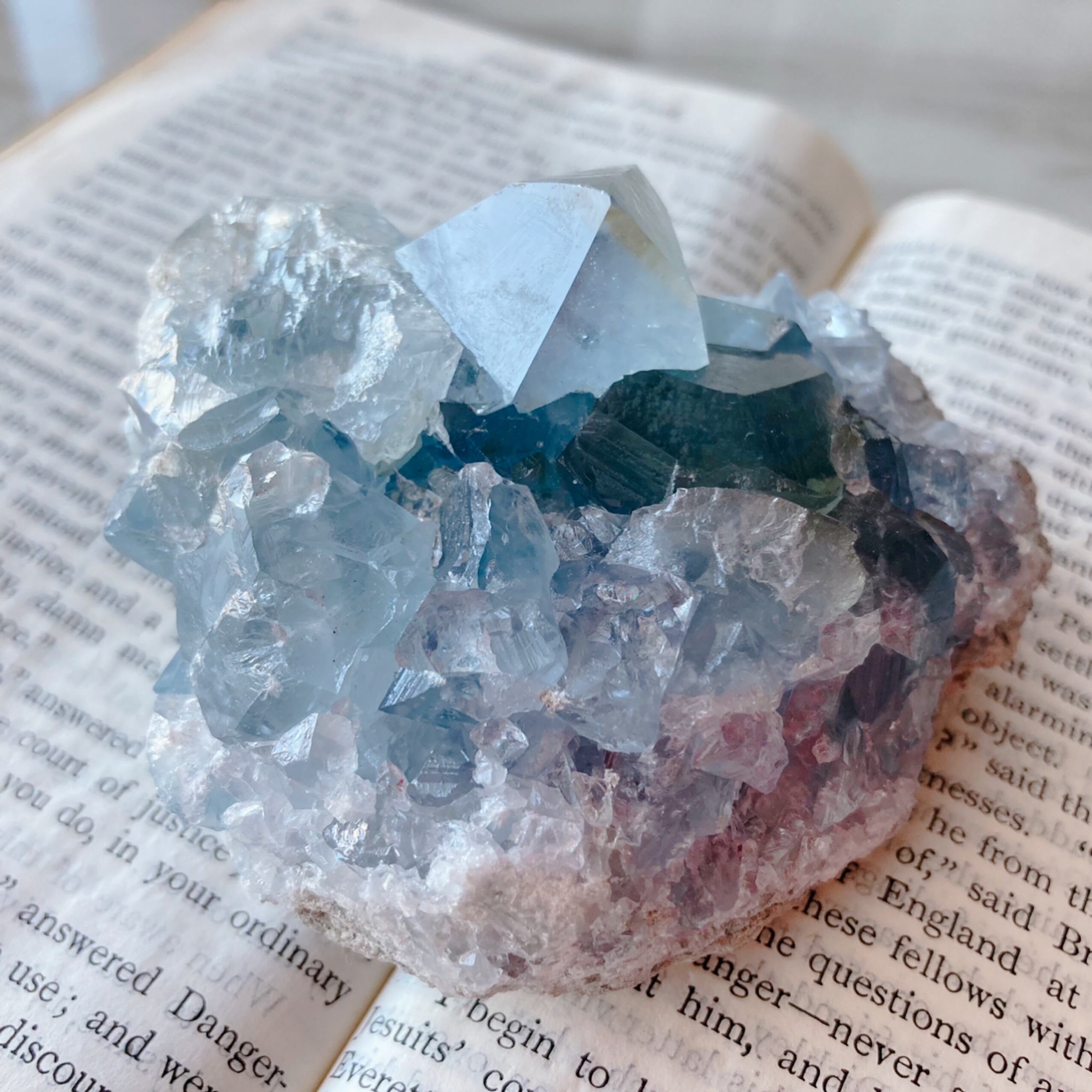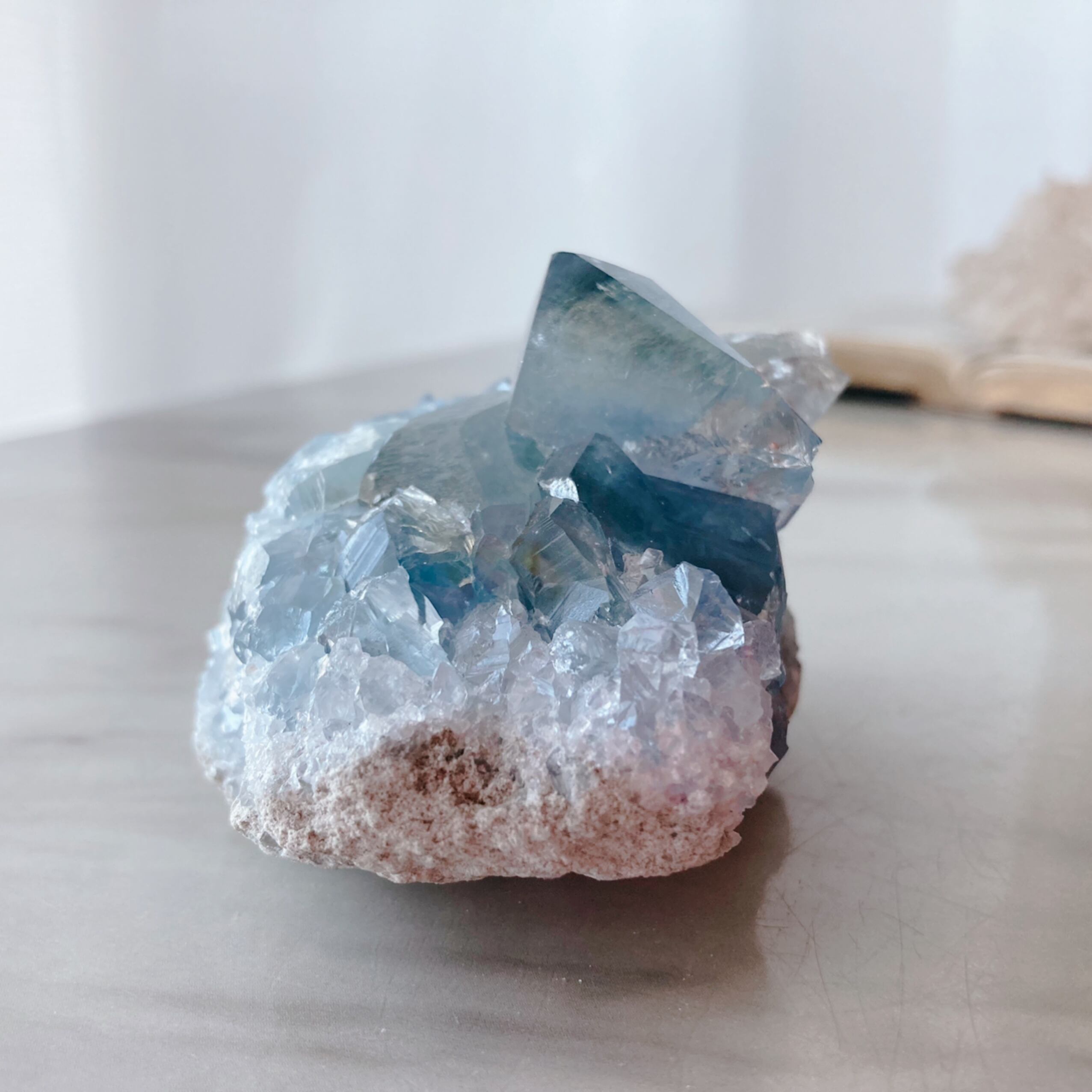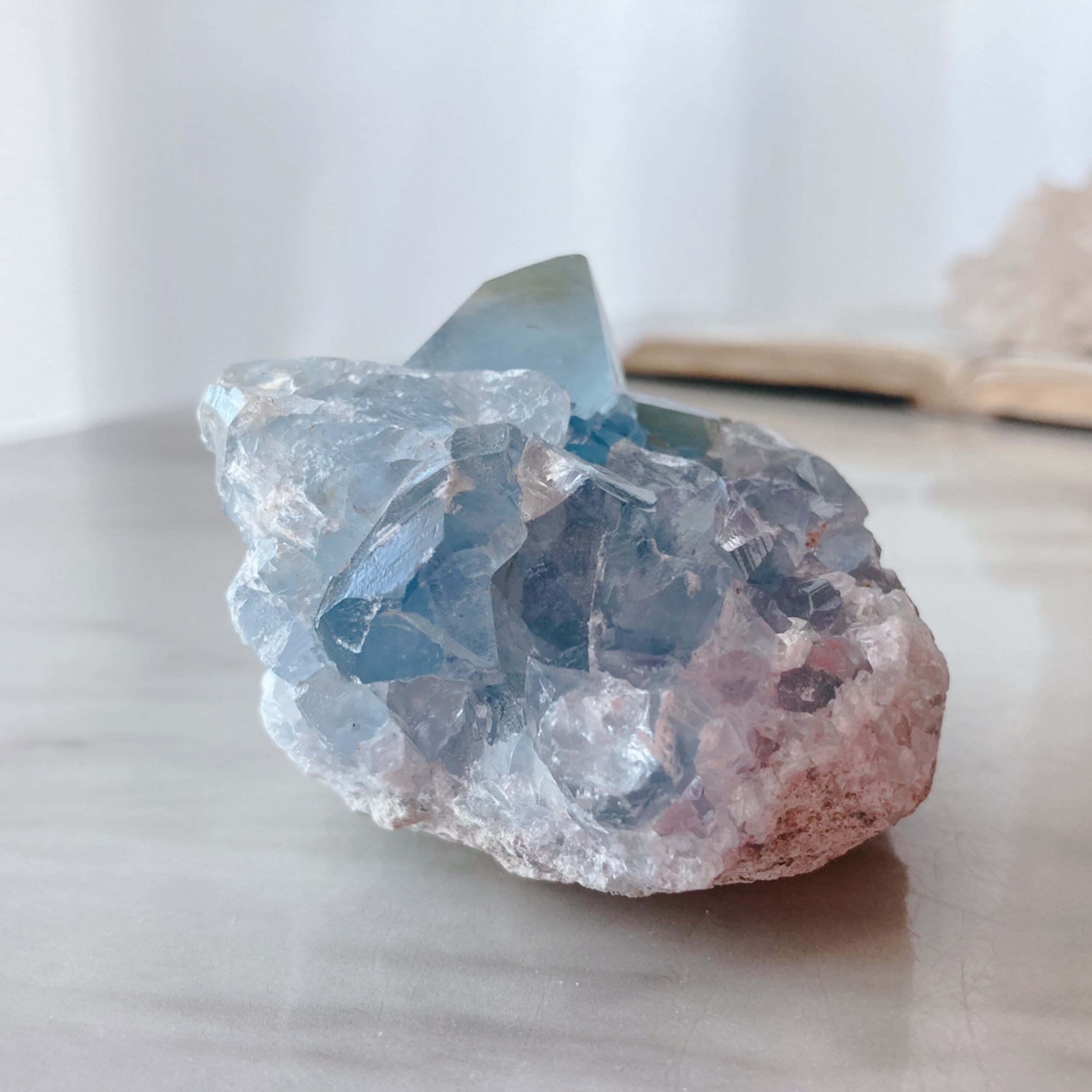 天青石という、青く晴れた空を連想させる和名を持つ、美しいスカイブルーのセレスタイト。ラテン語で「天国のような」という意味も持っています。