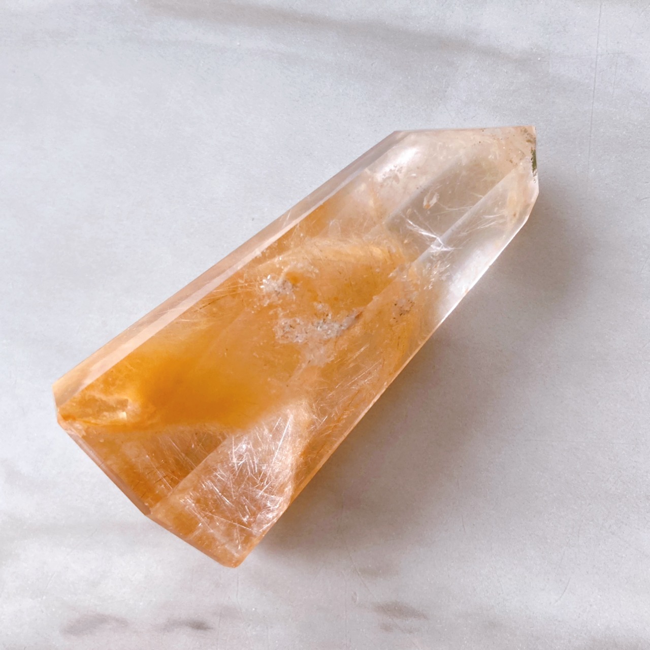 オレンジ色のアンフィボールが美しいクリスタルです。トップにやや欠けが、側面にあたりがありますのでご確認ください。