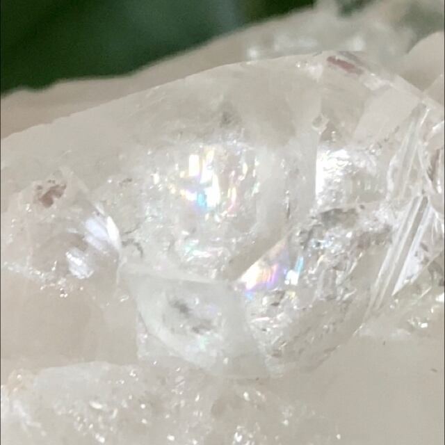 透明感と照りツヤが素晴らしいミニサイズのアーカンソー産の水晶クラスター。一部のポイントがゴールデンヒーラーになっており、レインボーも見られます。