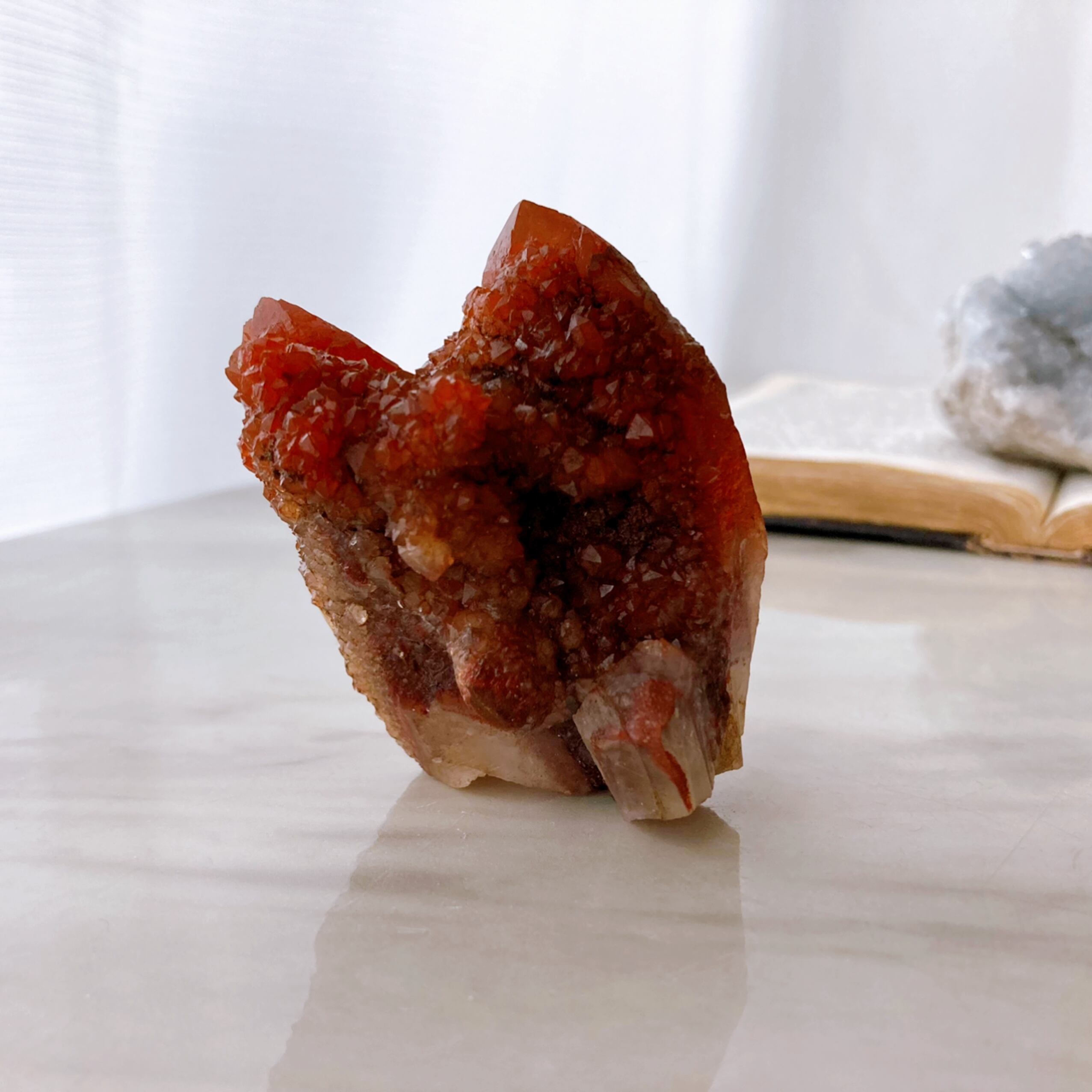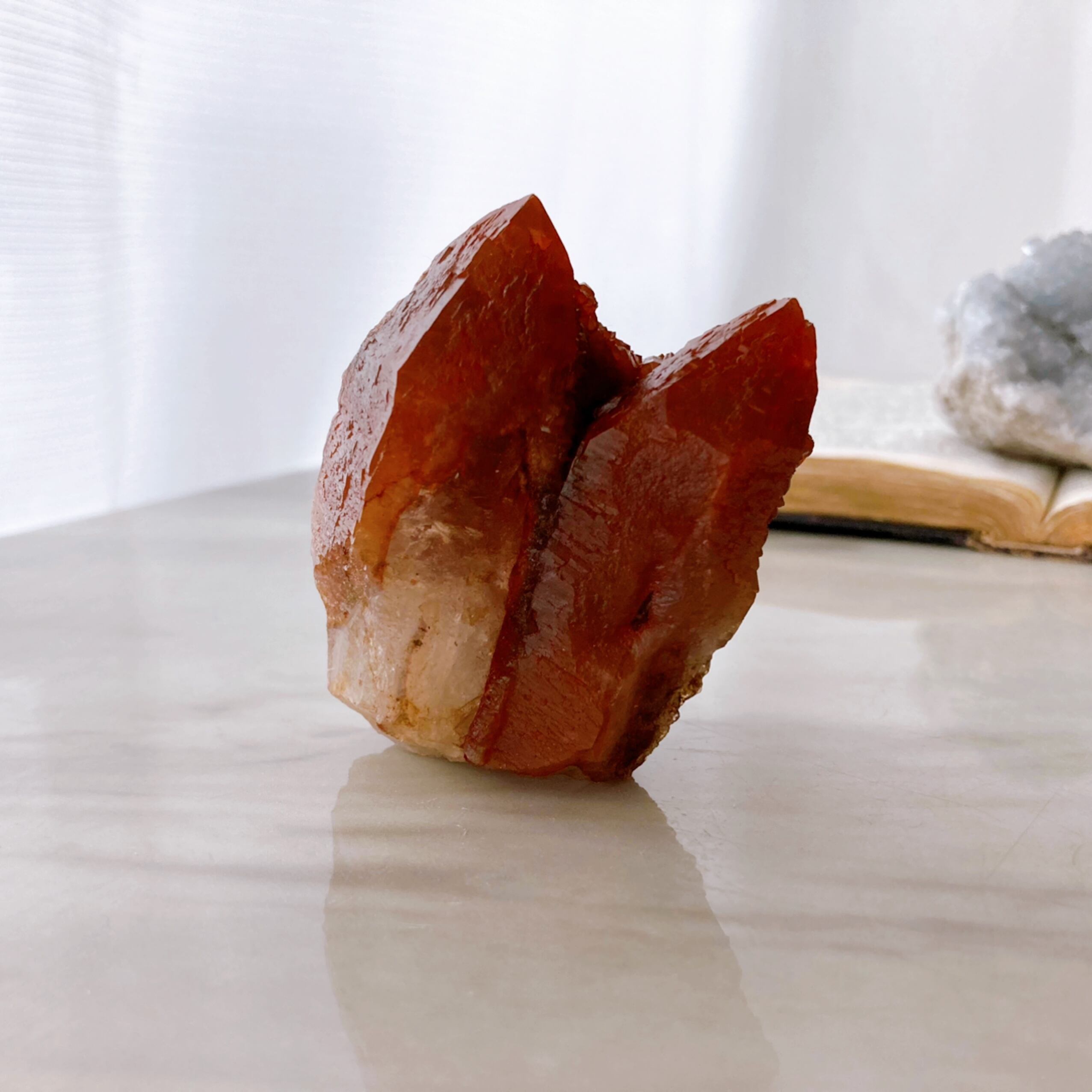ツインのポイントに細かい結晶がキラキラ輝くレッドスピリットクォーツです。レコードキーパーとトライゴーニックも見られます。