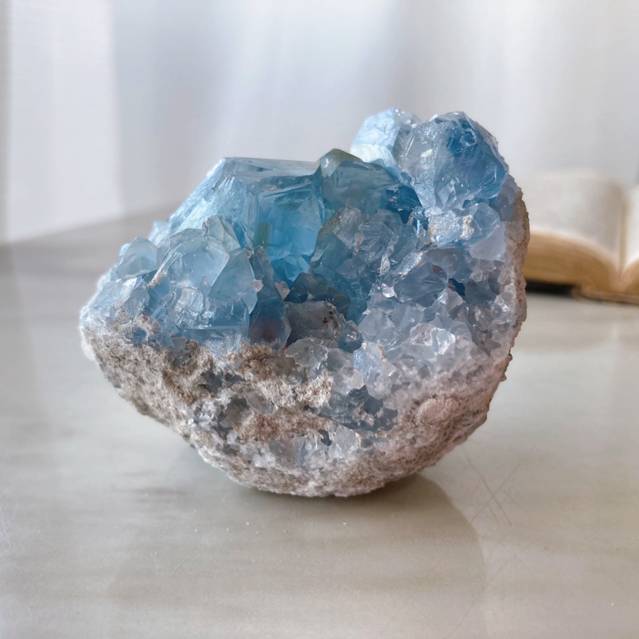 天青石という、青く晴れた空を連想させる和名を持つ、美しいスカイブルーのセレスタイト。ラテン語で「天国のような」という意味も持っています。