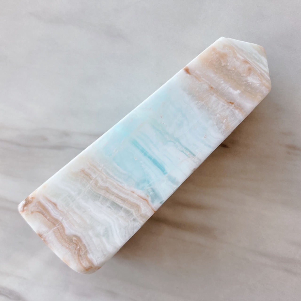淡いブルーと茶色の層が美しい海と砂浜を連想させます。