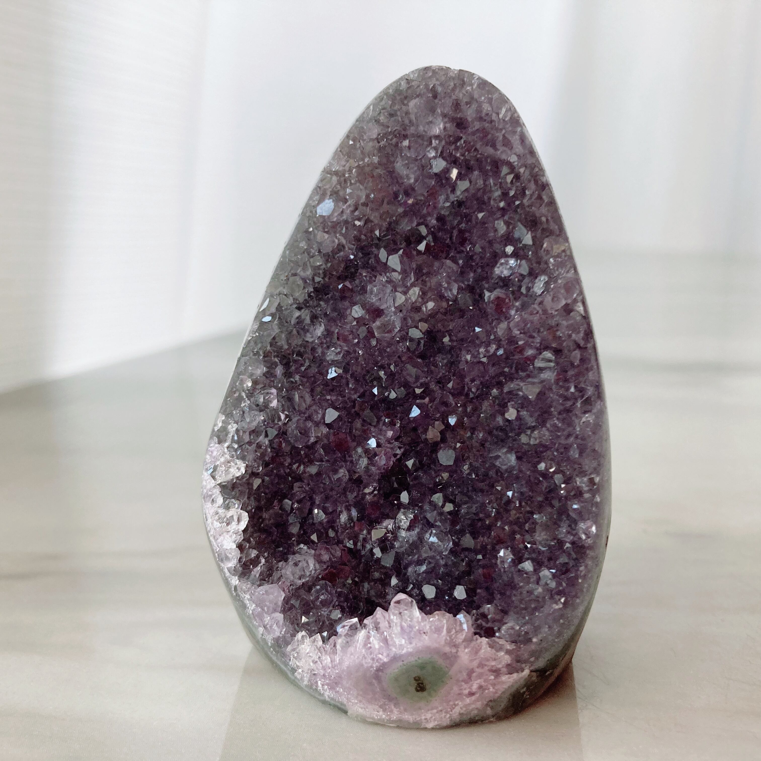 手のひらサイズのウルグアイ産アメジストミニクラスターです。玄関やトイレ、お部屋のインテリアに。