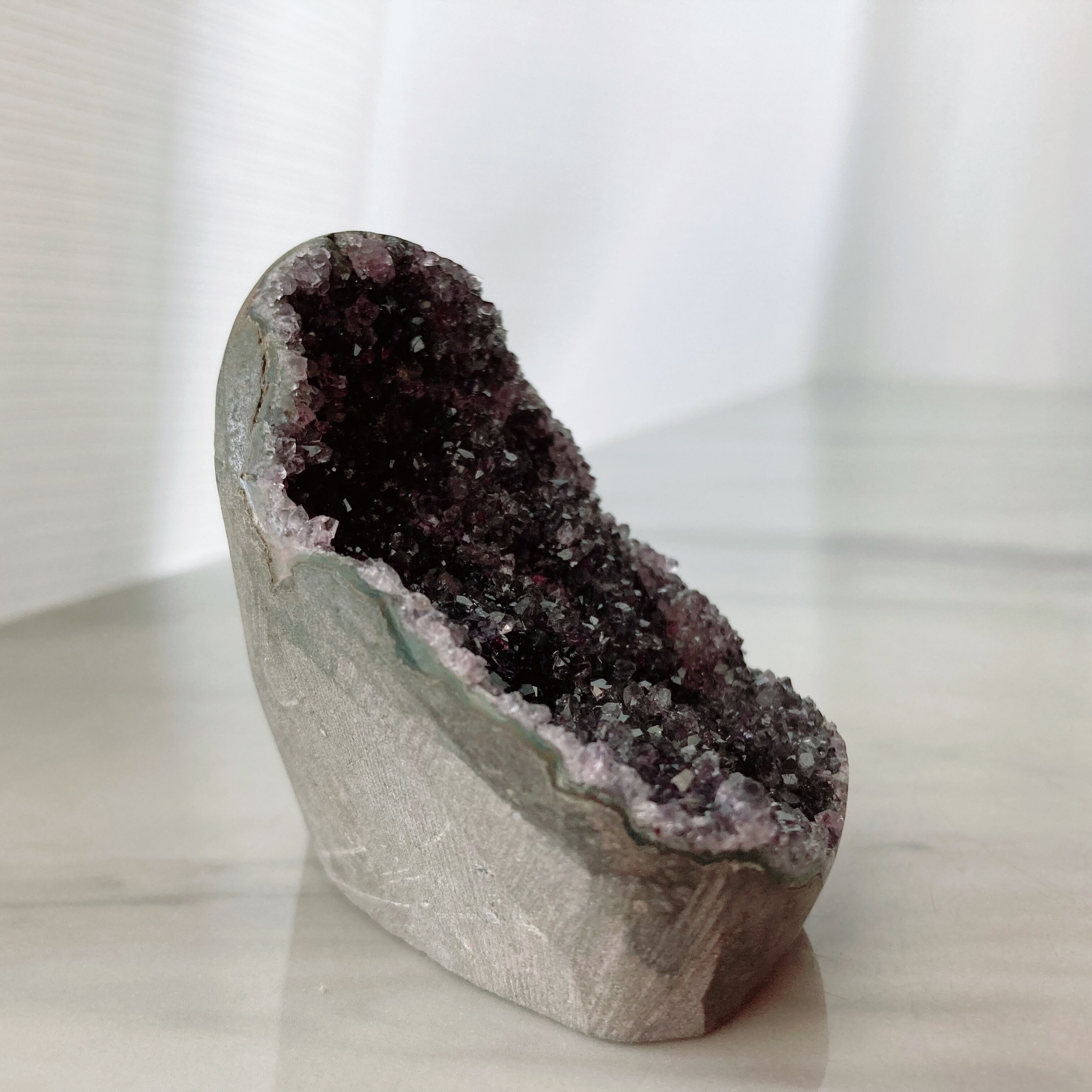 淡いパープルとグレーを混ぜたような色味。クリアクォーツが周りを取り囲んでいるように見える横顔もステキです。