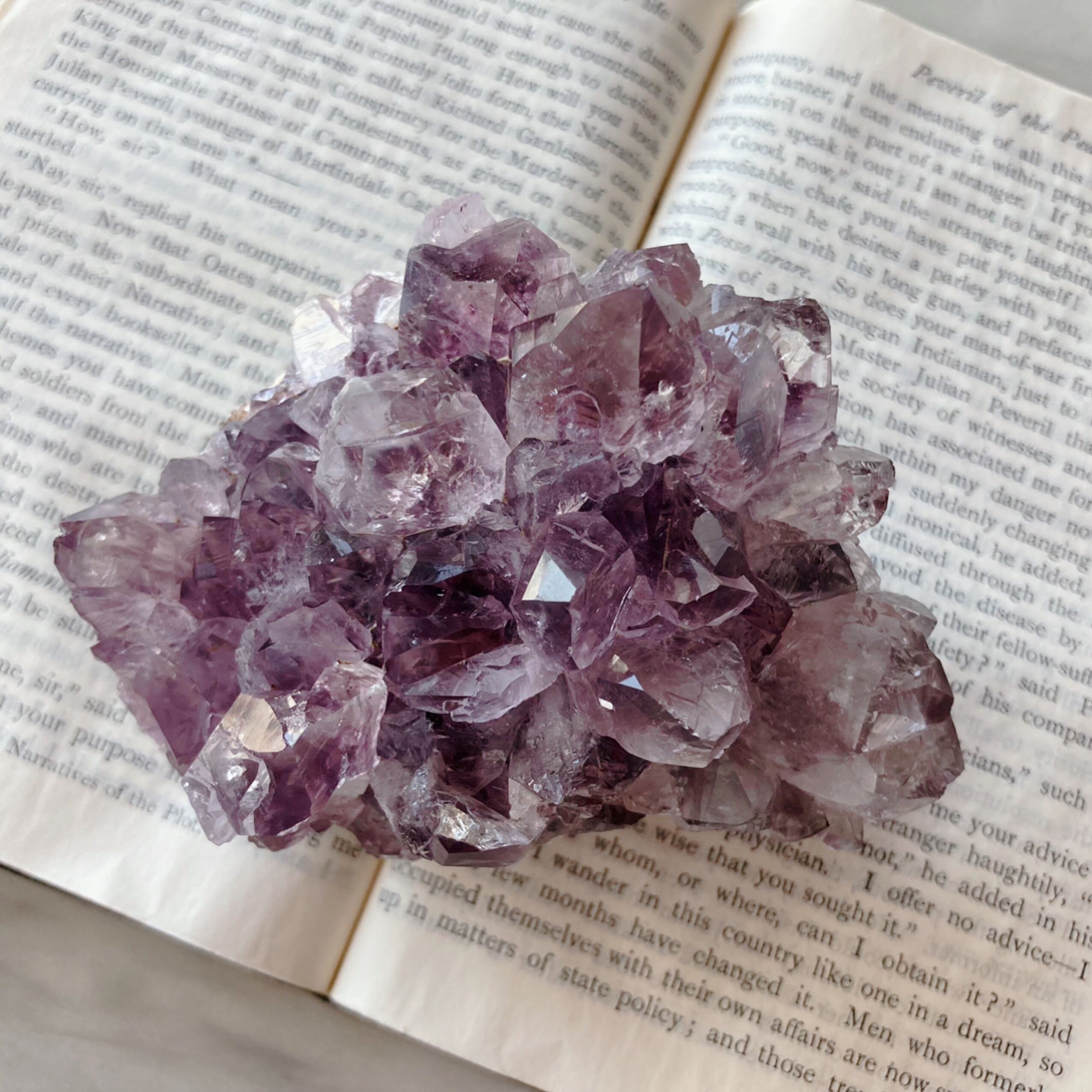 母岩がなく、お花が開花したような形のアメジストクラスター。クリアなクォーツの中にほんのりパープルが入ったような淡いラベンダーカラーです。