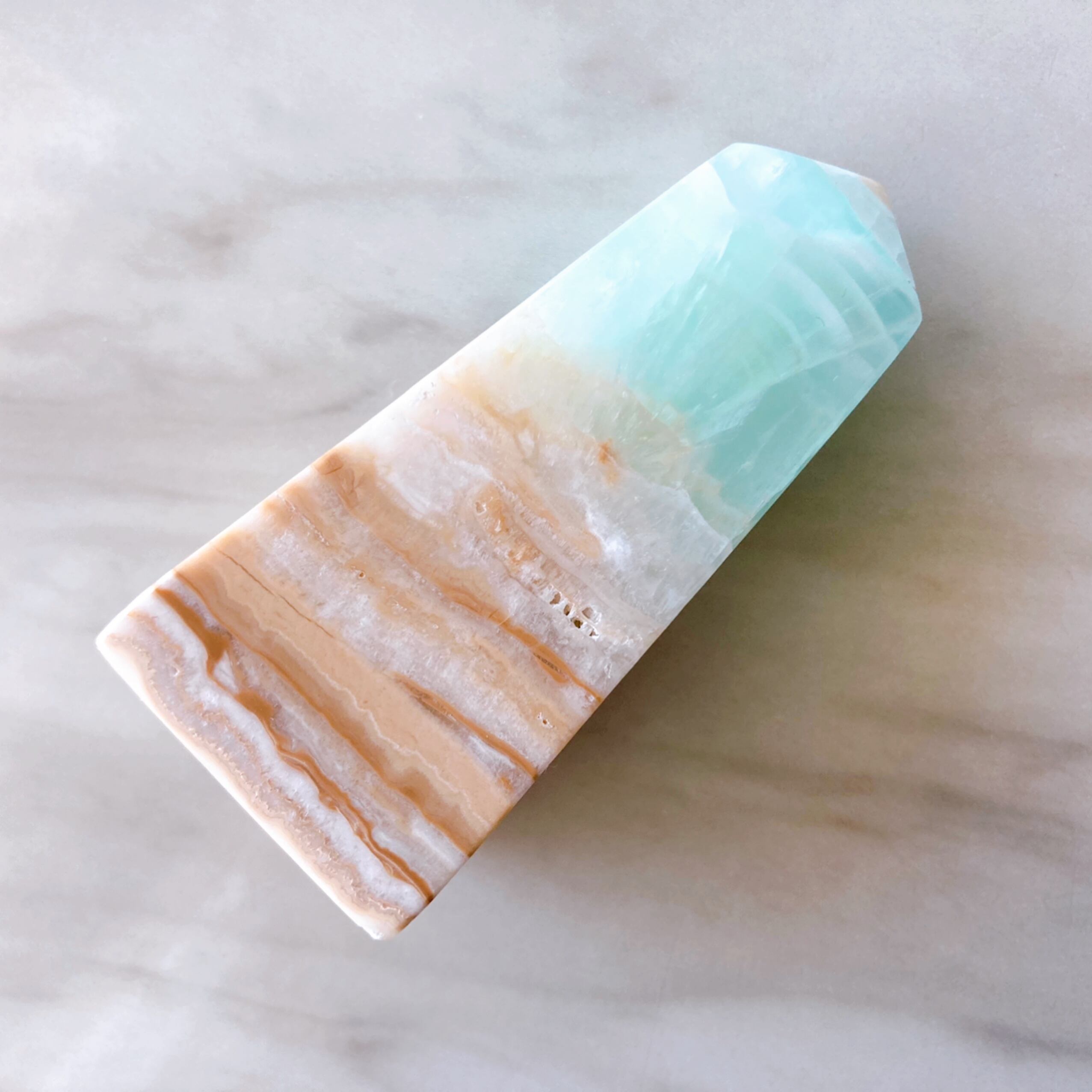 淡いブルーと茶色の層が美しい海と砂浜を連想させます。