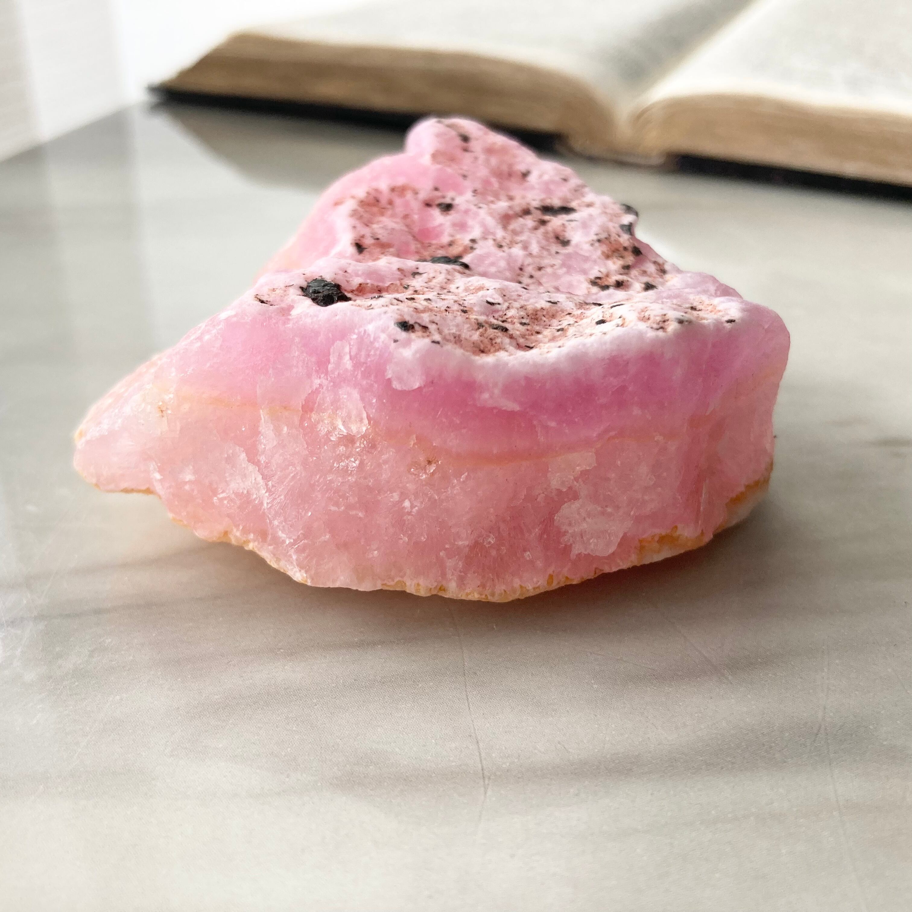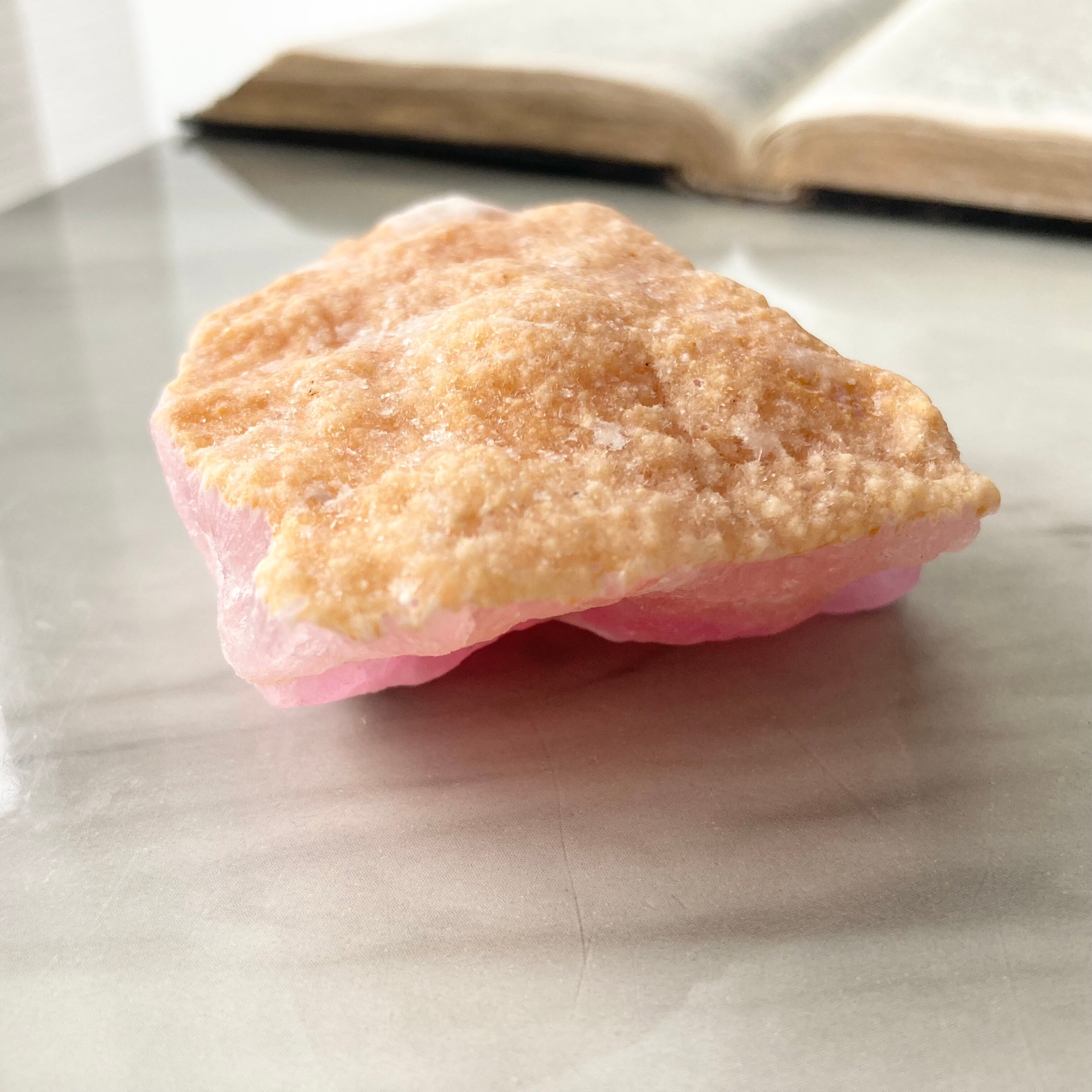 透明感のある鮮やかなピンクとローズピンクの層が素敵なピンクアラゴナイトのラフカットです。