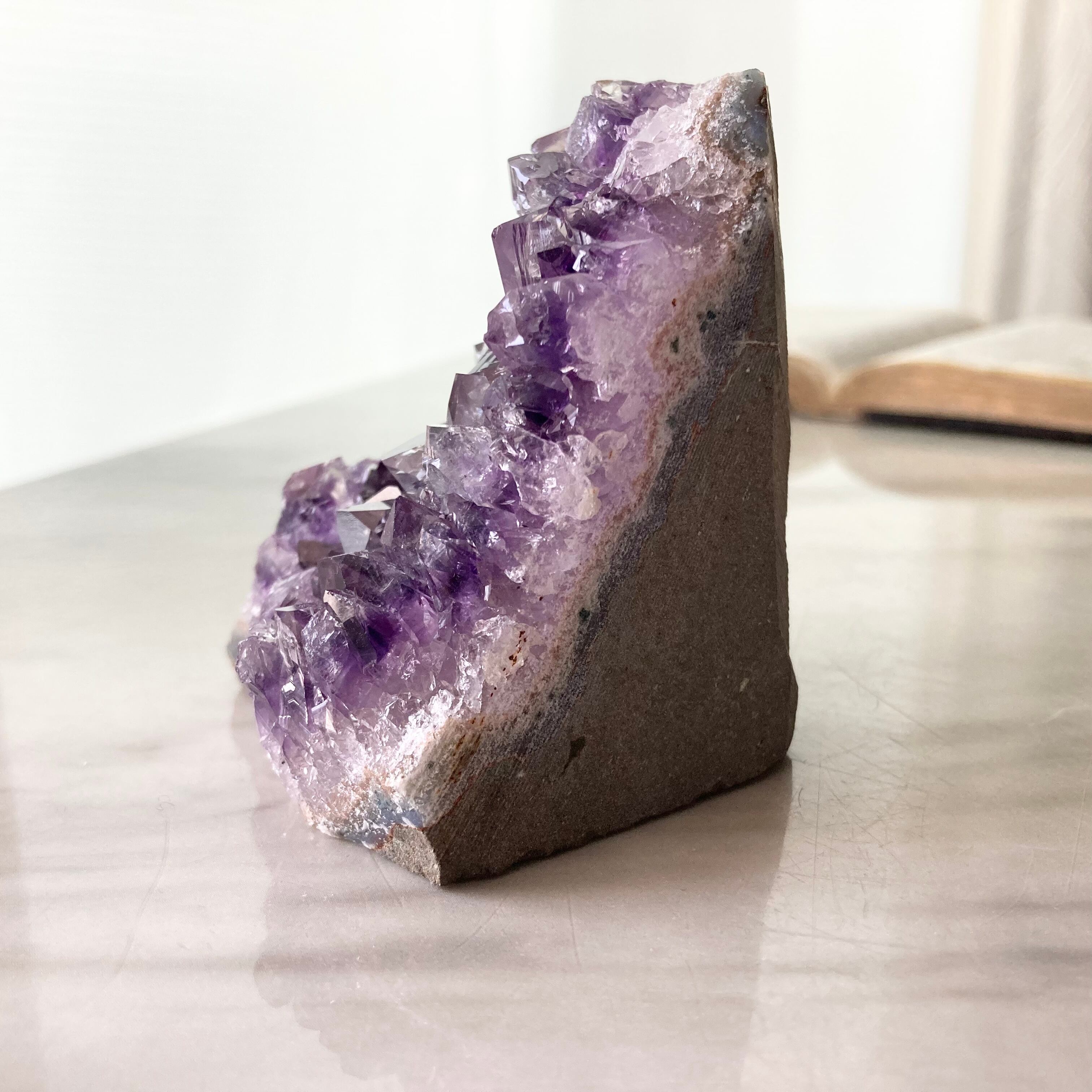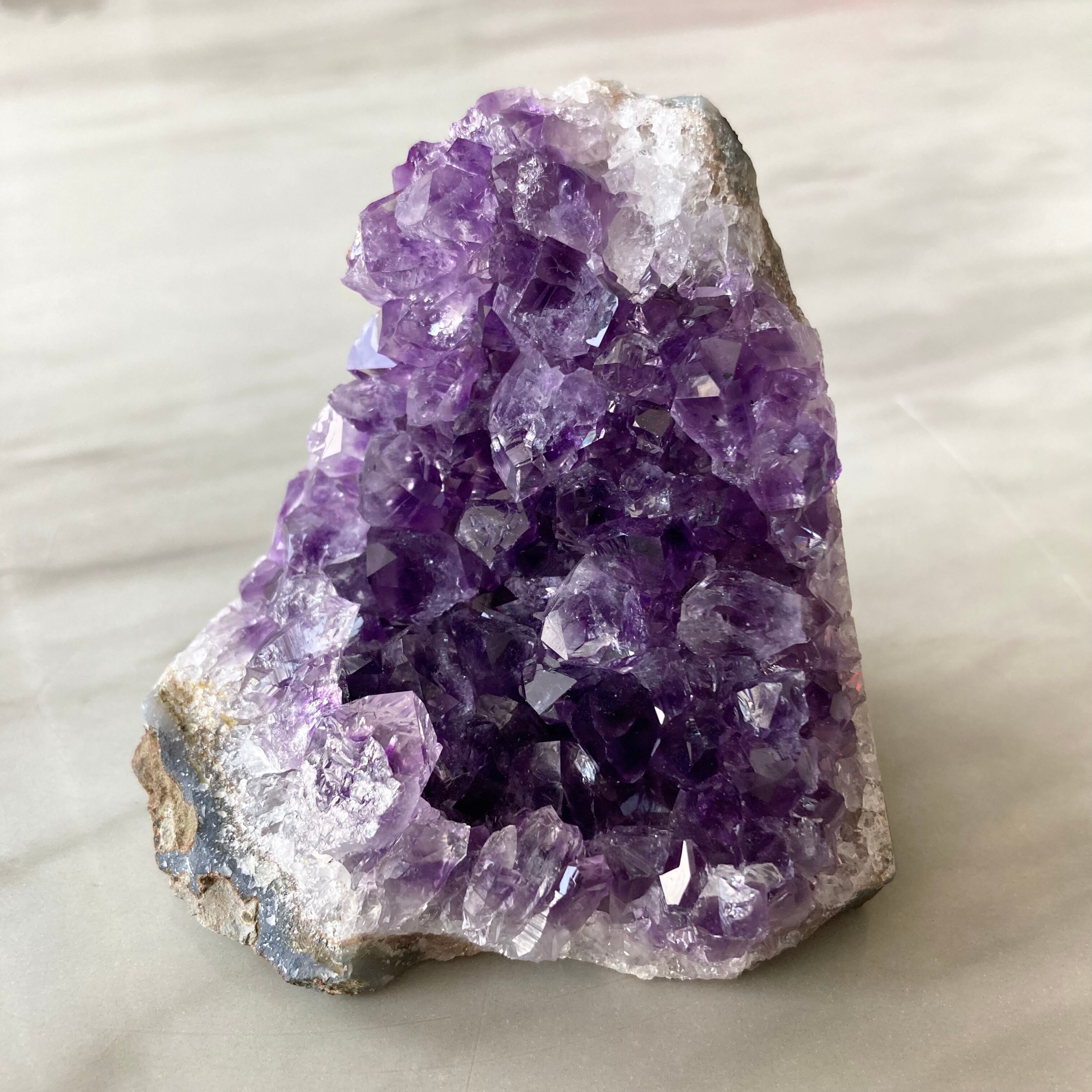 濃いパープルの結晶が美しいアメジストクラスターです。小さめのドーム型なので玄関やお部屋のインテリアにもピッタリです。