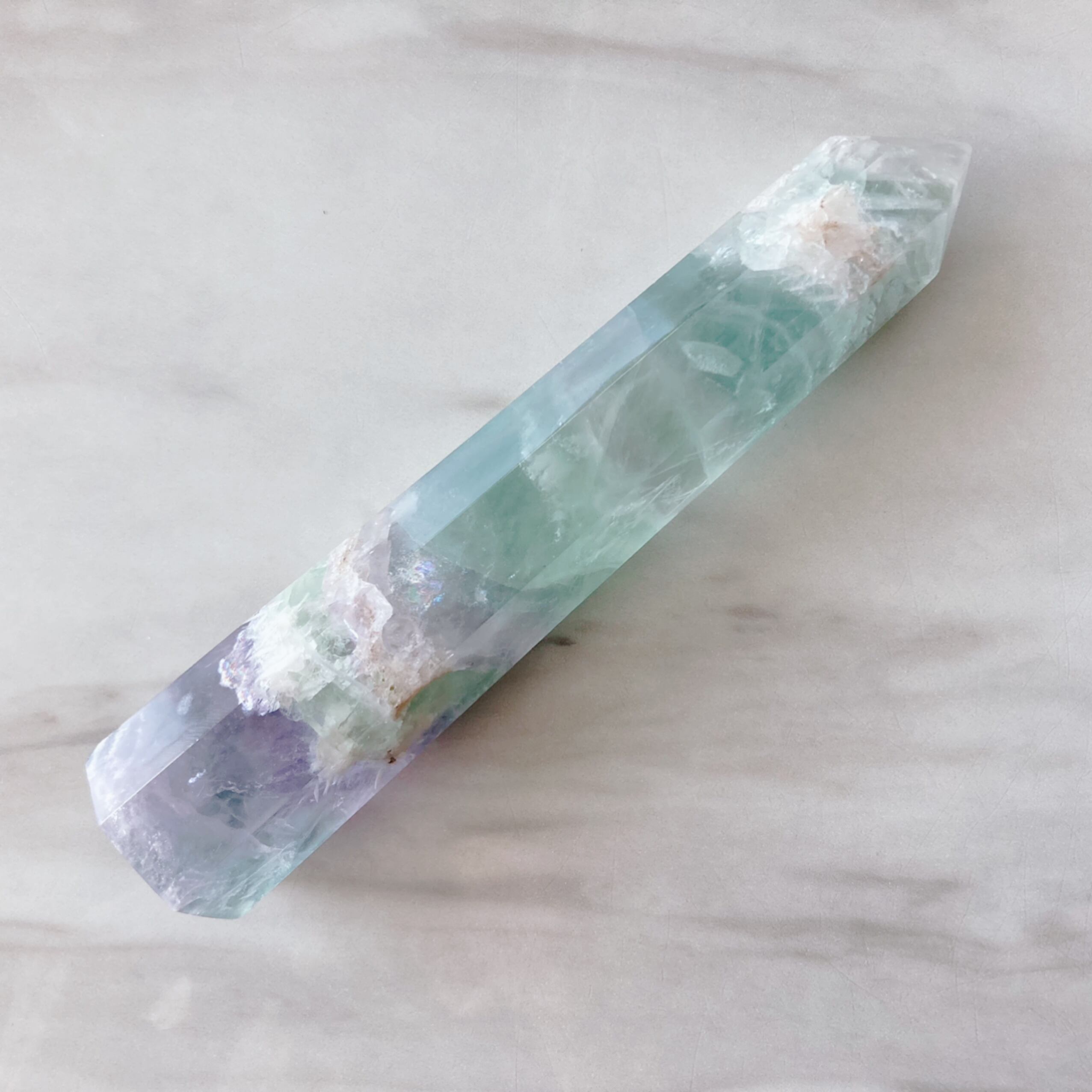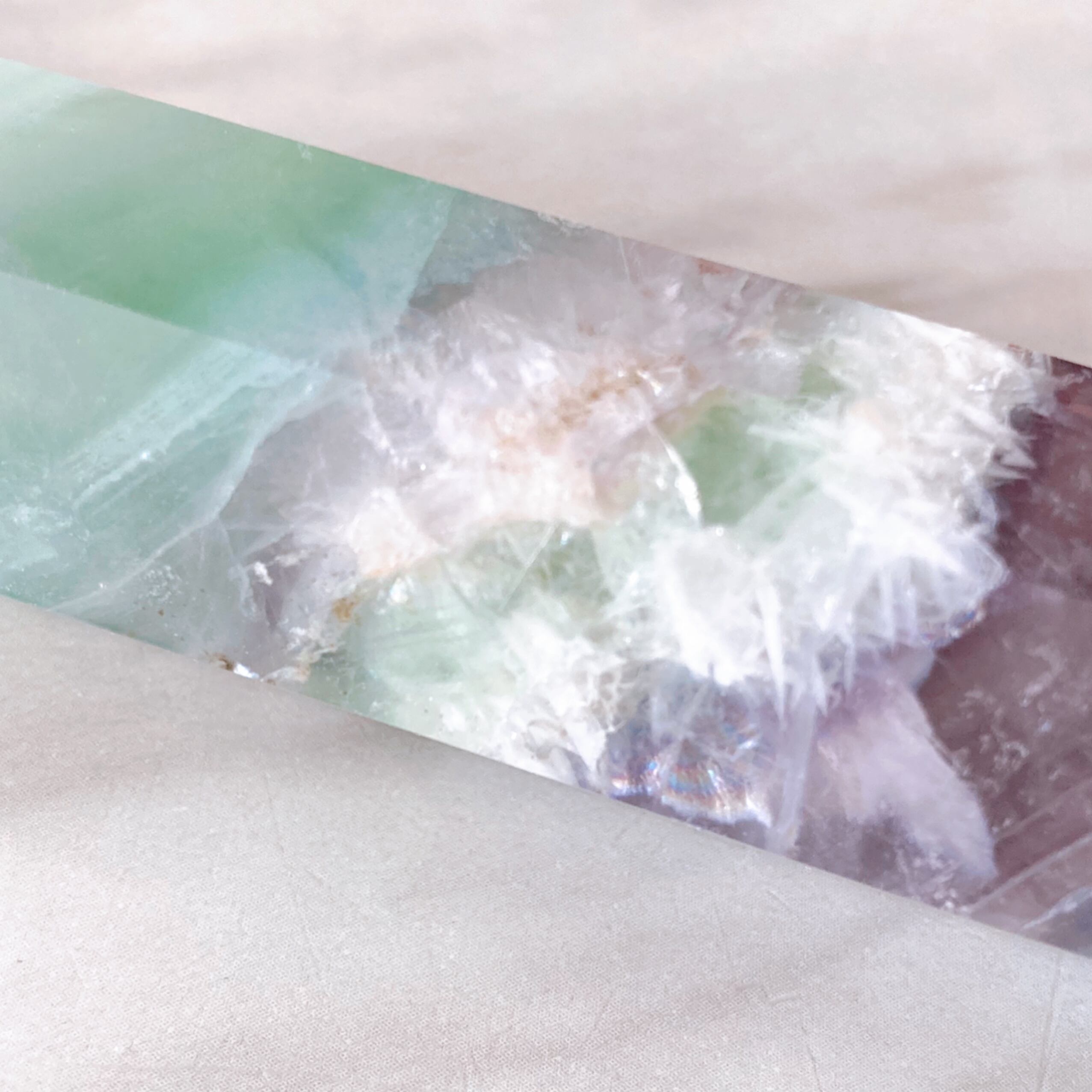 淡いグリーン、ブルー、パープルの色味と虹がキレイなエンジェルフェザーフローライトタワーです。