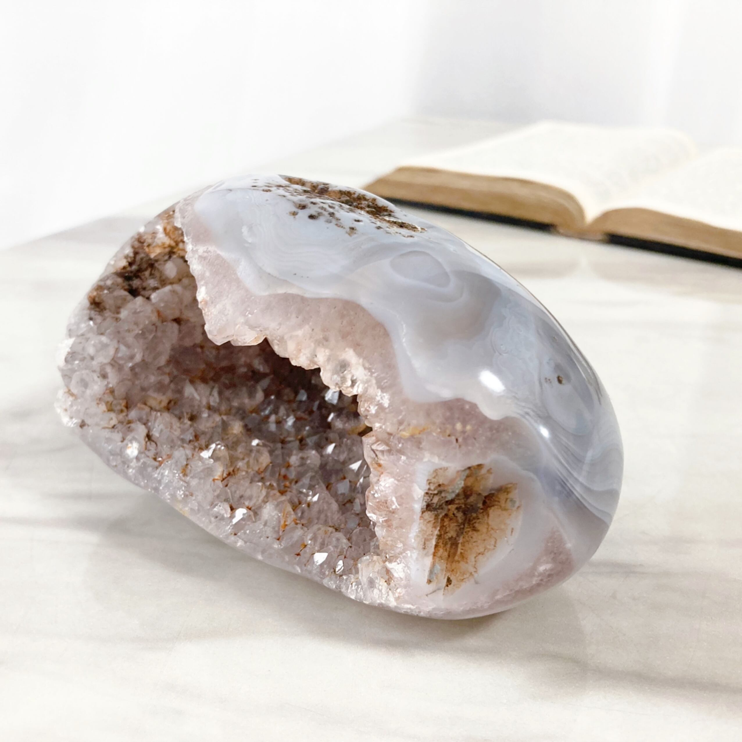 笑い口のアメジストジオードとブルーレースアゲートが共生しています。結晶はほんのりピンクがかったラベンダーカラーです。