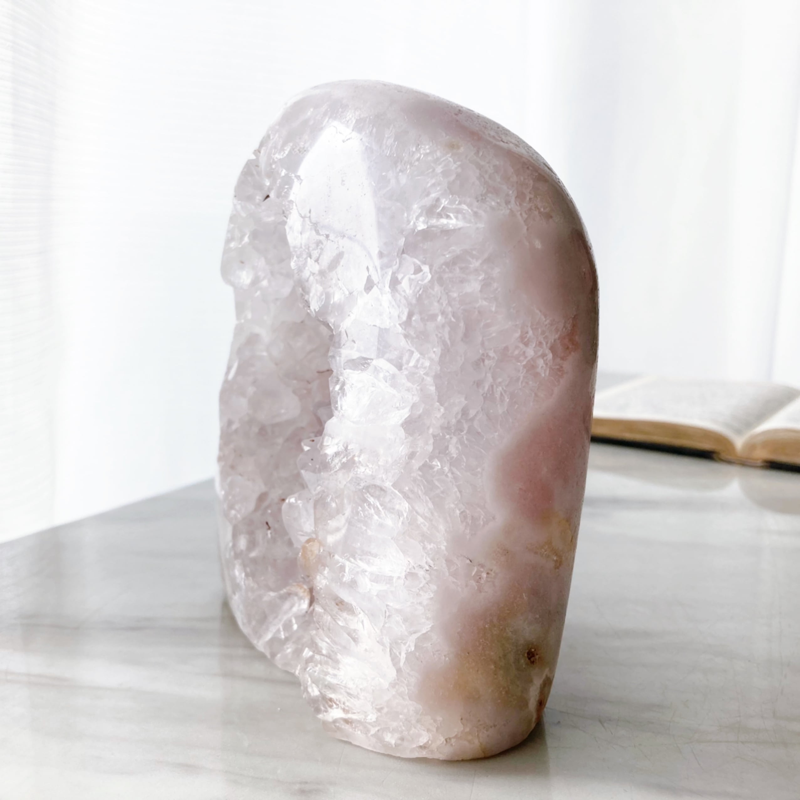 こちらは、レアなピンクアメジストのドームです。クリアクォーツと淡いピンクの結晶がキラキラ輝き、とてもキレイです。側面にはフラワーが見られます。