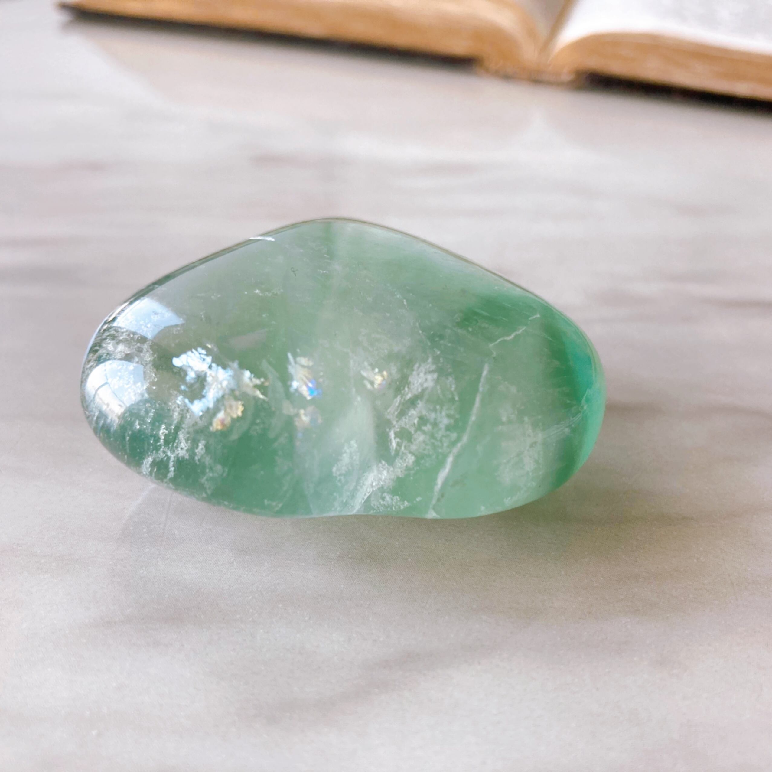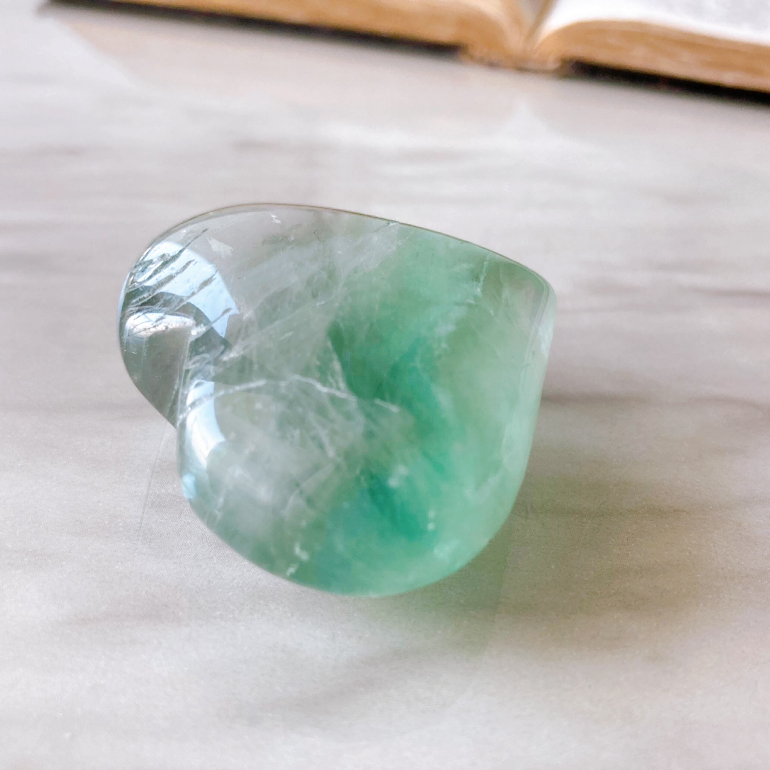 ハート型のフローライトです。ぷっくりとした形とレインボーがキレイです。淡いグリーンに濃いグリーンのラインが入っています。