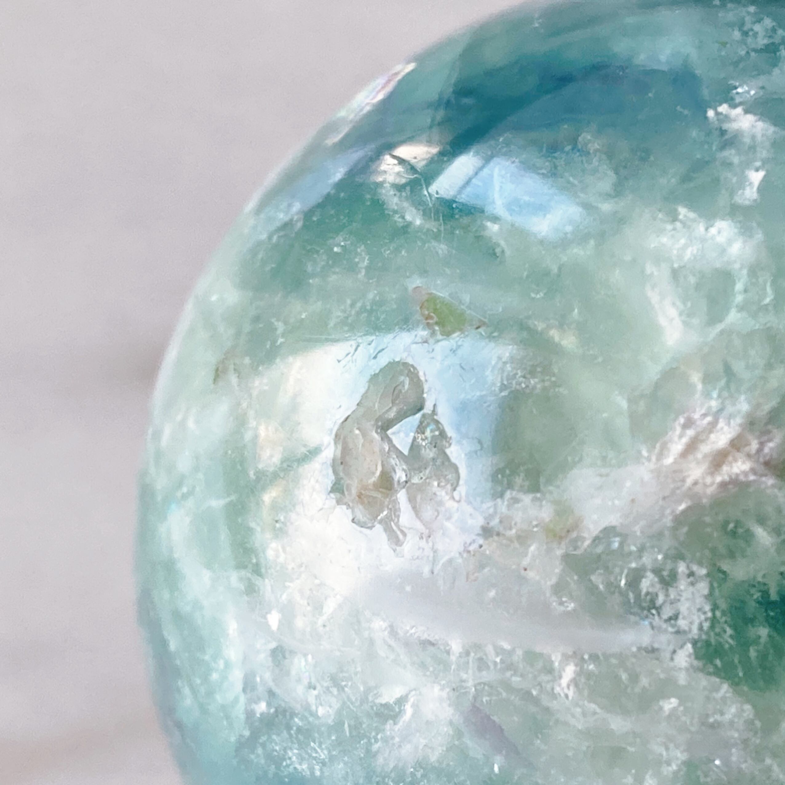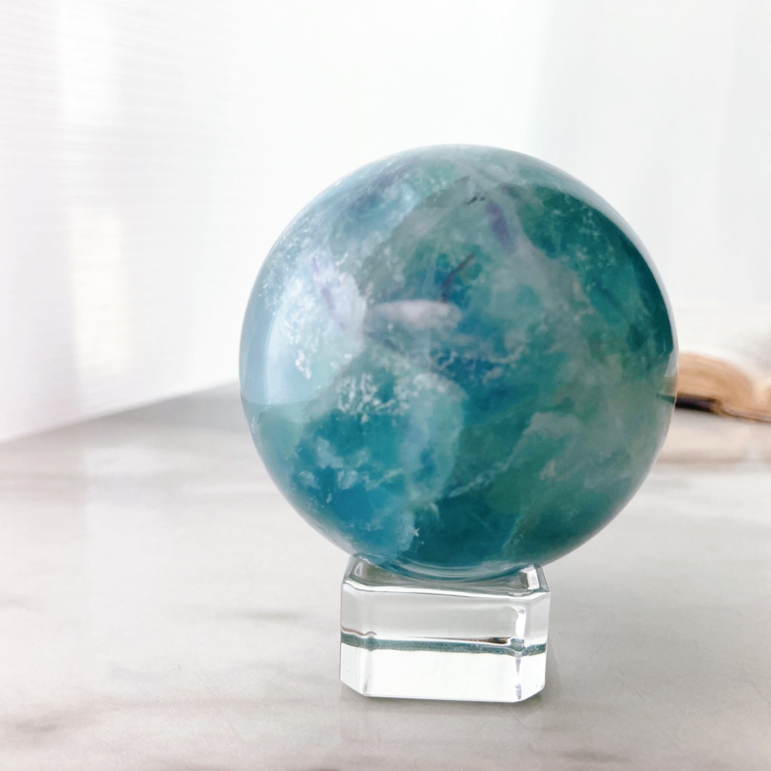 濃いめのブルーにグリーンを混ぜたようなカラーと虹がキレイなエンジェルフェザーフローライトのスフィアです。