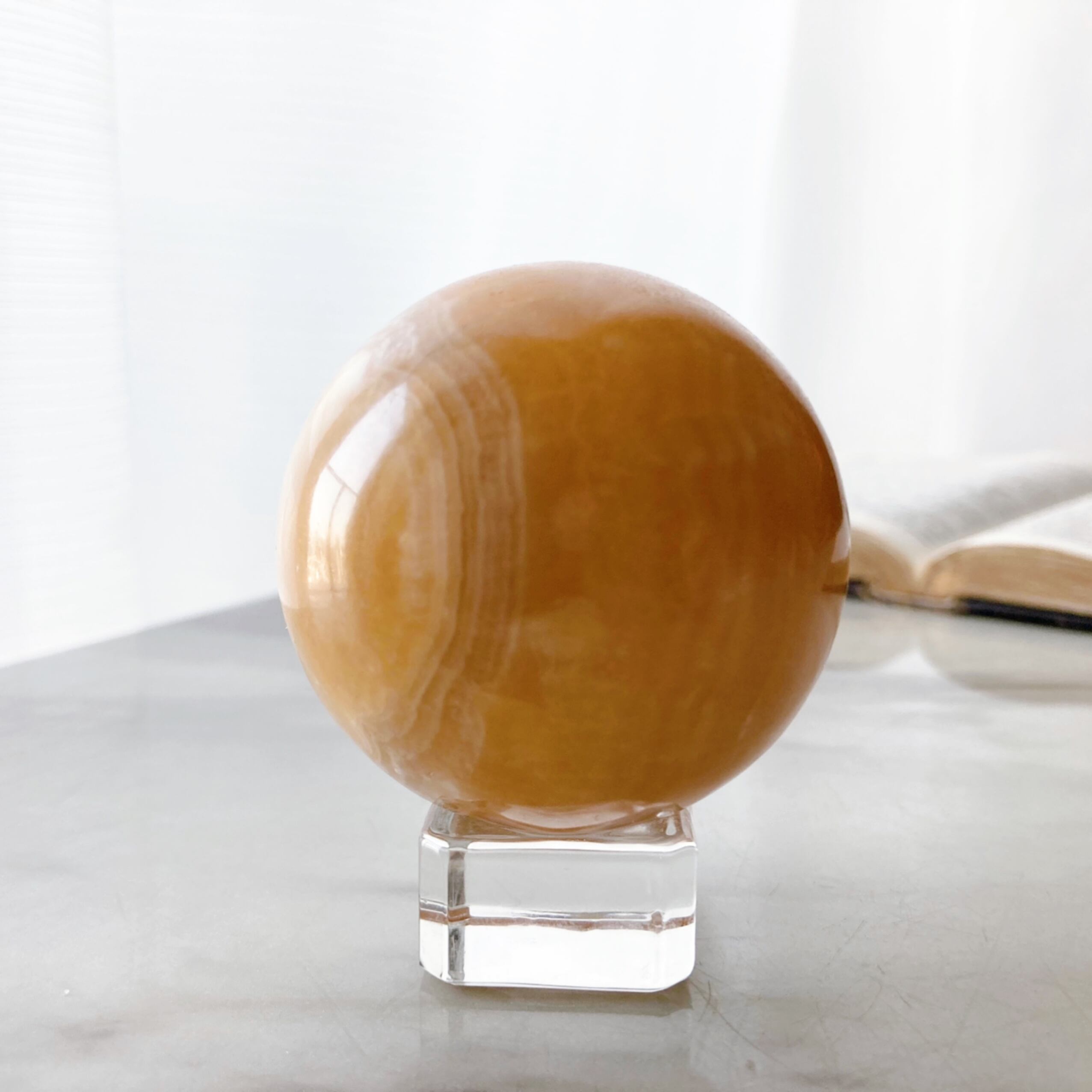 オレンジカルサイトのスフィアです。個性的な模様のため、アウトレット価格でのご提供です。クリアガラスのスタンドをお付けします。