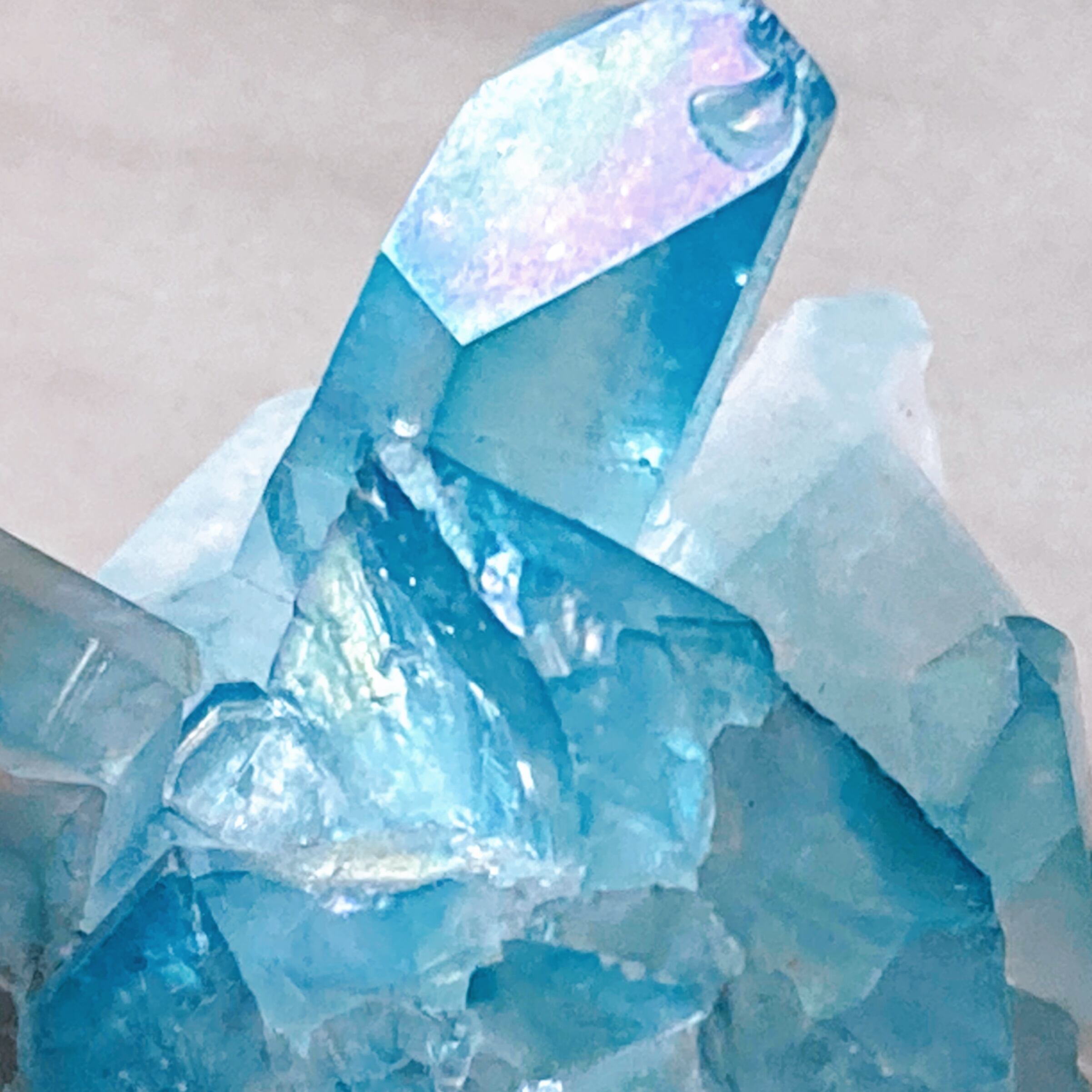 ○アクアオーラは透明な水晶を約1600度まで加熱 し、イオン化した金を真空蒸着させるという錬金術的な手法を用いて作られる、言わば自然と科学の融合とも言うべき石であり、実際にこの石は古代アトランティス大陸において作られていたとされます。