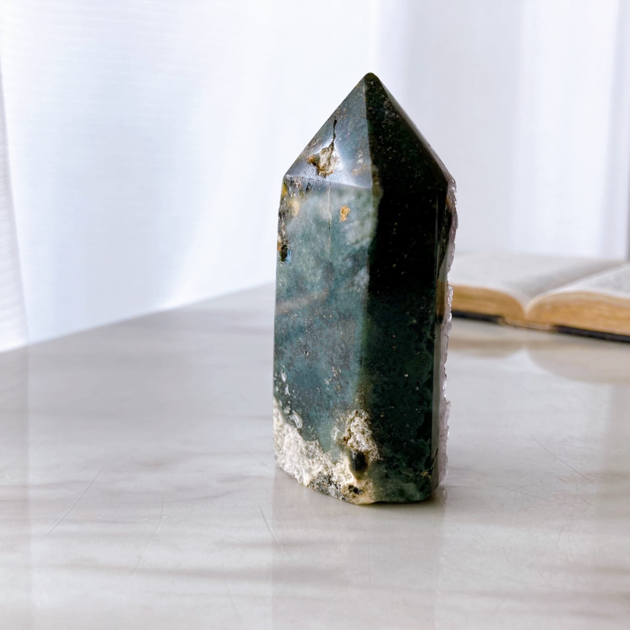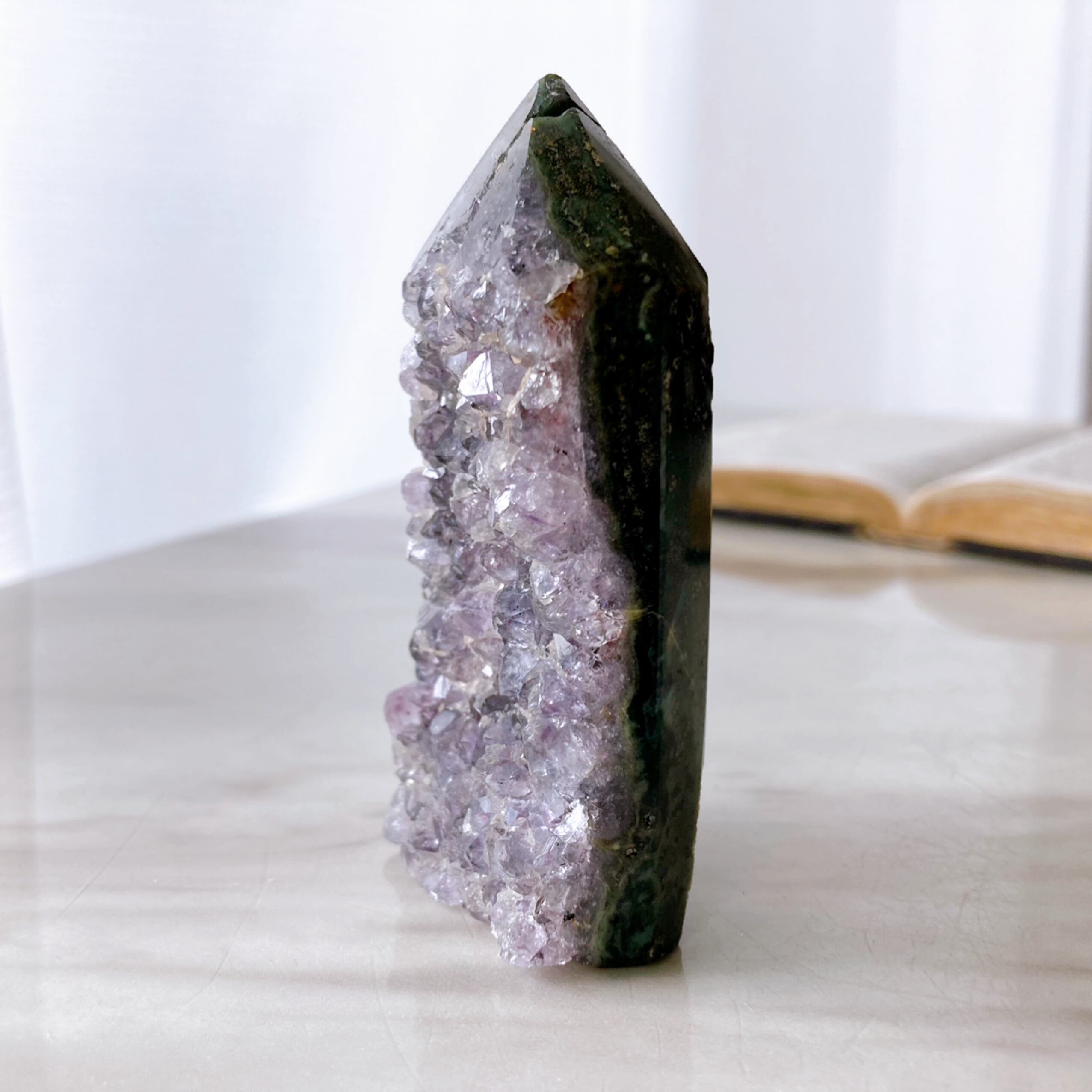 ラベンダーアメジストのドゥルージーアゲートタワーです。キラキラ輝くドゥルージーの背面には深いグリーンのアゲートが共生しています。