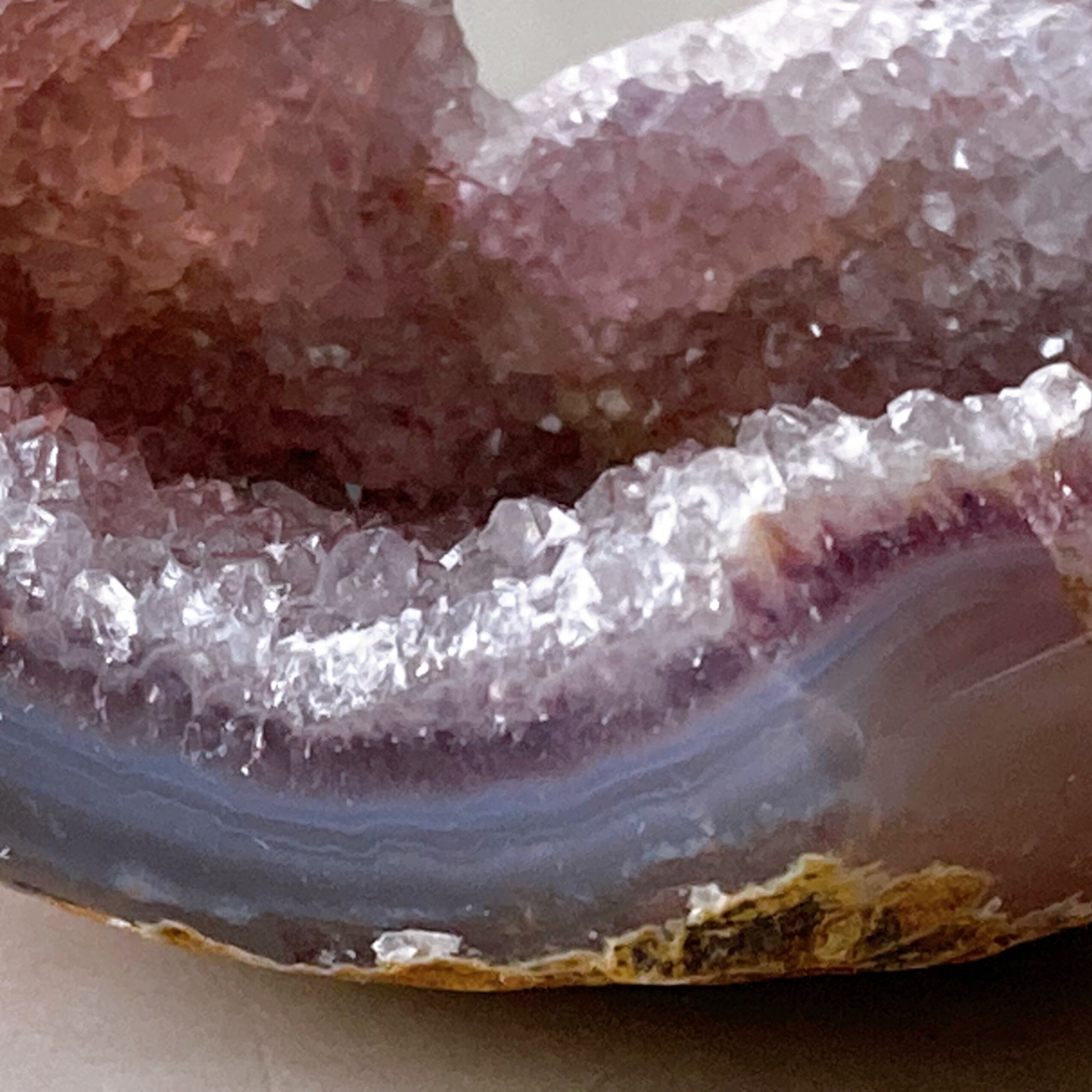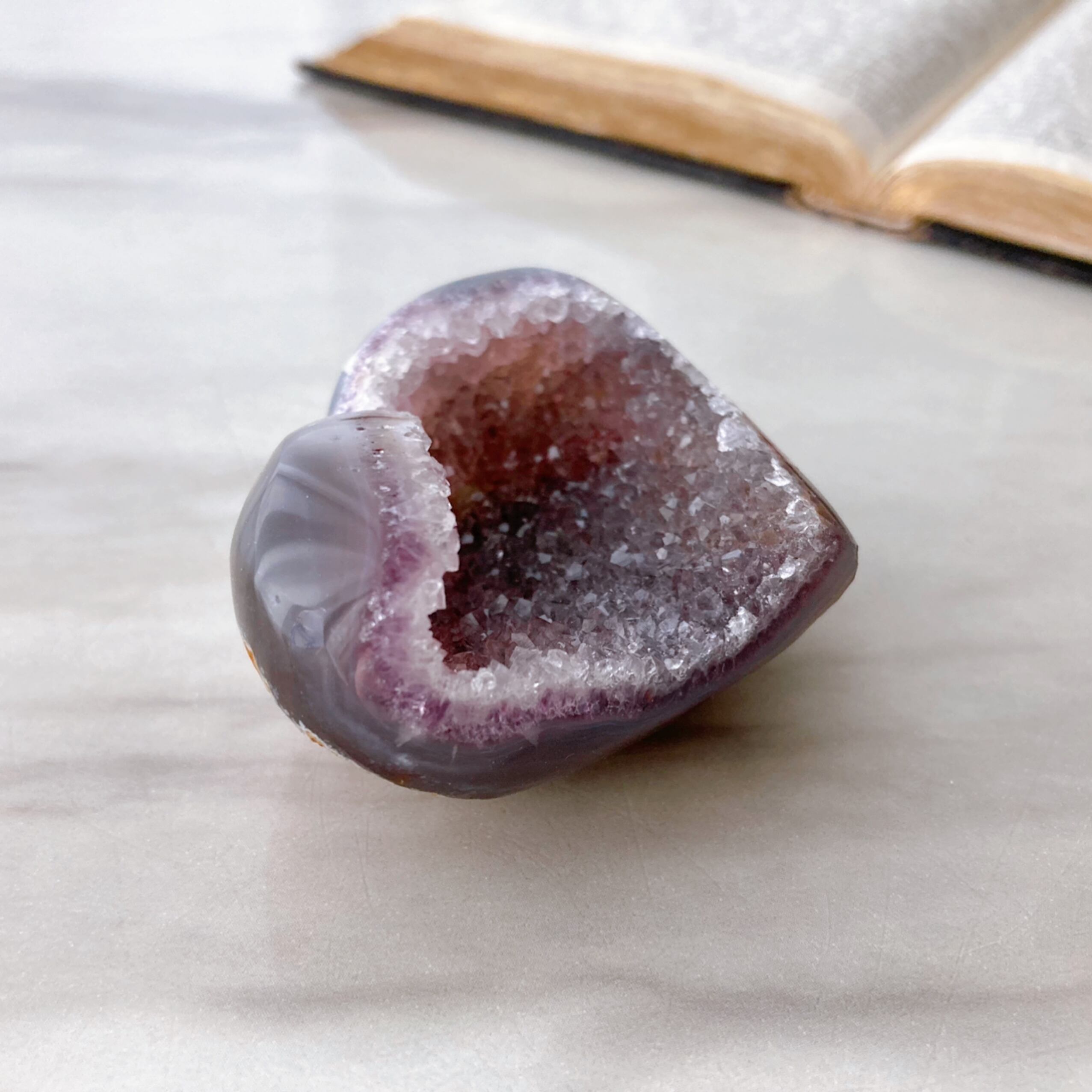 ハート形のラベンダーアメジスト・アゲート・クラスターです。ピアスなどのアクセサリーや天然石の浄化にお使いいただけます。ラベンダーカラーと側面の縞模様、アゲートジオードの原石っぽい感じも素敵です。