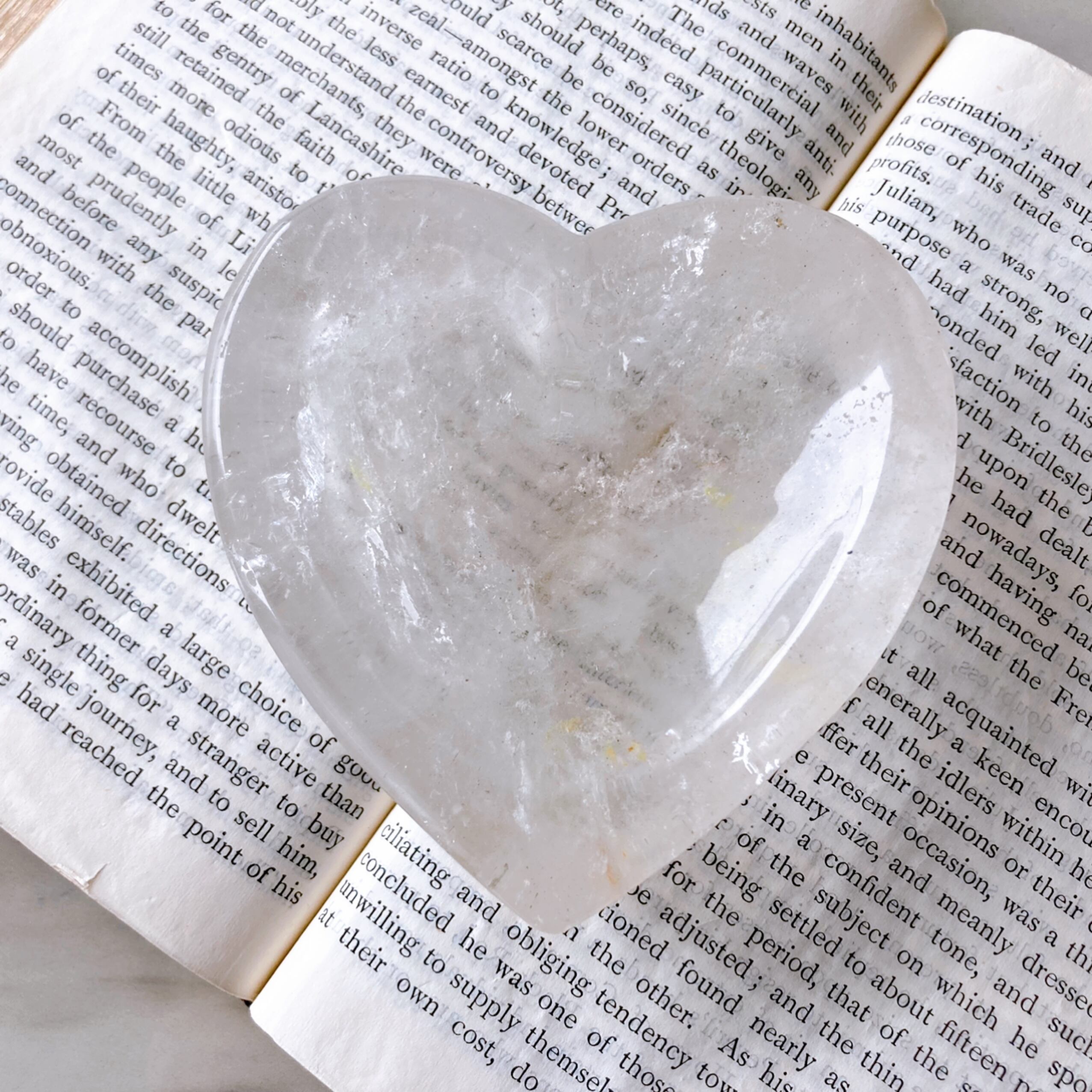 クリアクォーツのハート型トレイです。アクセサリーや天然石の浄化など、使い方は自由自在です。虹も見られます。