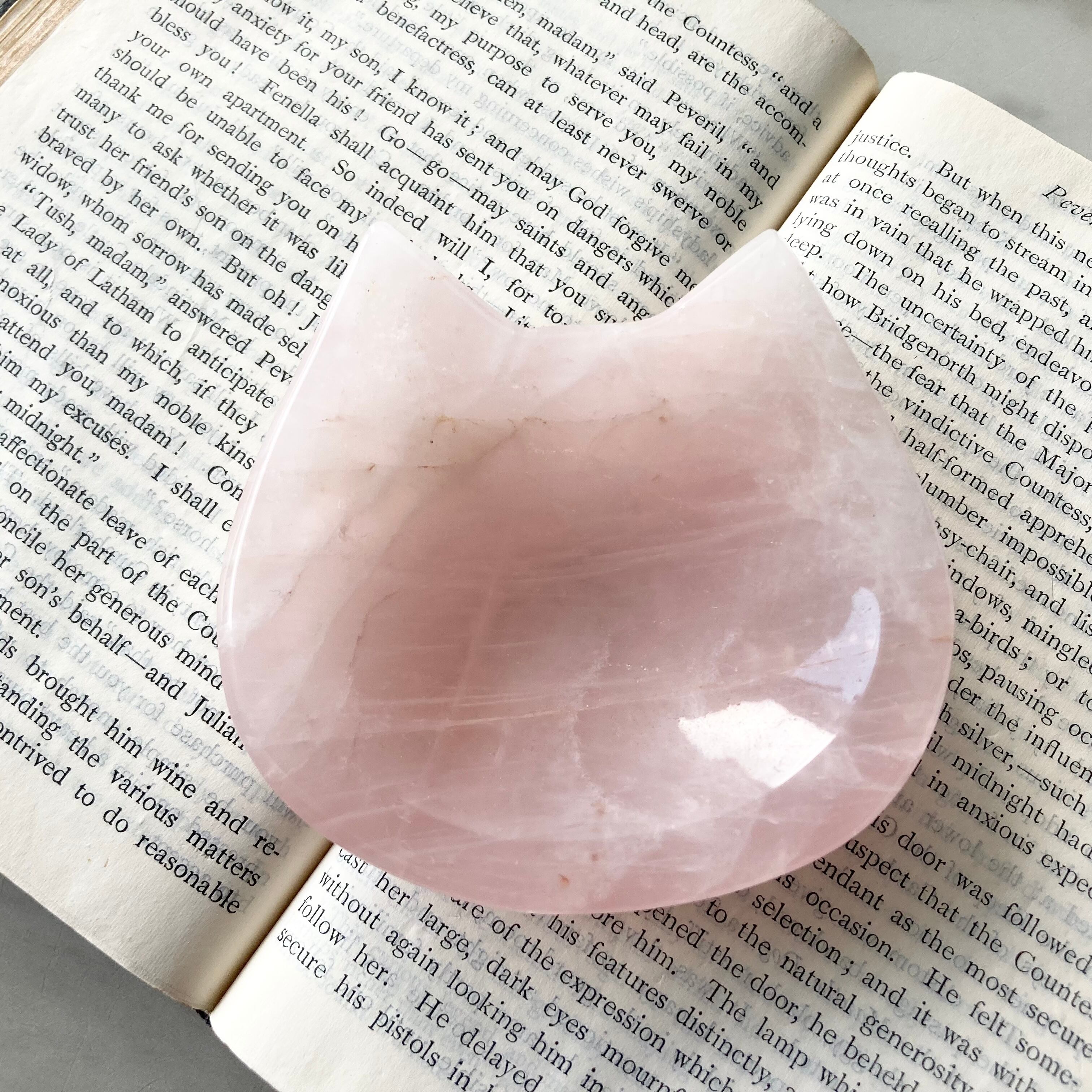 ねこの形が可愛い、ローズクォーツのトレイです。アクセサリーや天然石の浄化など、使い方は自由自在です。