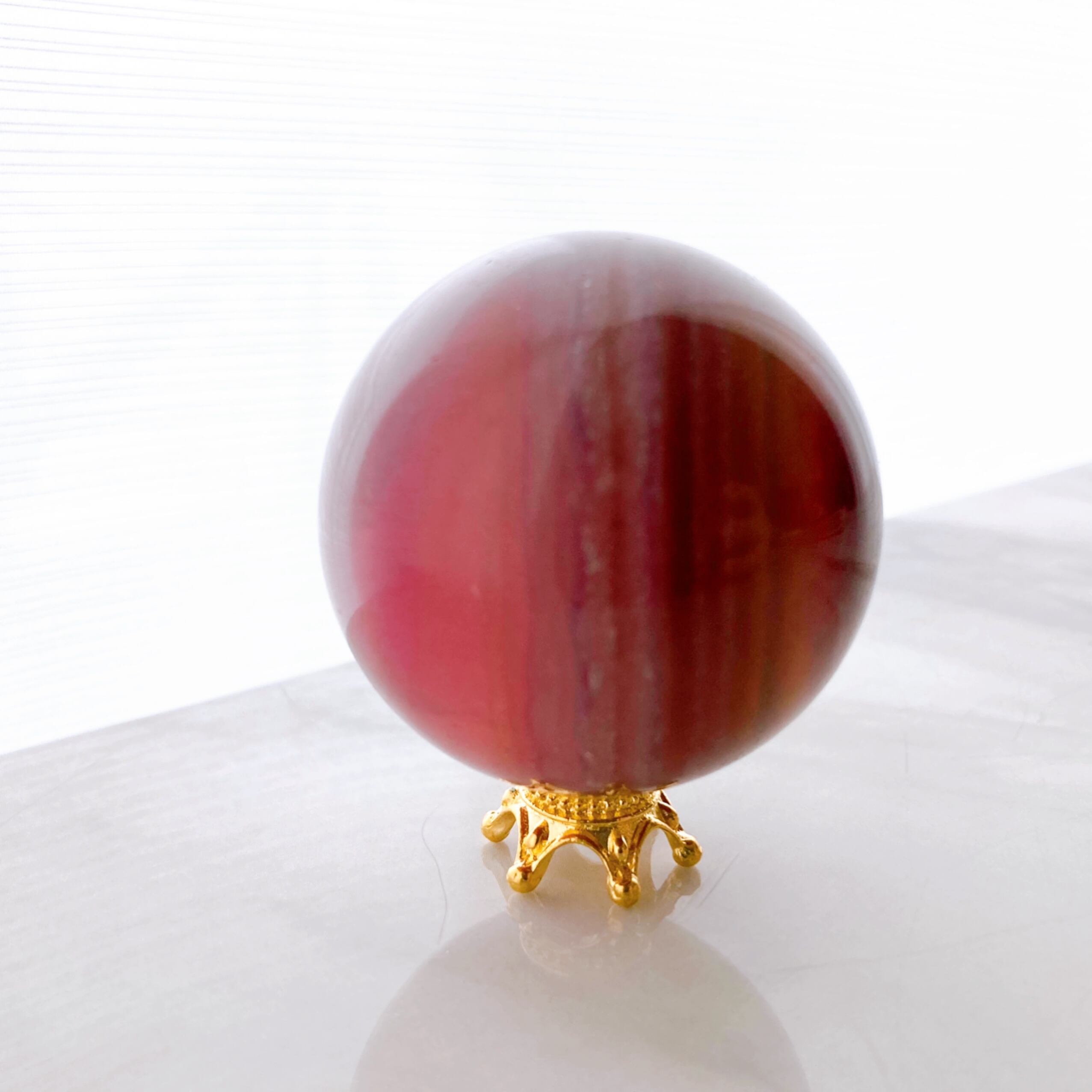 赤ワインのような深みのあるレッドパープルと、明るいマゼンダピンクの色合いが素敵なフローライトのスフィアです。王冠のスフィアスタンド付きです。