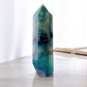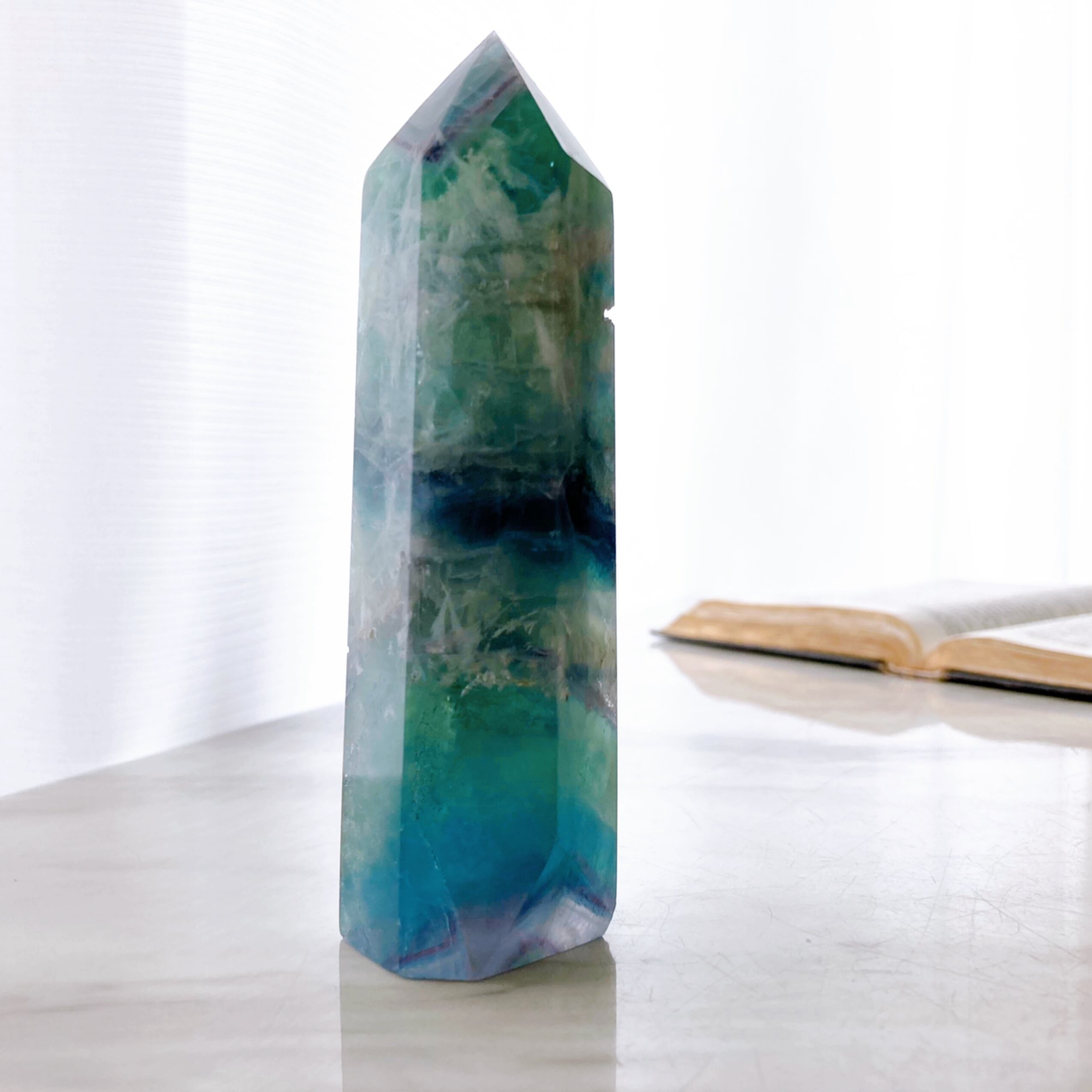 ブルー、グリーン、パープルの色合いが素敵なエンジェルフェザーフローライトタワーです。レインボーもキレイです。
